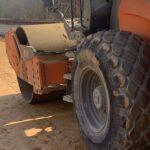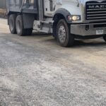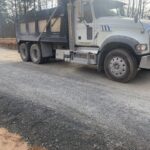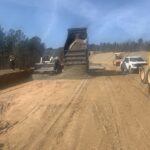 Observing loaded trucks with 18 tons backing across previous placed base stone