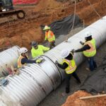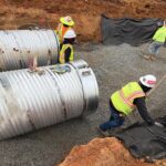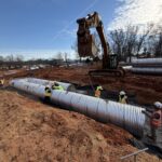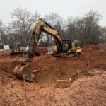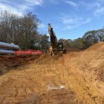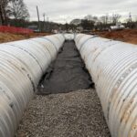 As requested, the site was visited by our AS Engineering and Consulting (ASEC) representative for the purpose of providing quality control inspection and testing services. Visual observation techniques were employed to verify compliance with project drawing/specifications, applicable codes, and materials submittals . The following observations were observed on site this day. <p data-start="303" data-end="815">Work began at Pond 2 with the excavation of the stormwater detention trench. The crew excavated the area to an approximate depth of 6–7 feet and a length of 90 lineal feet, following the project design drawings. Excavation was carried out using a CAT hydraulic excavator, and the trench walls and base were shaped to the required lines and grades.</p> <p data-start="817" data-end="1250">Following subgrade preparation, the crew installed a non-woven geotextile fabric across the entire trench footprint. This fabric serves as a separation and filtration layer, preventing fine soils from migrating into the stone bedding. After placing the fabric, a gravel bedding layer was placed and uniformly graded.</p> <p data-start="1252" data-end="1782">The crew then continued installing the Underground Stormwater Detention System (USDS). Large 36-inch diameter corrugated metal pipes (CMPs), each approximately 20 feet in length, were placed on the stone base.</p> <p data-start="1784" data-end="2095">Two parallel detention pipes were installed side-by-side, with an approximately 3-foot gap between them as required for stone coverage and structural spacing. The crew connected CMP sections to achieve a combined installed length of approximately 78 feet during today’s work operations.</p> <p data-start="2097" data-end="2492">After pipe placement, the geotextile fabric was pulled up along the trench walls and partially wrapped around the pipes, helping to contain the gravel and prevent sediment infiltration.</p> <p data-start="2494" data-end="2639">Work proceeded safely and according to specifications, with proper equipment usage and crew coordination throughout the installation process.</p> <p data-start="2494" data-end="2639">We appreciate the opportunity to be of service to you on this project. If you have any questions regarding this report, please feel free to contact us. We will be more than happy to discuss it with you.</p>