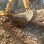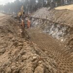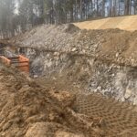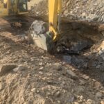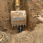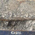 Excavated sewer trench showing hard rock full depth of trench excavation.