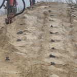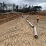 Matting and grass seeding at pond slope embankment