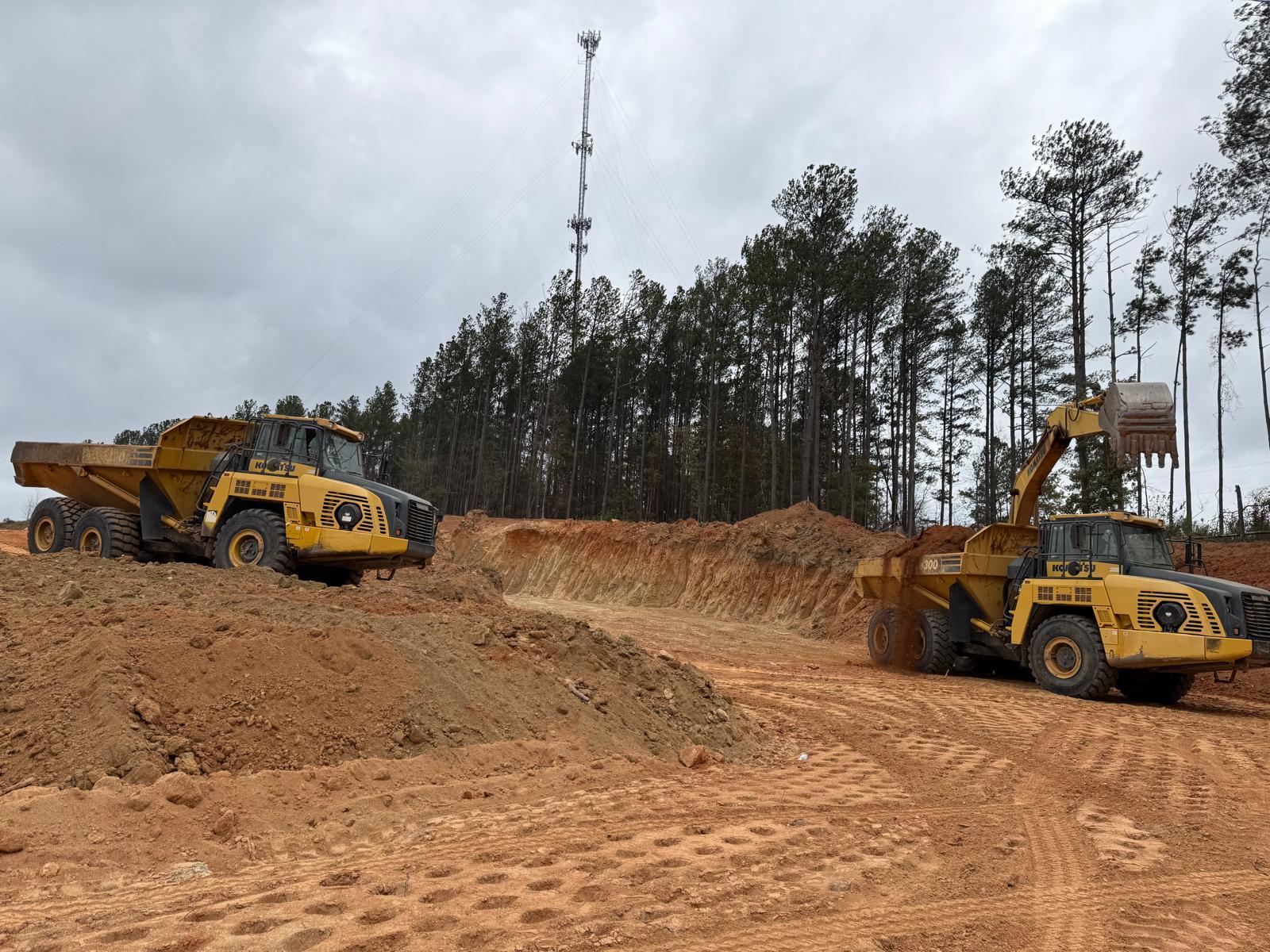 • Upon arrival, the contractor was engaged in removing the stacked dirt near the Pickle ball court parking and on the roadway using a Komatsu PC 360LC and cut from the west of the job site. Dirt was being transported with two tandem dumps on tennis Court and parking, while dozing and leveling were performed with a Komatsu D85EX for the next layer and compaction with CAT563E.