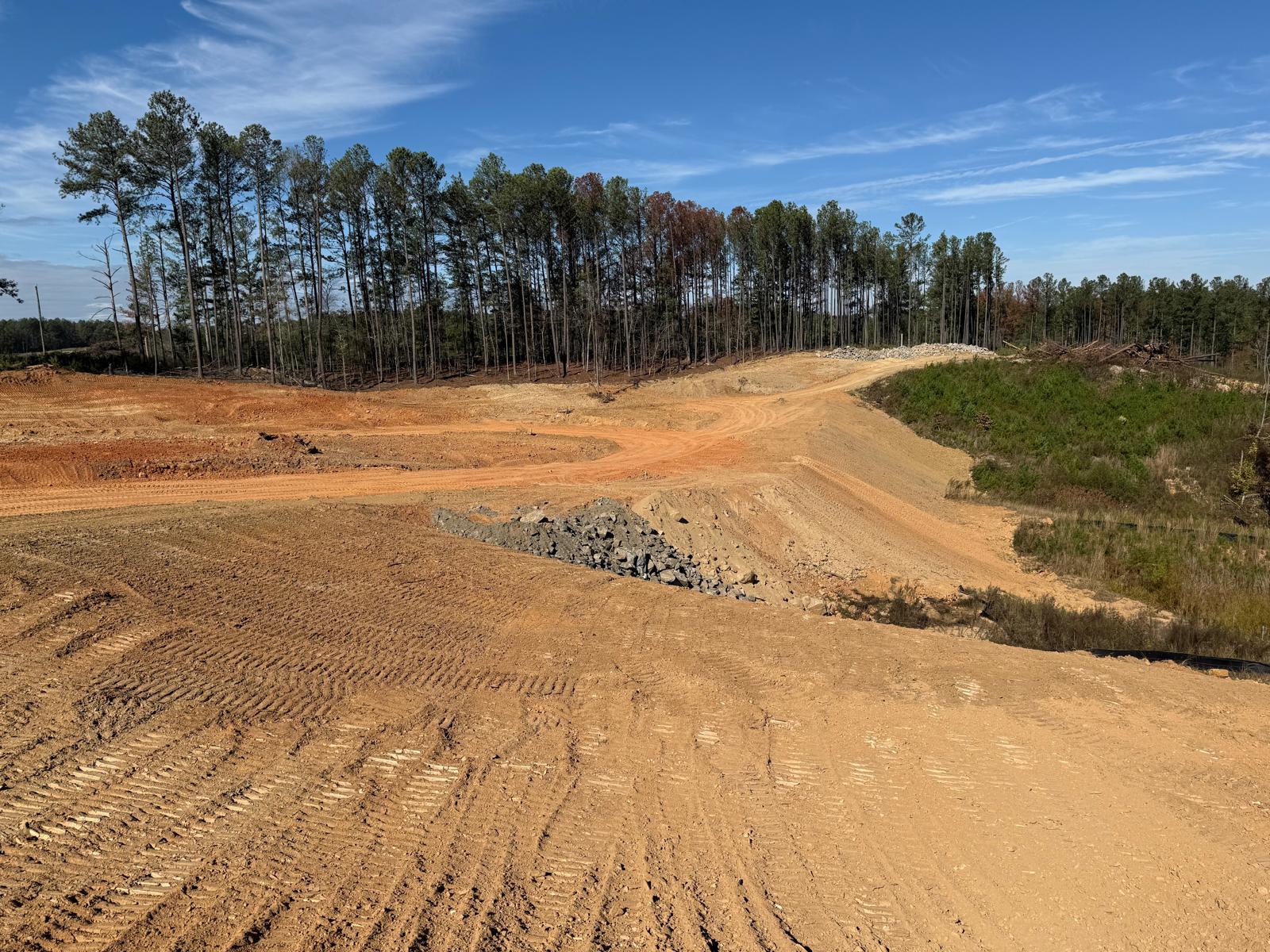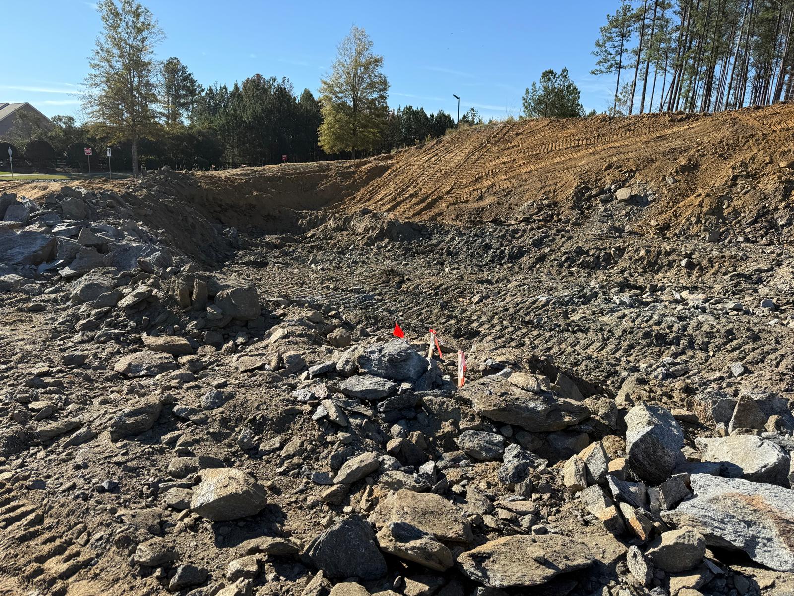 - The next layer of fill placement continued today along with the breaking of rock boulders with a Deere 350GL. Boulder pieces are being placed along the slopes.
