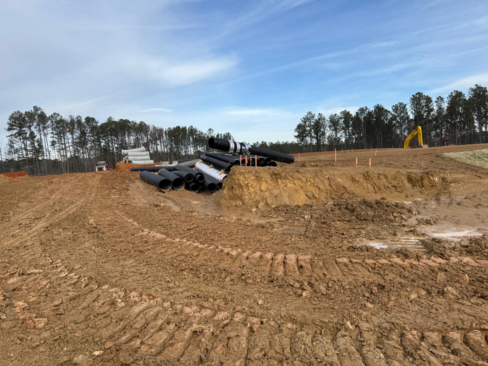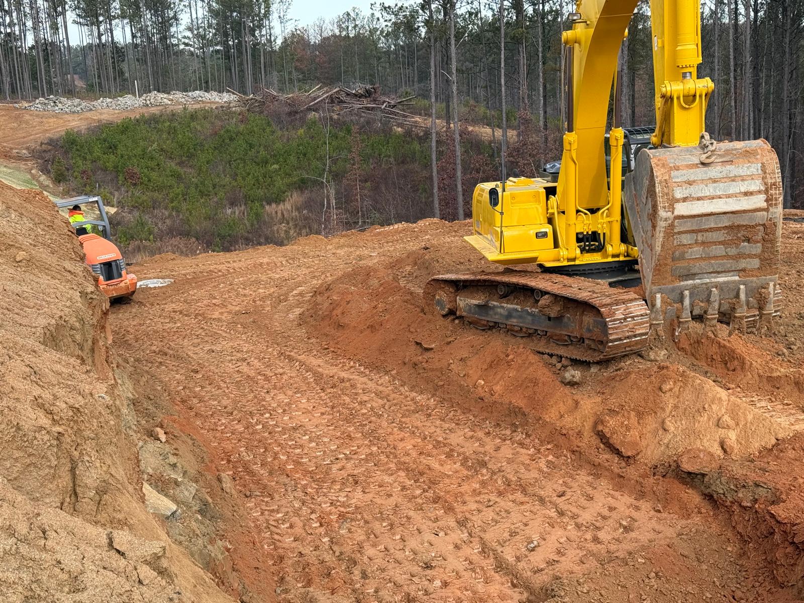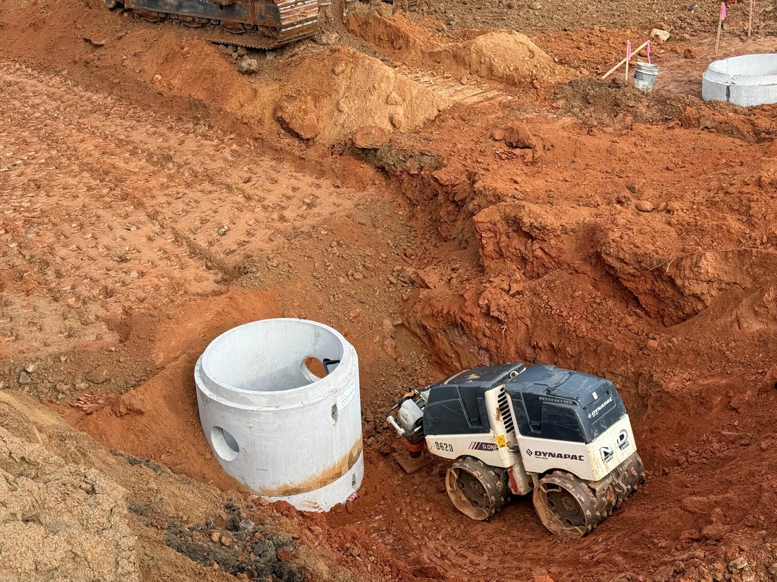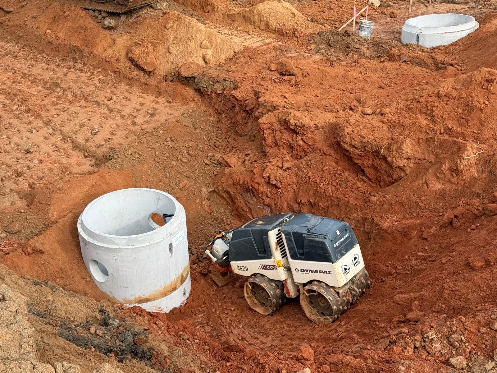 Savannah Pipeline Company has initiated the installation of stormwater lines at the amenities job site, located between the clubhouse and tennis court area. Excavation work is being carried out using the Kobelco SK350LC excavator. Compaction efforts are being executed with a Hamm Shoe Toe compactor and a remote-controlled compactor.
