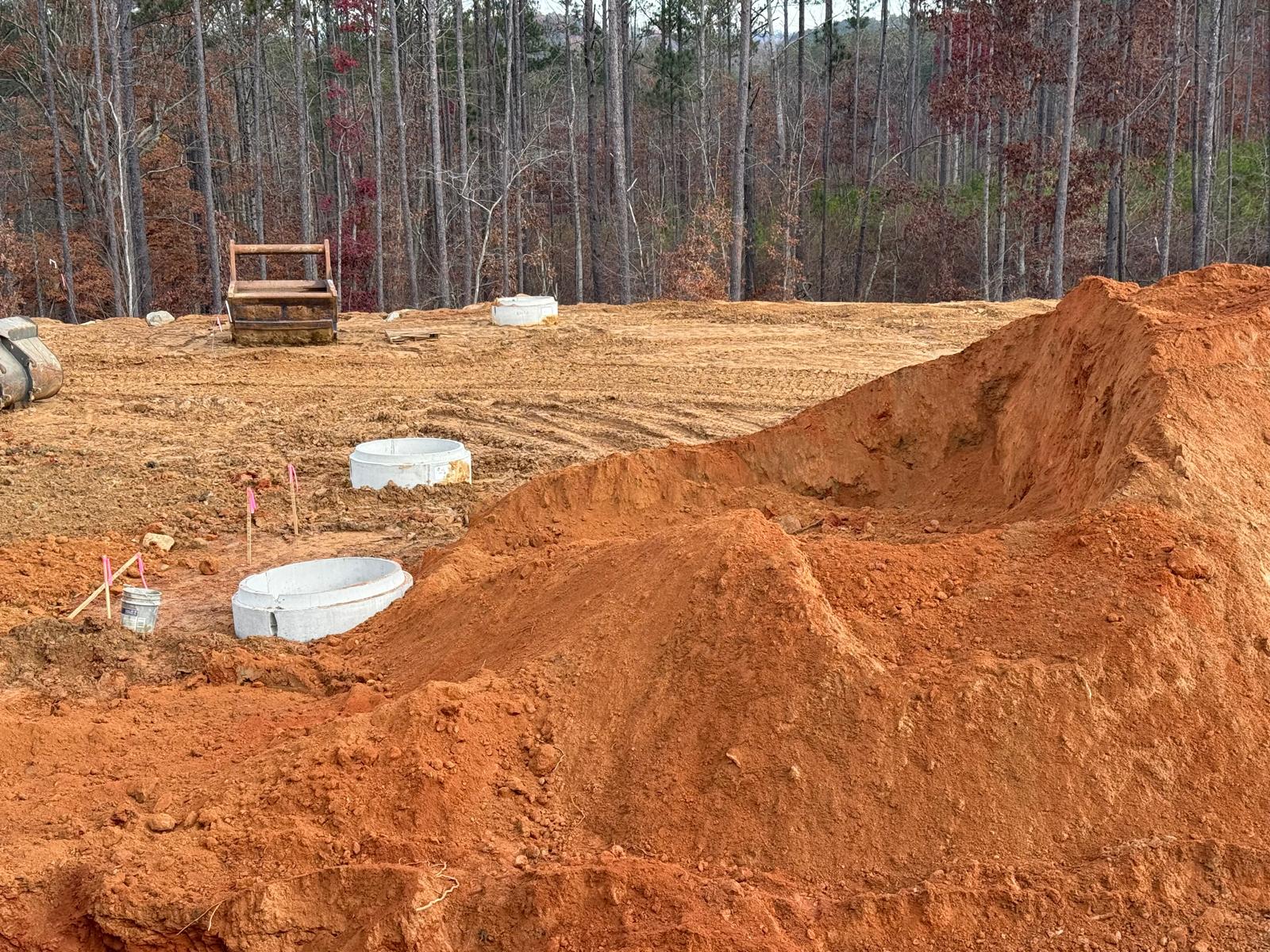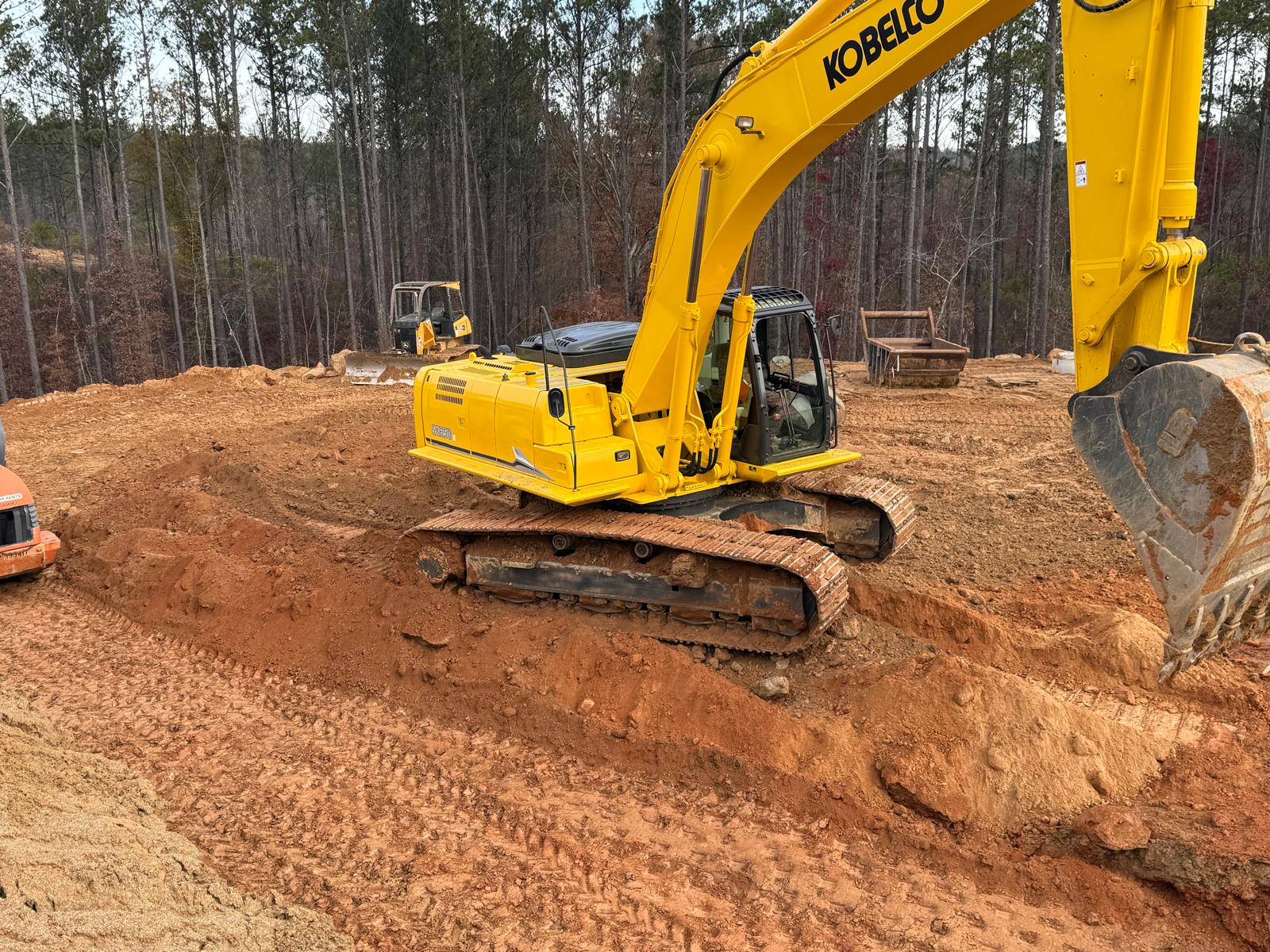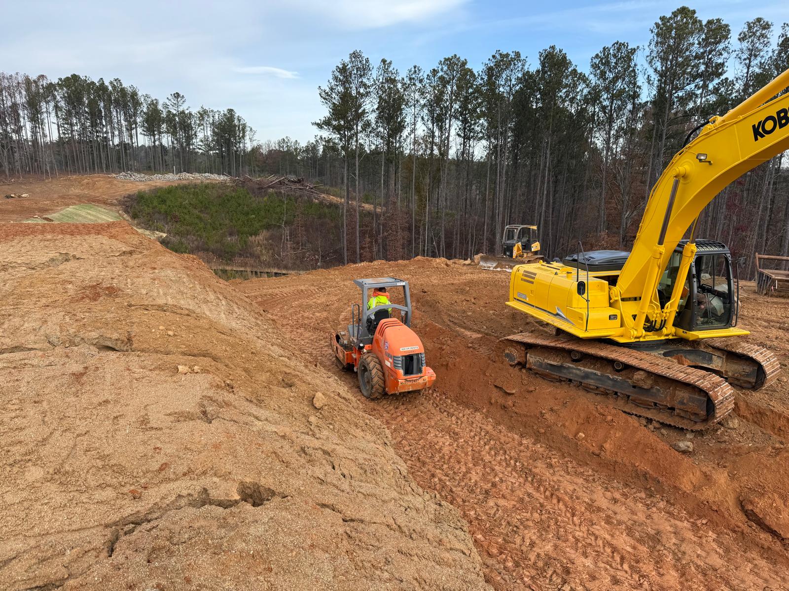 Savannah Pipeline Company has initiated the installation of stormwater lines at the amenities job site, located between the clubhouse and tennis court area. Excavation work is being carried out using the Kobelco SK350LC excavator. Compaction efforts are being executed with a Hamm Shoe Toe compactor and a remote-controlled compactor.