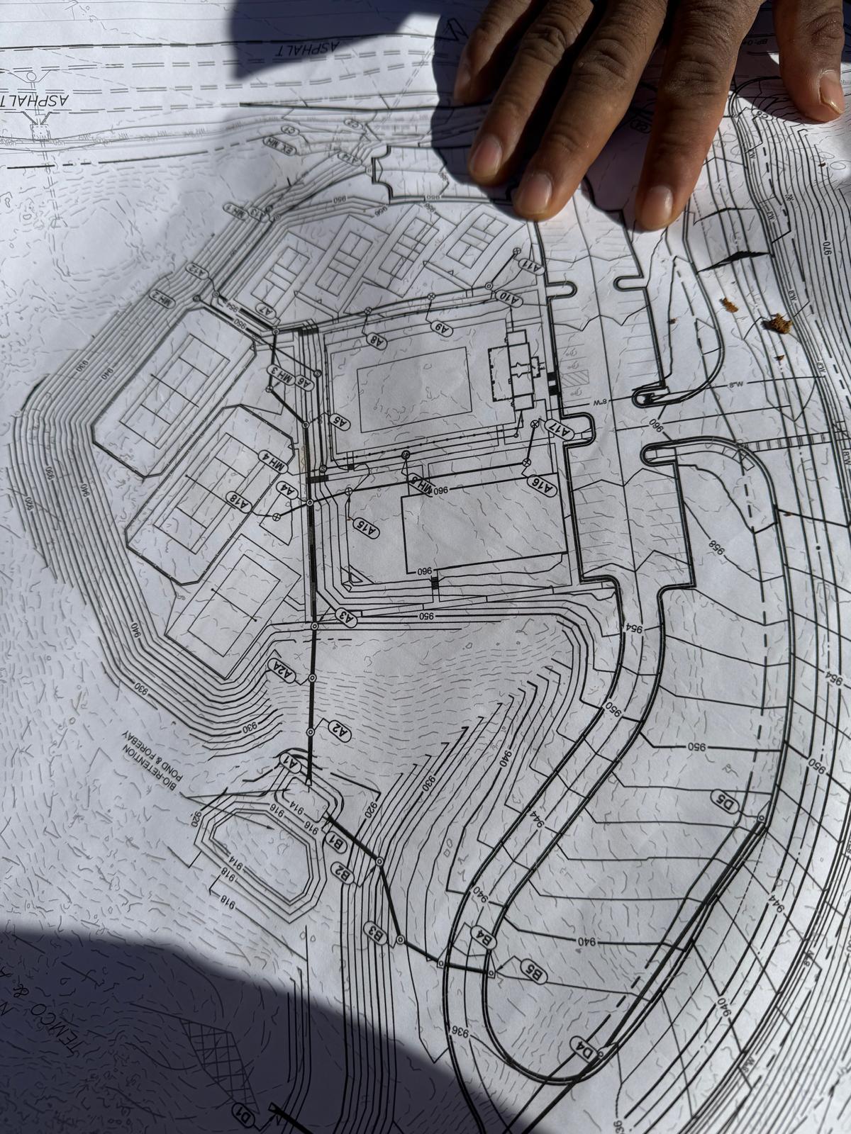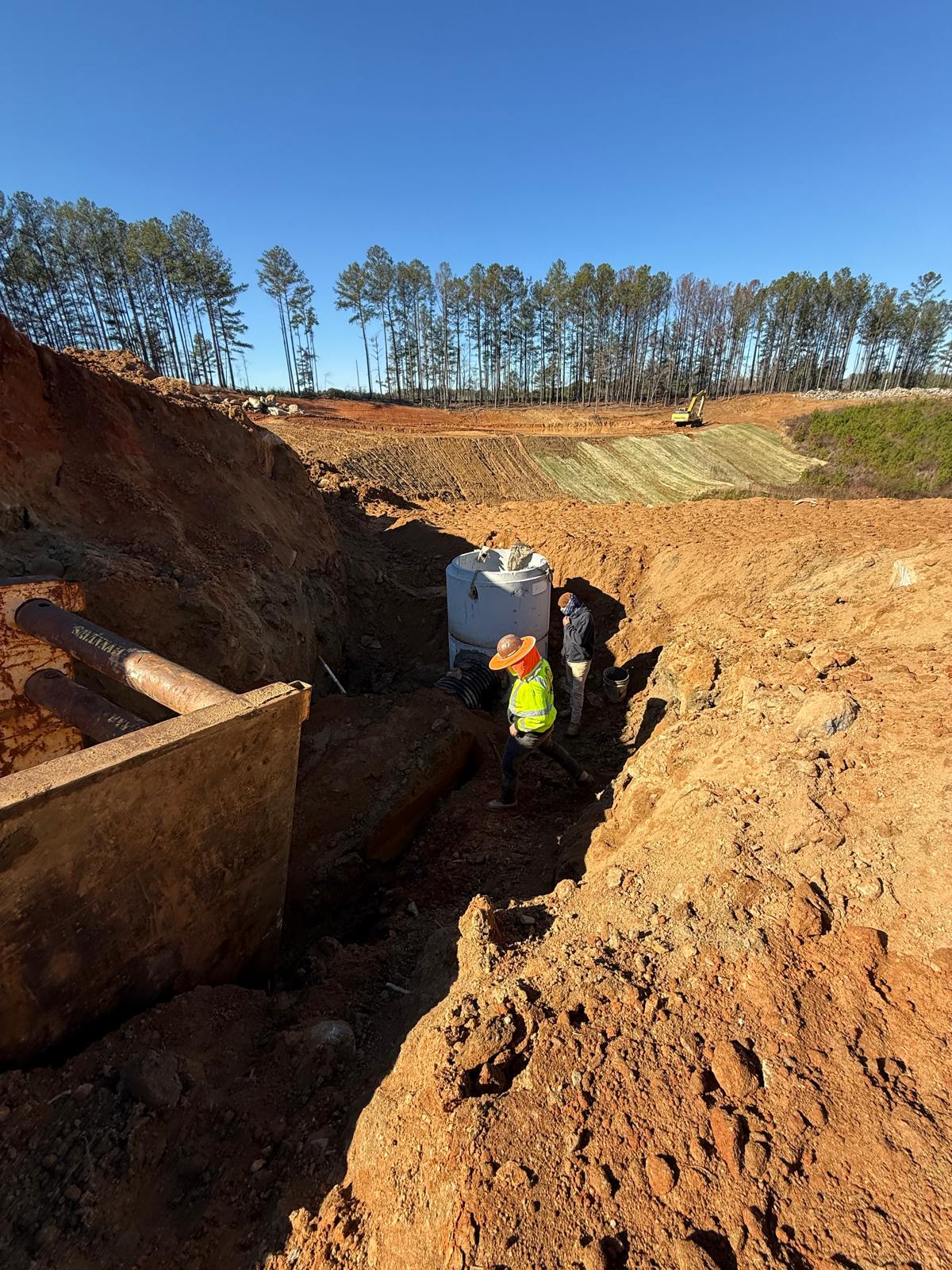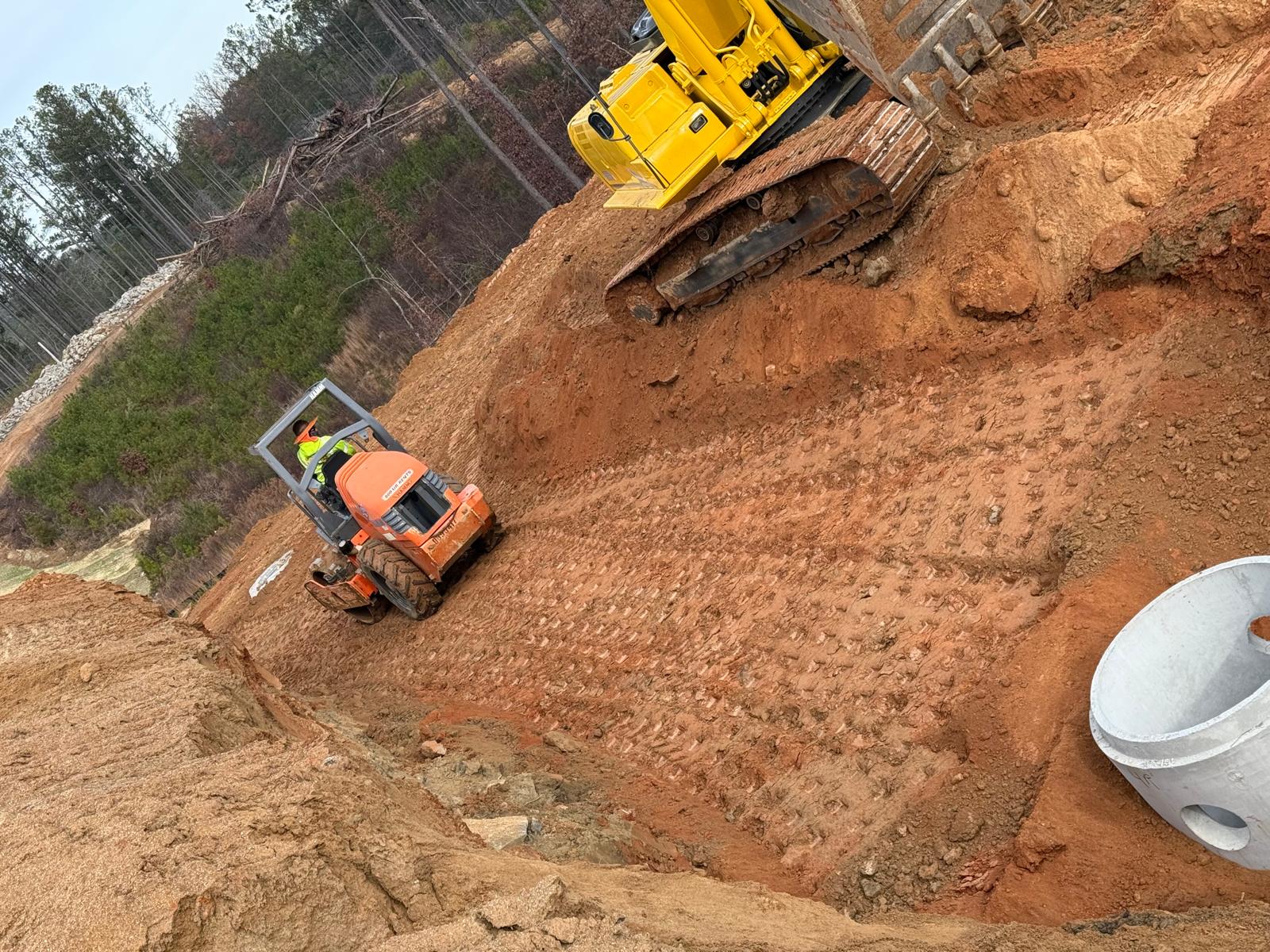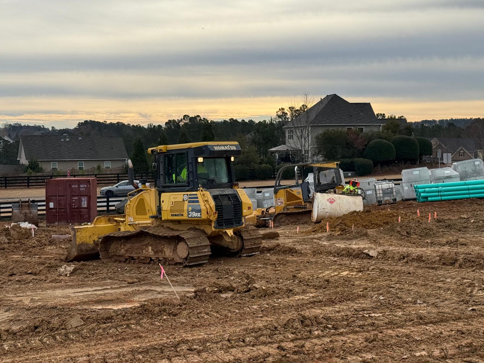 Savannah Pipeline Company has initiated the installation of stormwater lines at the amenities job site, located between the clubhouse and tennis court area. Excavation work is being carried out using the Kobelco SK350LC excavator. Compaction efforts are being executed with a Hamm Shoe Toe compactor and a remote-controlled compactor.
