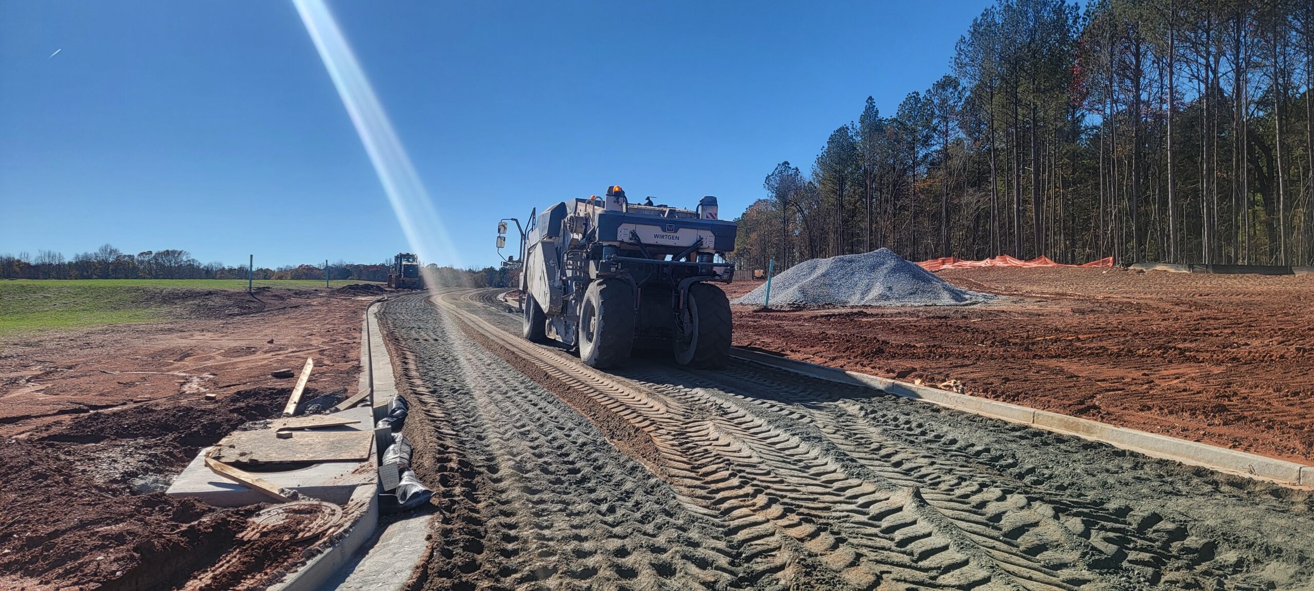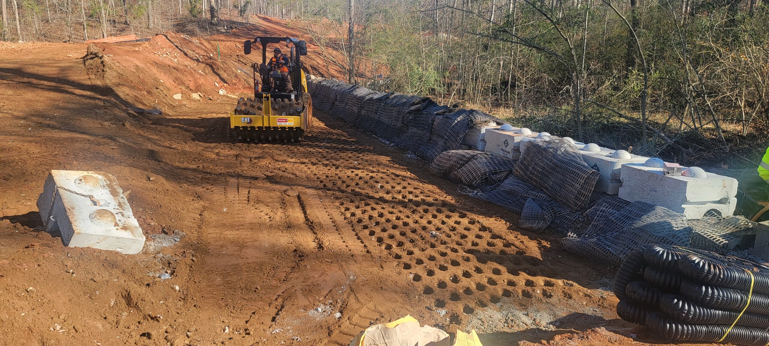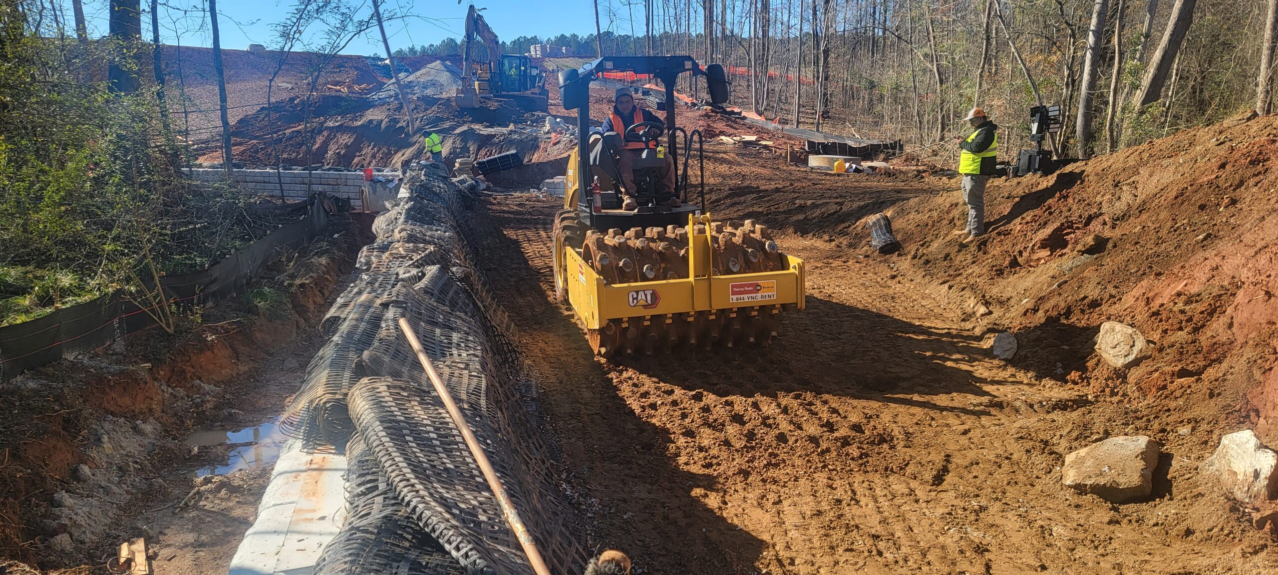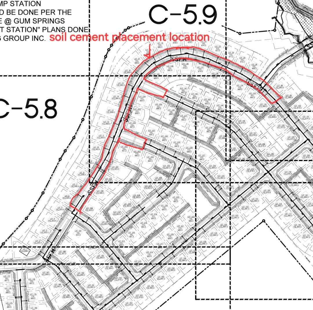 - The placement and compaction of backfill soils for Redi-Rock retaining wall #2 and the placement of soil cement for the roadway (location is shown in the picture by red color) continued this day.