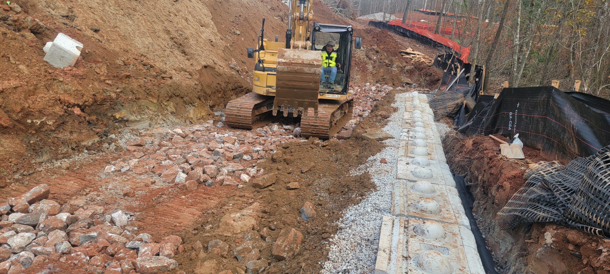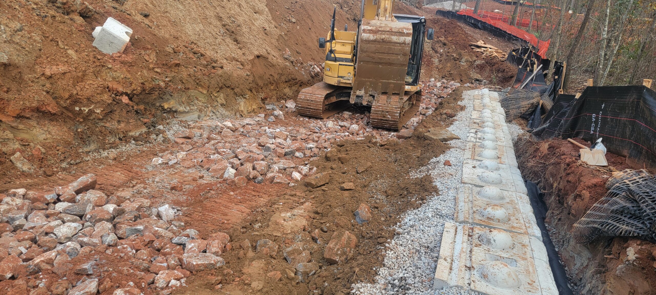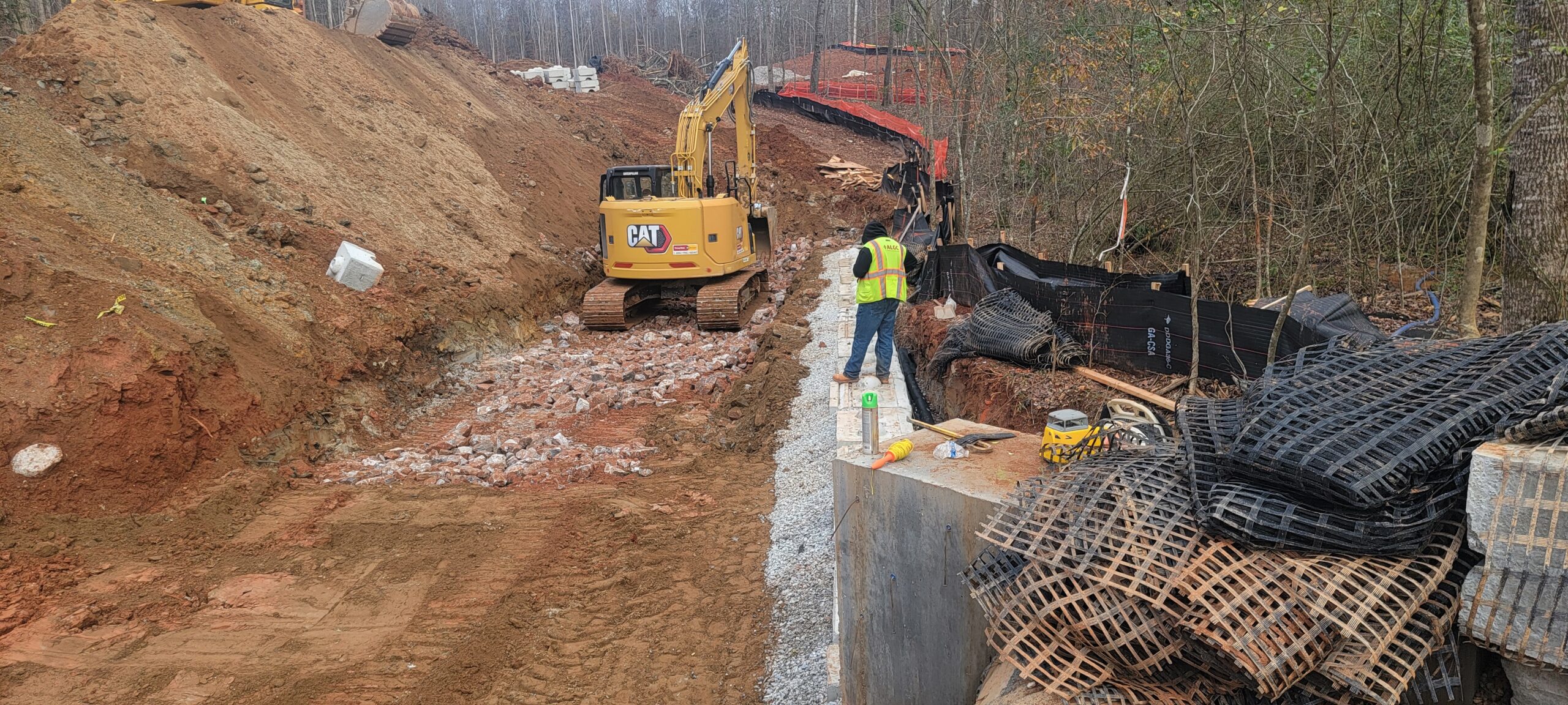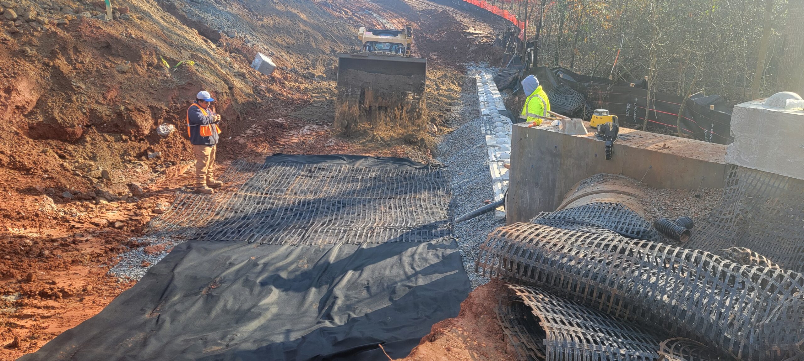 • Retaining Wall #2 Construction: Placement and compaction of riprap and No. 57 stone for stabilization and placement of fabric on the Riprap and backfill at the creek crossing retaining wall #2.