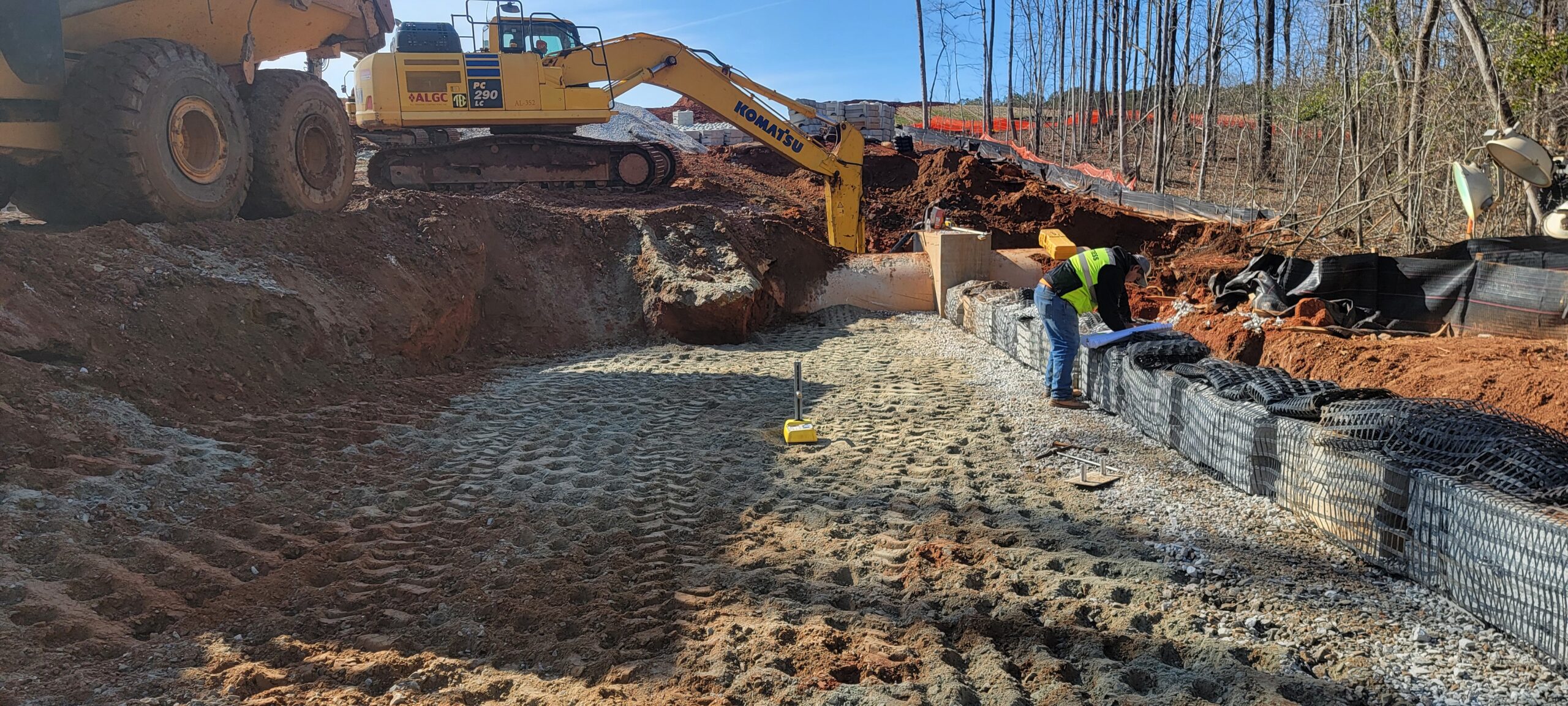 • The placement and compaction of GAB for retaining wall #1 and footing stabilization were in progress.