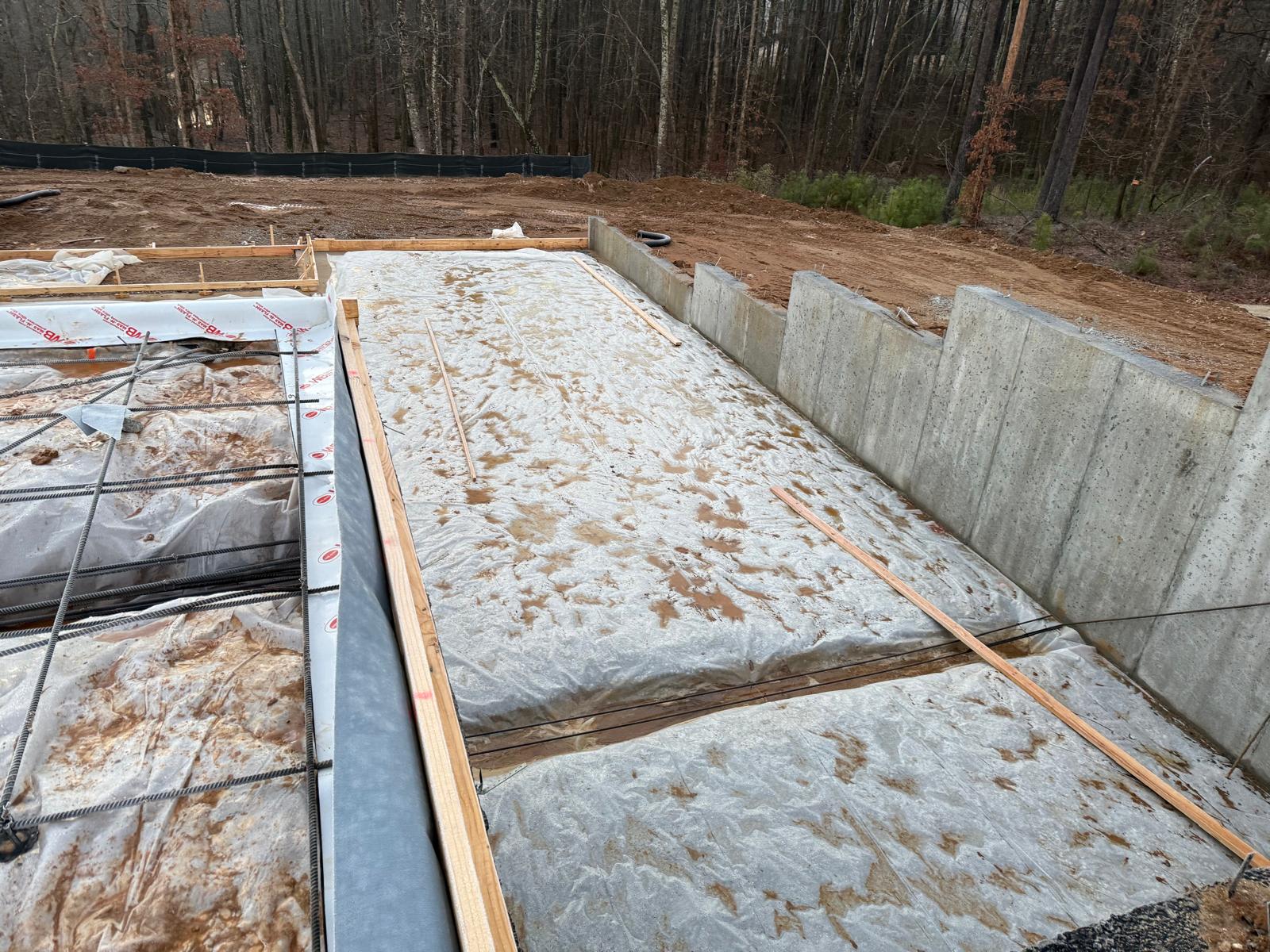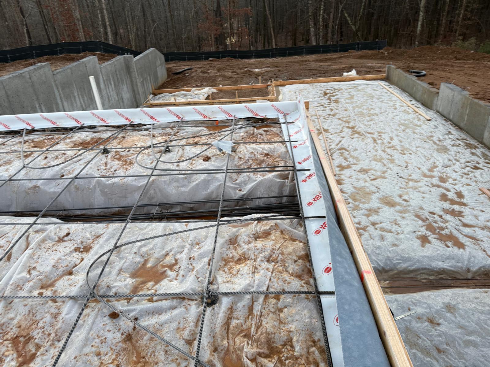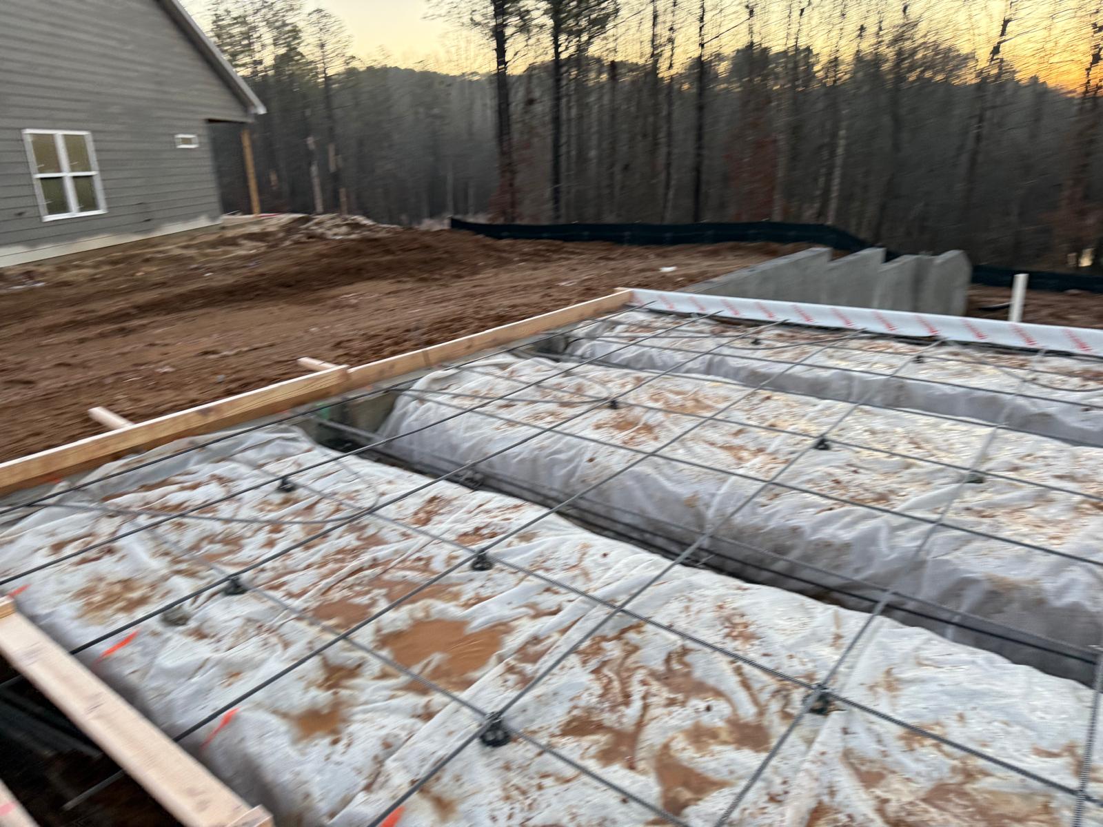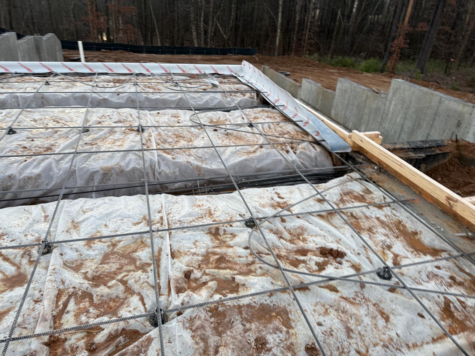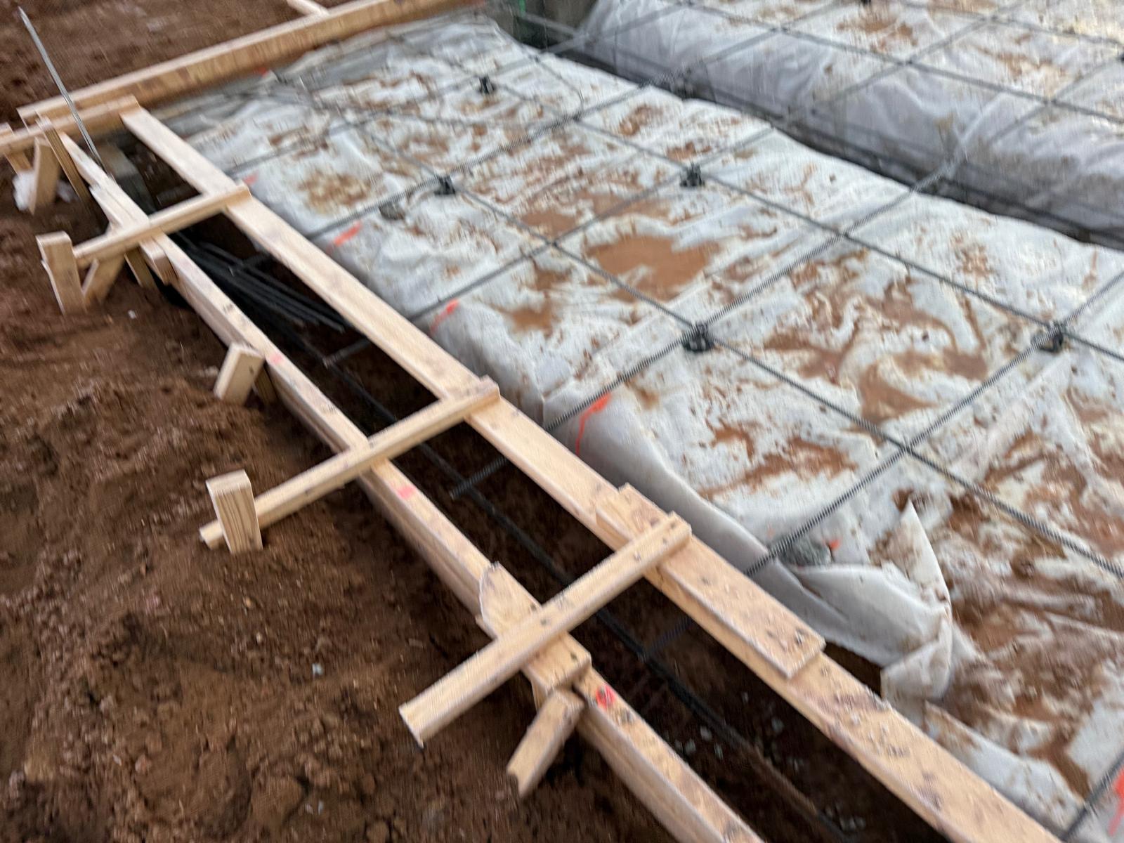 - The basement slab subgrade inspection has been completed, and the reinforcement has been confirmed to meet job specifications for size, spacing and quantity. Plastic sheeting has been laid over the basement floor. During the inspection of the tie beams, ice and mud were observed. Our representative recommended the removal of these deleterious materials prior to the placement of concrete.