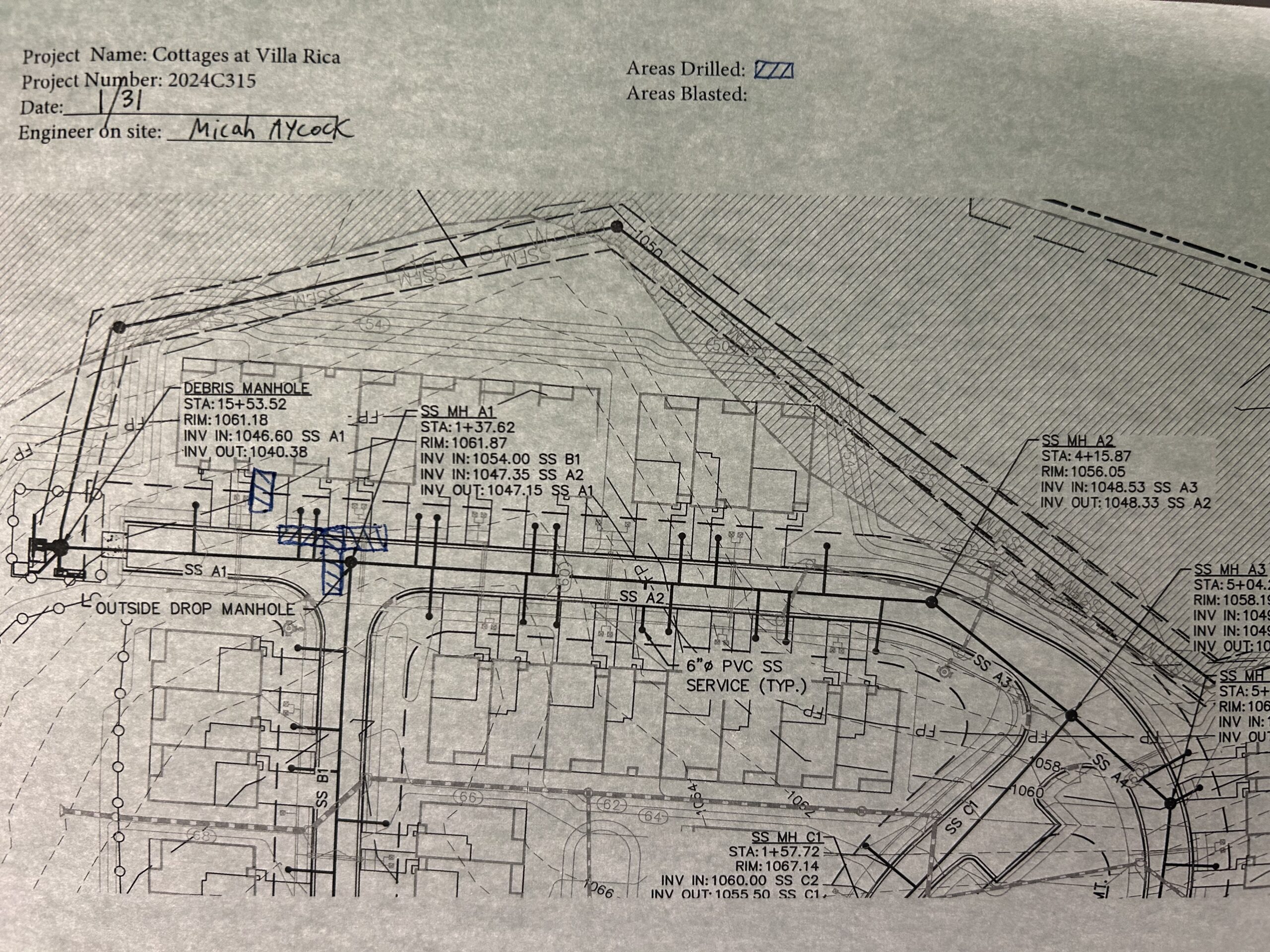 The aforementioned AS Engineering and Consulting (ASEC) representative visited the Cottages at Villa Rica site to monitor drilling and rock removal operations. The contractor performing the work was Precision Blasting. The following observations were made on-site: