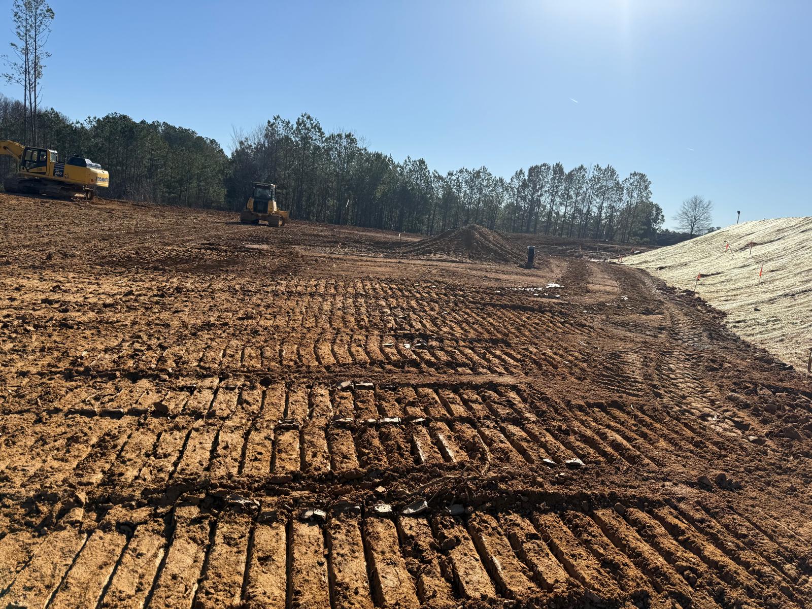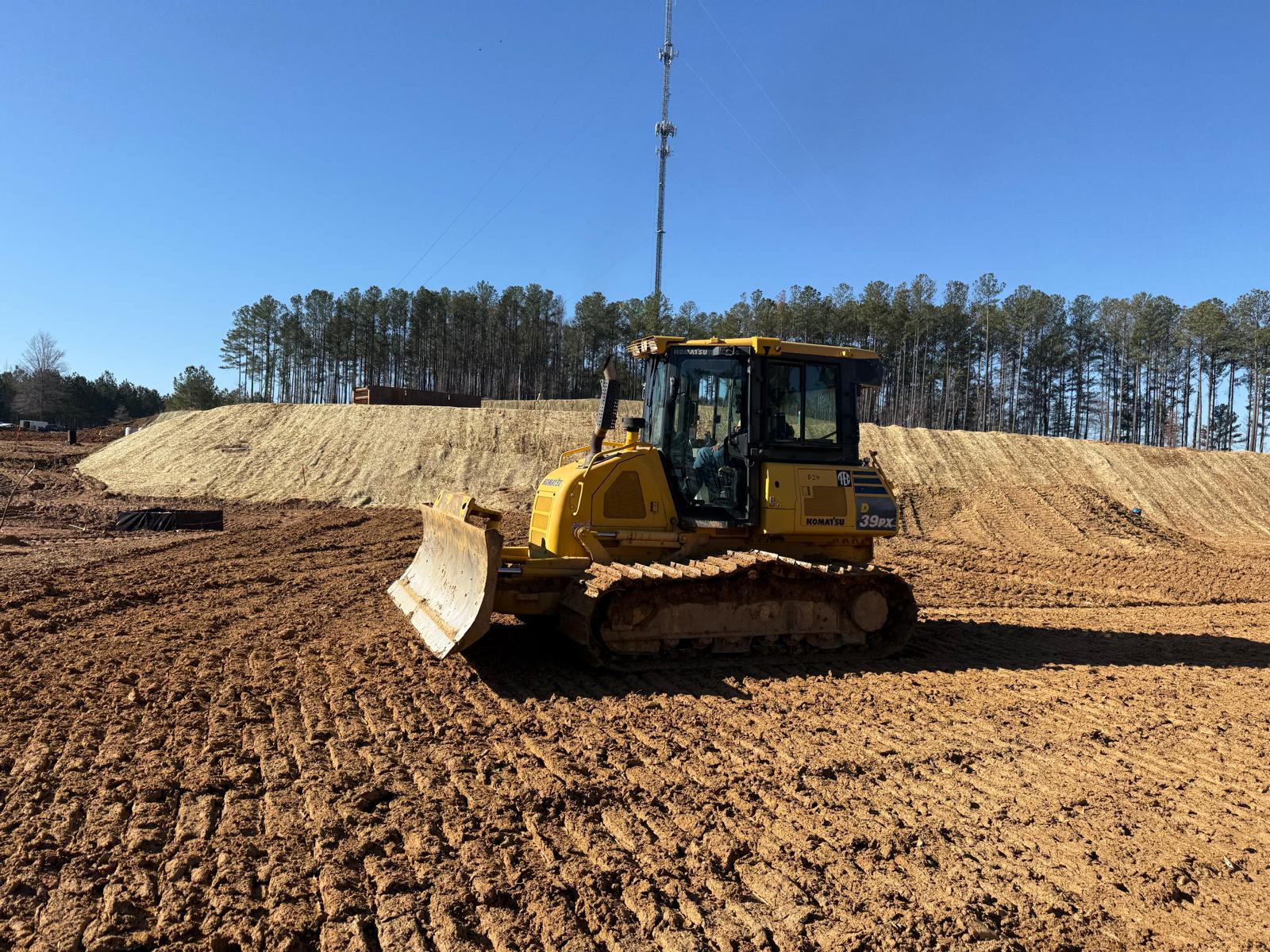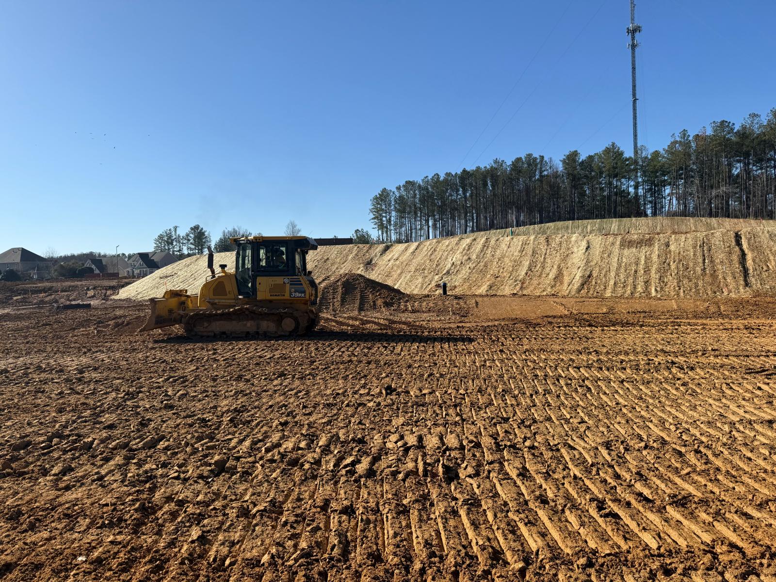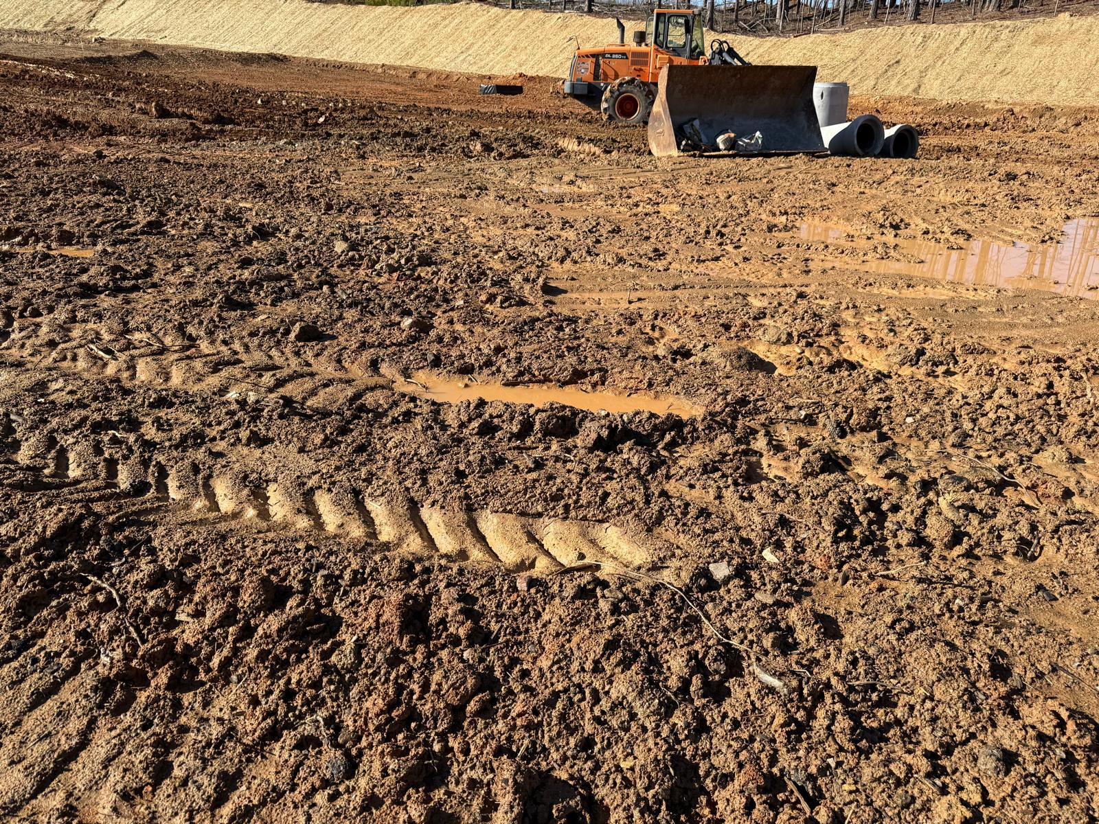 • After the rain from the previous day, the contractor began scarifying and aerating using a Komatsu 39PXi dozer to help move and redistribute the soil, allowing it to dry more quickly. At the same time, they used the Komatsu PC 360LC to fix and adjust the slopes of the site.