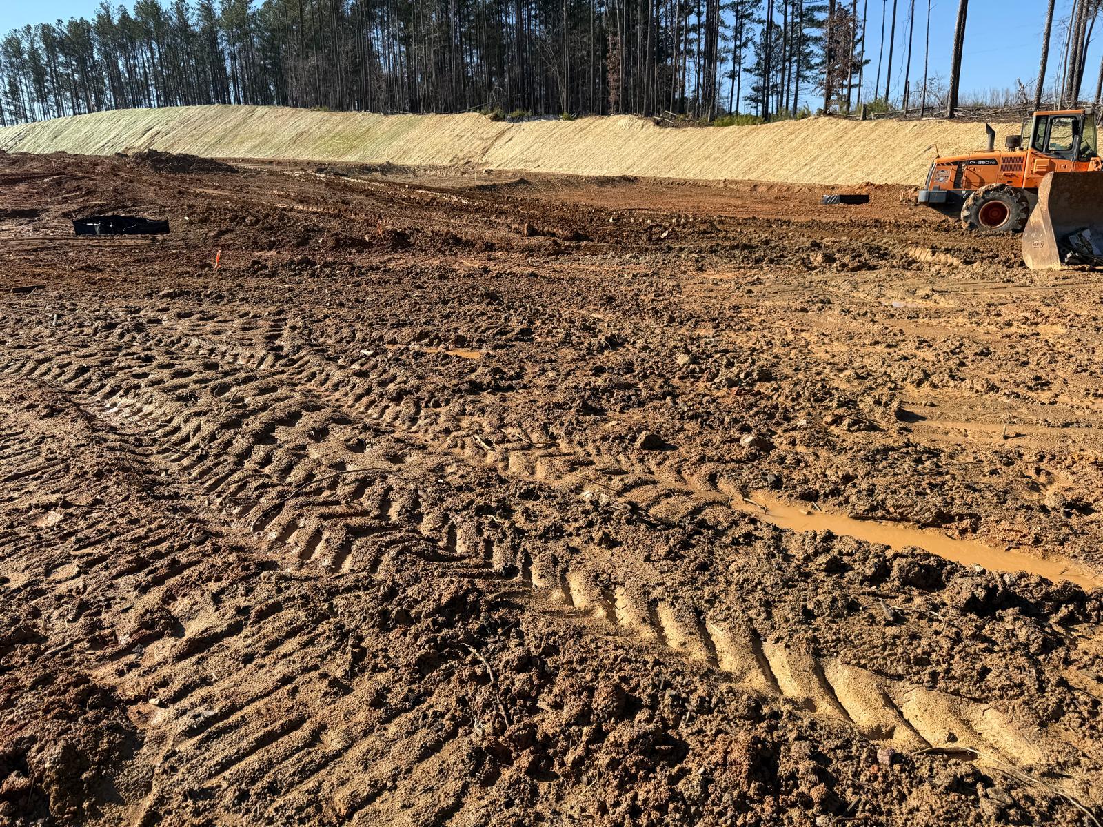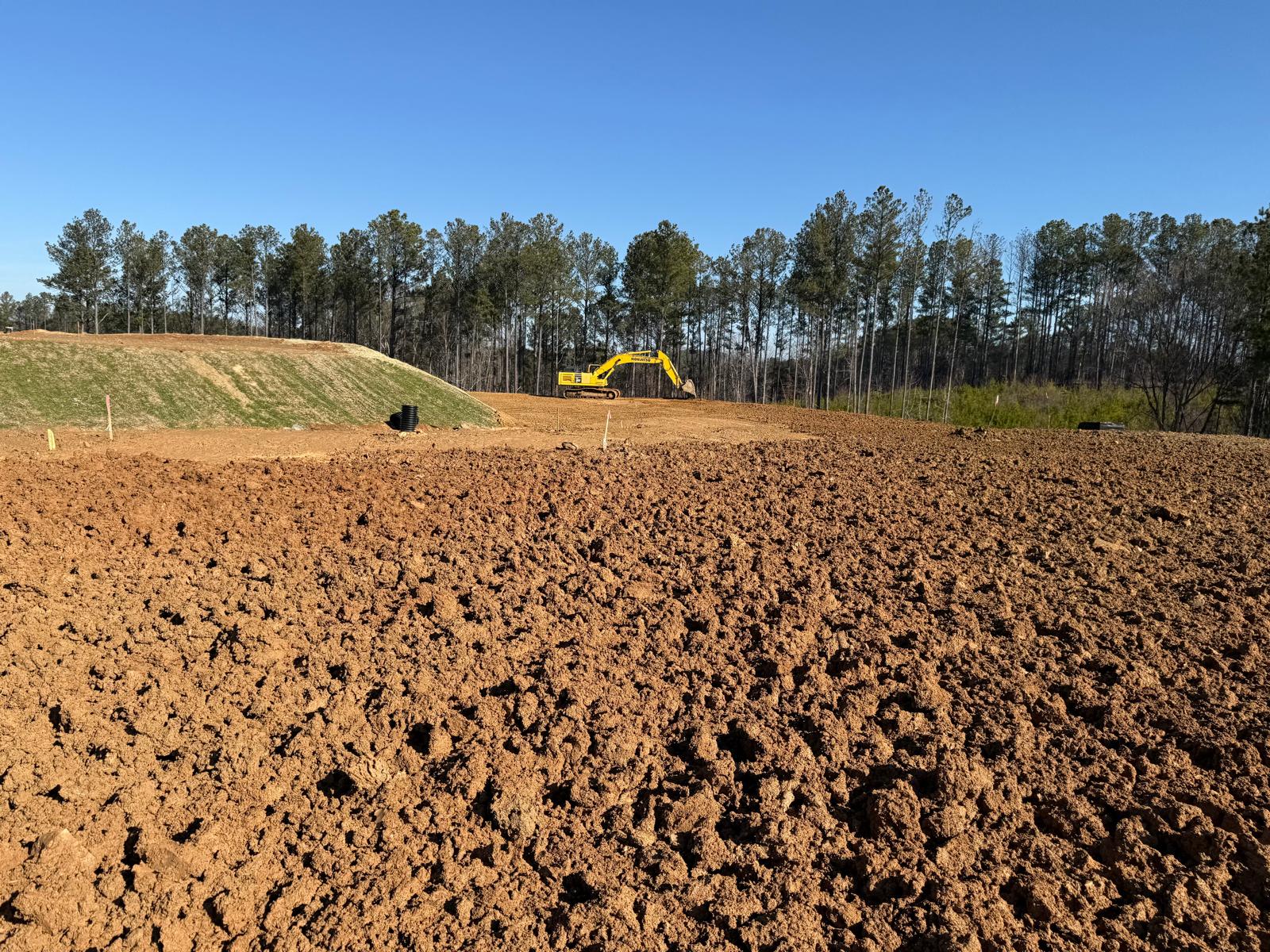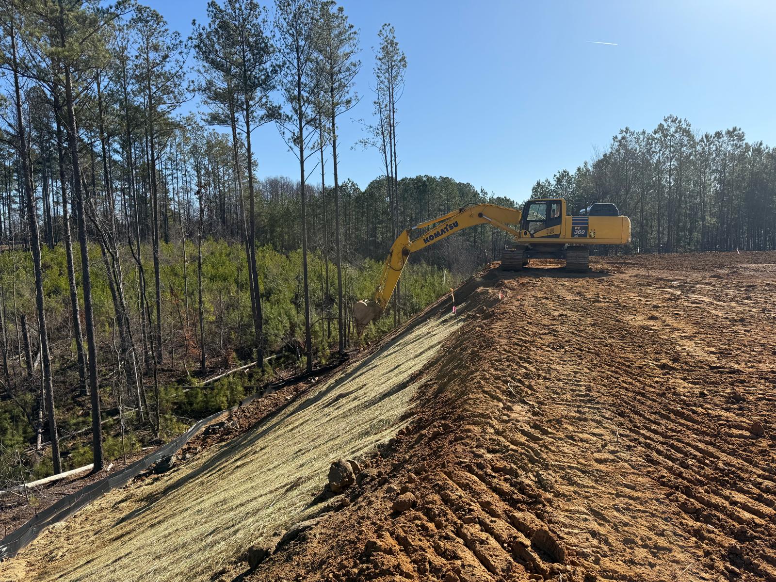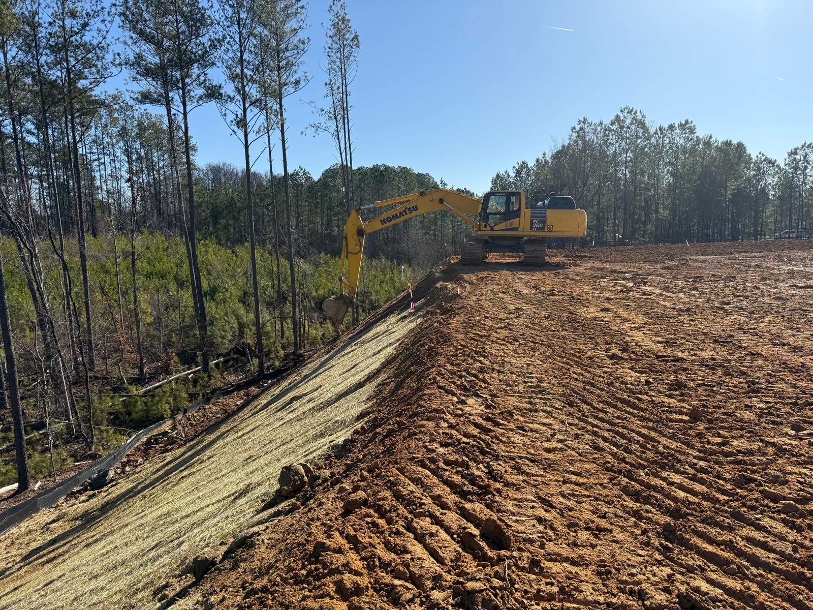 • After the rain from the previous day, the contractor began scarifying and aerating using a Komatsu 39PXi dozer to help move and redistribute the soil, allowing it to dry more quickly. At the same time, they used the Komatsu PC 360LC to fix and adjust the slopes of the site.
