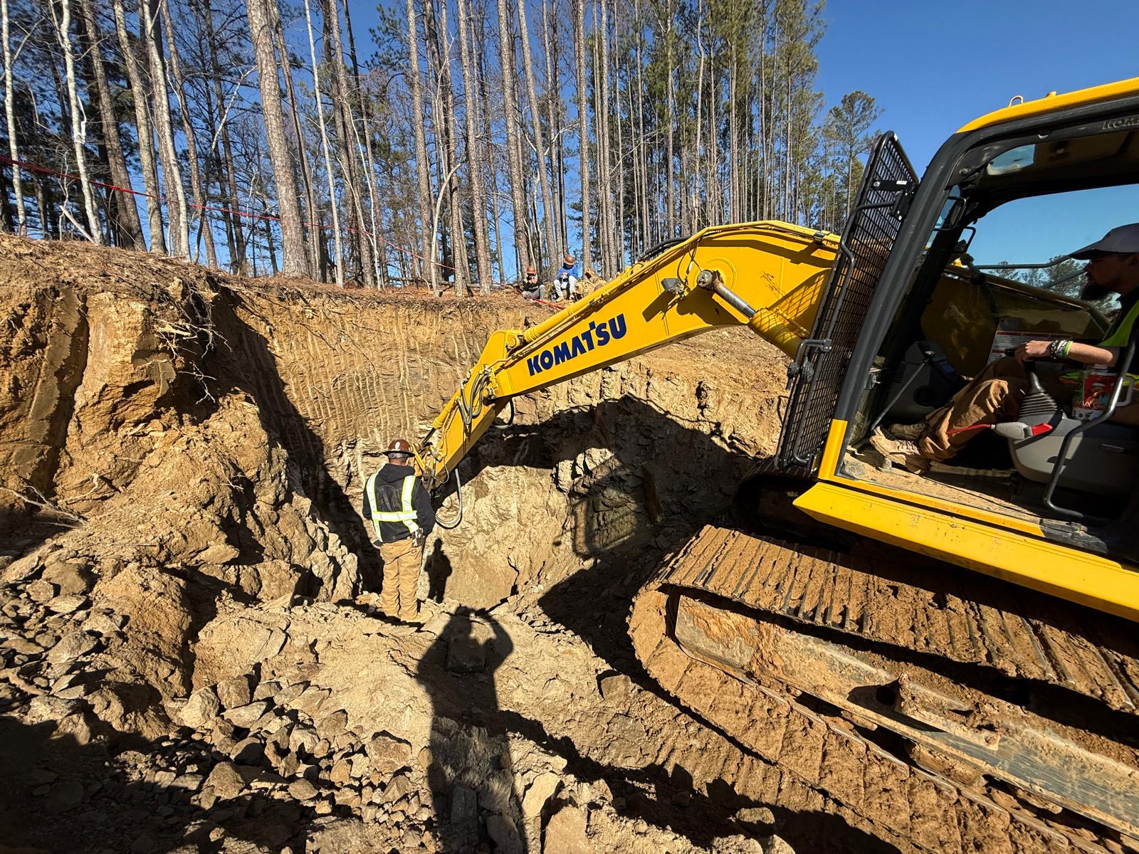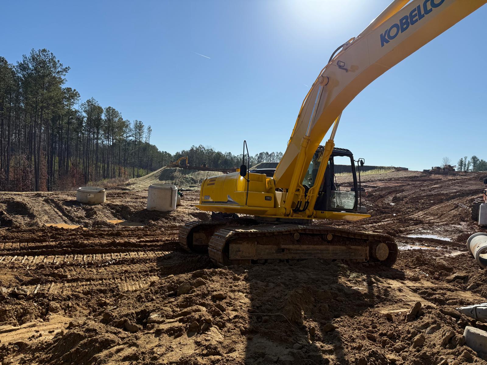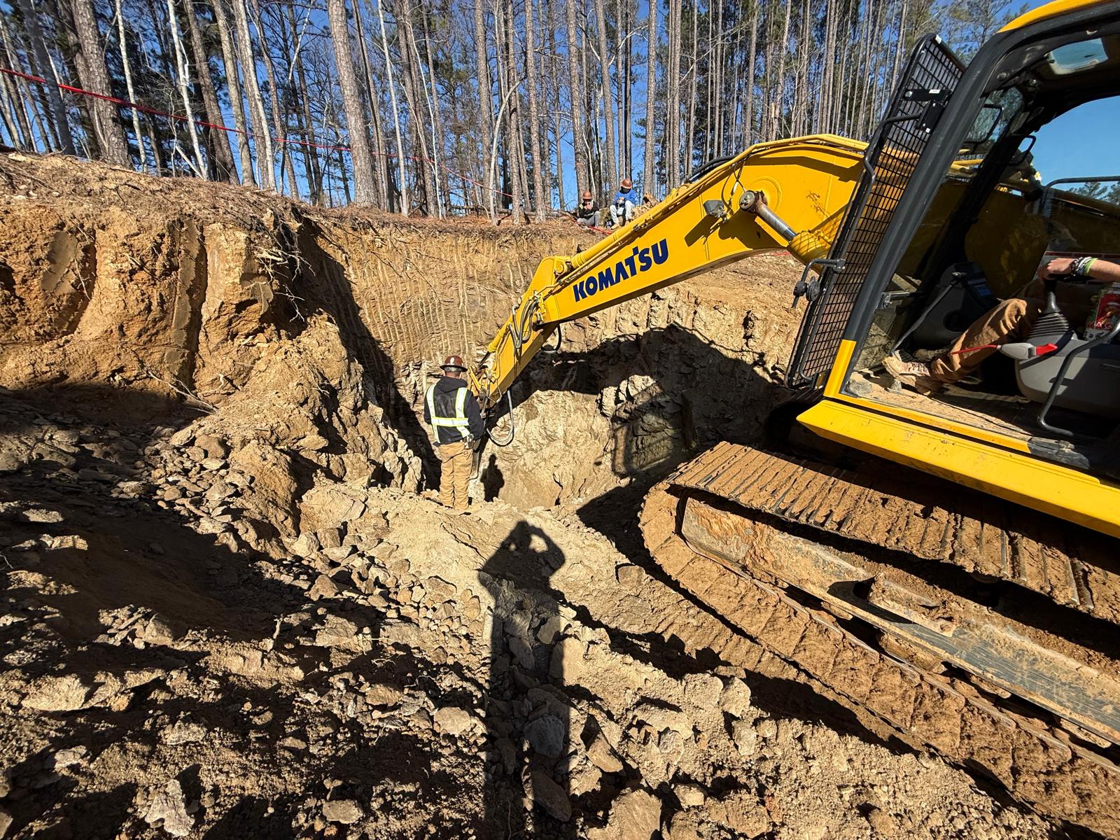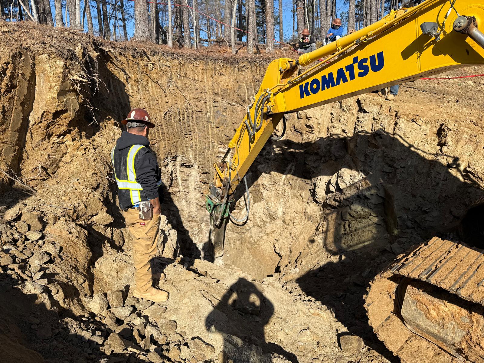 The contractor proceeded with installation and backfilling work on manhole D7, utilizing a Kobelco SK 350LC excavator. Rock boulders present on the site were being broken down into smaller pieces using a Komatsu 210LC excavator. Following excavation, backfill material was placed and compacted in one-foot lifts. Compaction was carried out using a combination of manual compactors, a Dynapac remote-control compactor, and final compaction of the upper layers with a HAMM R2 roller. Proof-rolling and general probing found the area stable. Density testing using a nuclear density gauge could not be performed due to the boulder fill present.