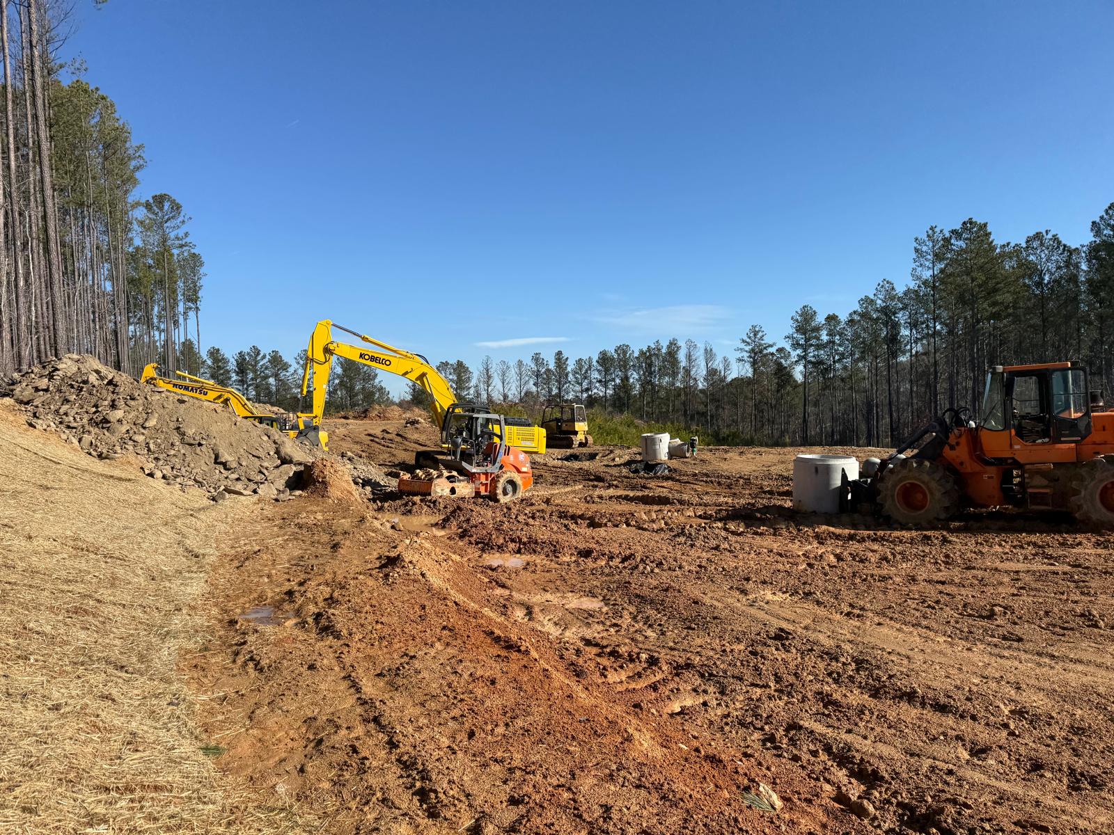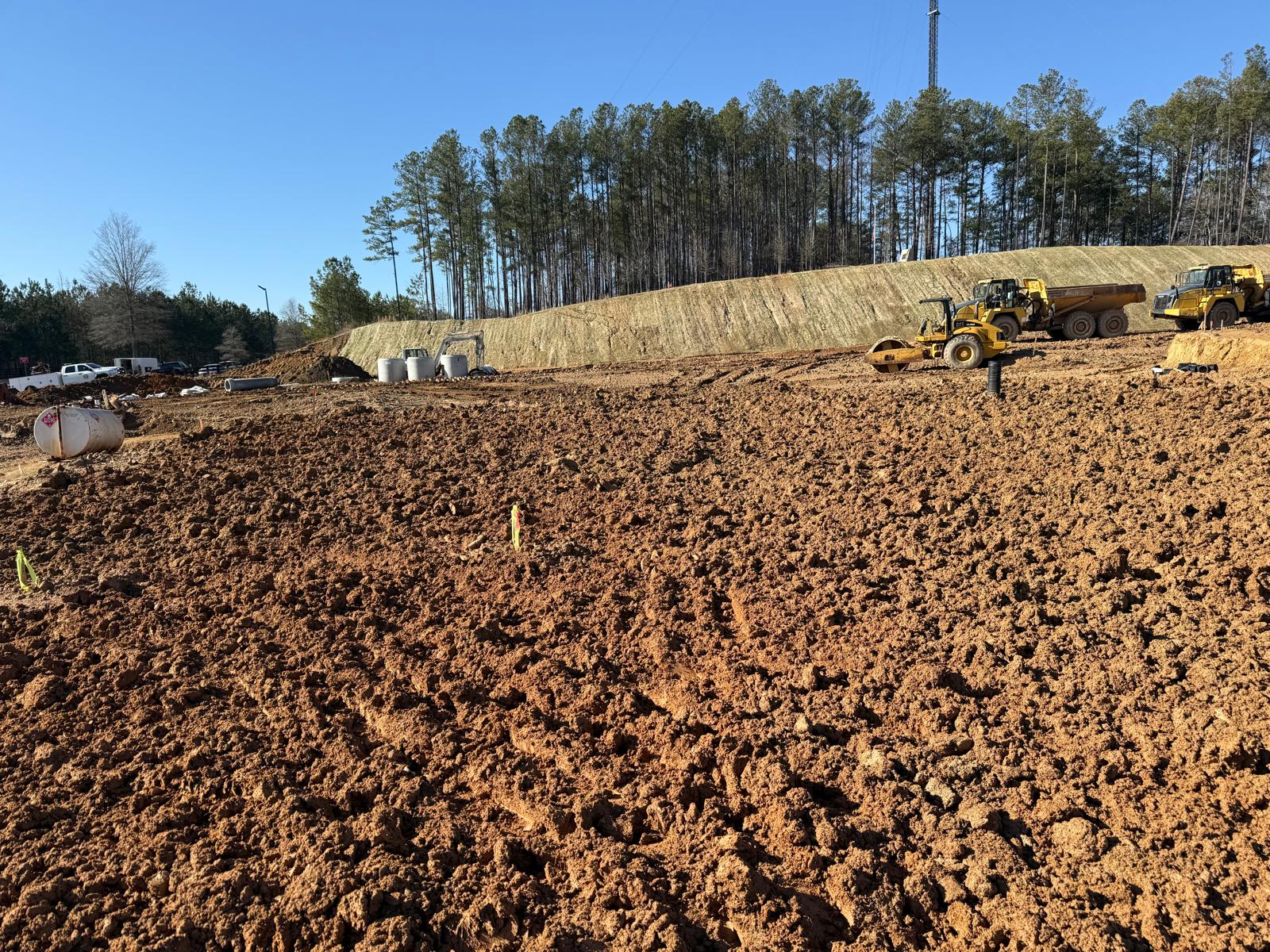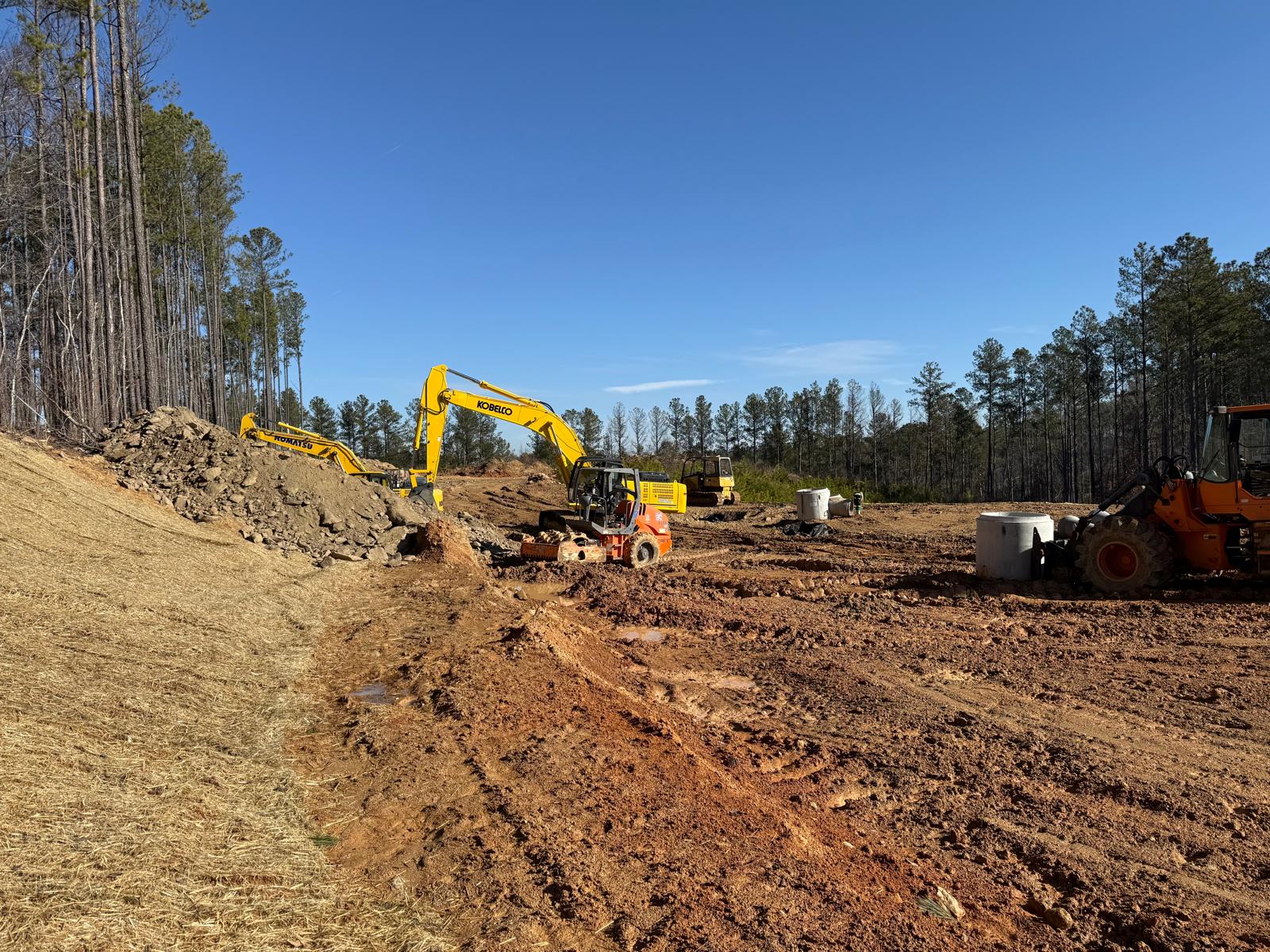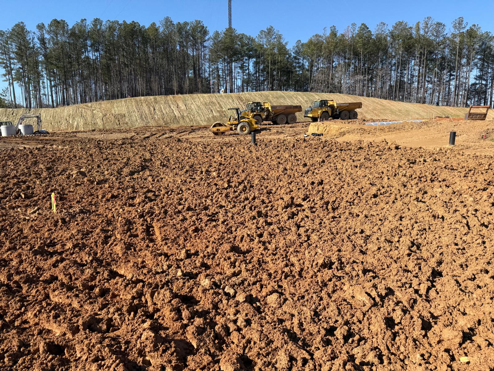 The contractor proceeded with installation and backfilling work on manhole D7, utilizing a Kobelco SK 350LC excavator. Rock boulders present on the site were being broken down into smaller pieces using a Komatsu 210LC excavator. Following excavation, backfill material was placed and compacted in one-foot lifts. Compaction was carried out using a combination of manual compactors, a Dynapac remote-control compactor, and final compaction of the upper layers with a HAMM R2 roller. Proof-rolling and general probing found the area stable. Density testing using a nuclear density gauge could not be performed due to the boulder fill present.