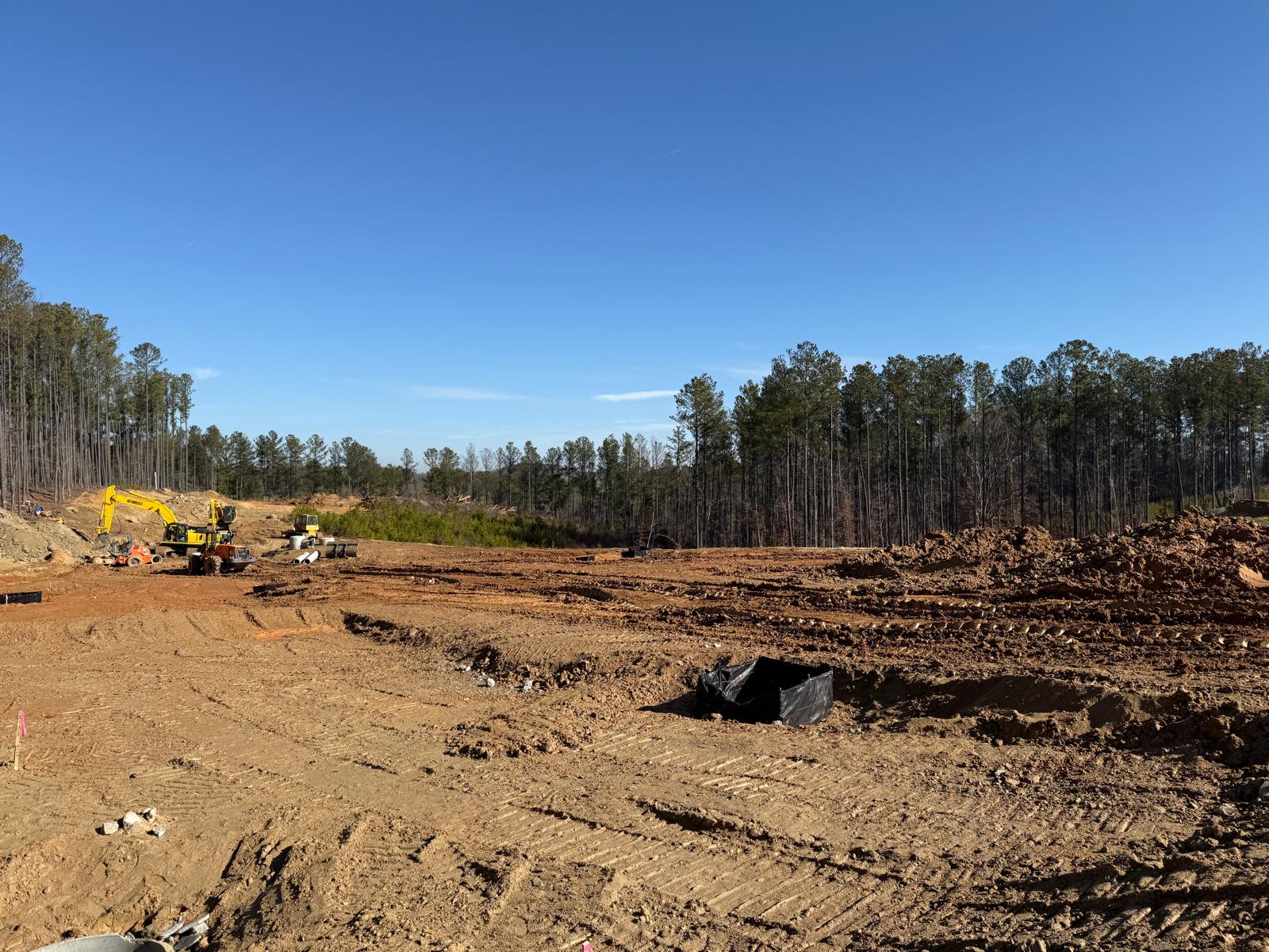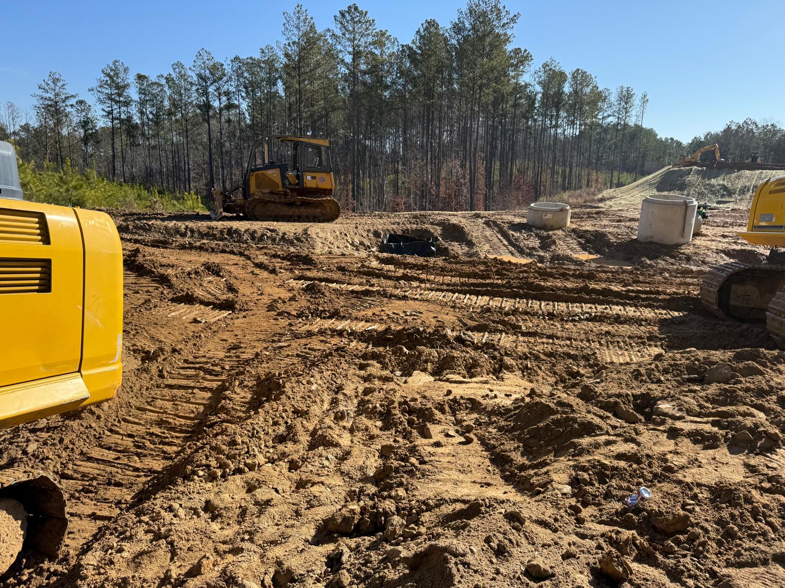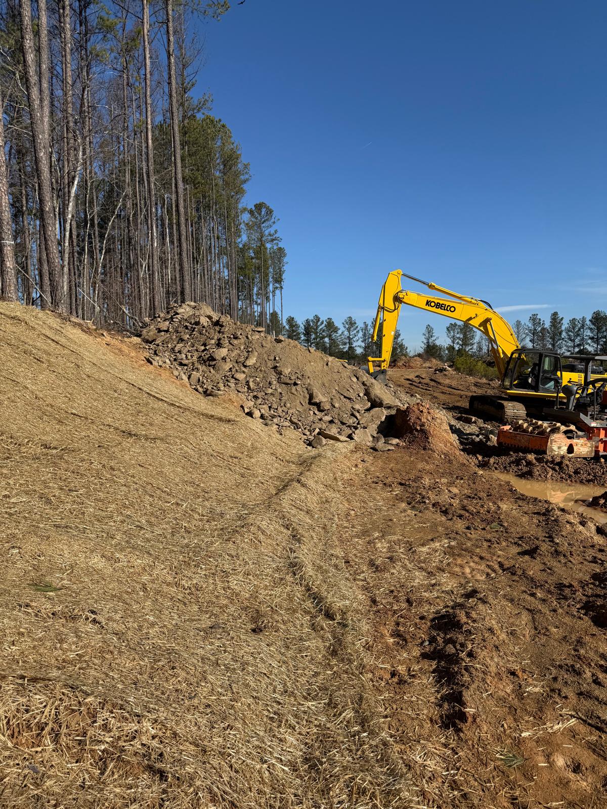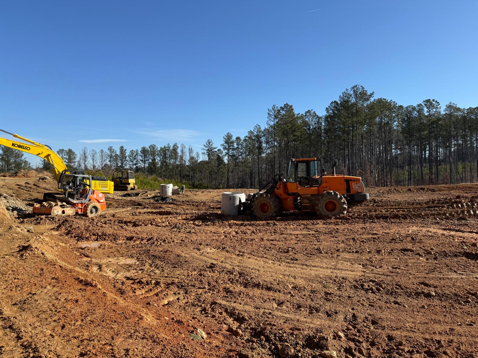 The contractor proceeded with installation and backfilling work on manhole D7, utilizing a Kobelco SK 350LC excavator. Rock boulders present on the site were being broken down into smaller pieces using a Komatsu 210LC excavator. Following excavation, backfill material was placed and compacted in one-foot lifts. Compaction was carried out using a combination of manual compactors, a Dynapac remote-control compactor, and final compaction of the upper layers with a HAMM R2 roller. Proof-rolling and general probing found the area stable. Density testing using a nuclear density gauge could not be performed due to the boulder fill present.
