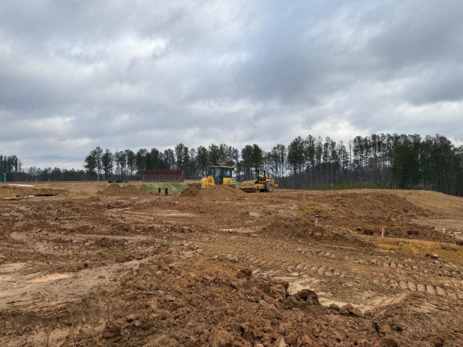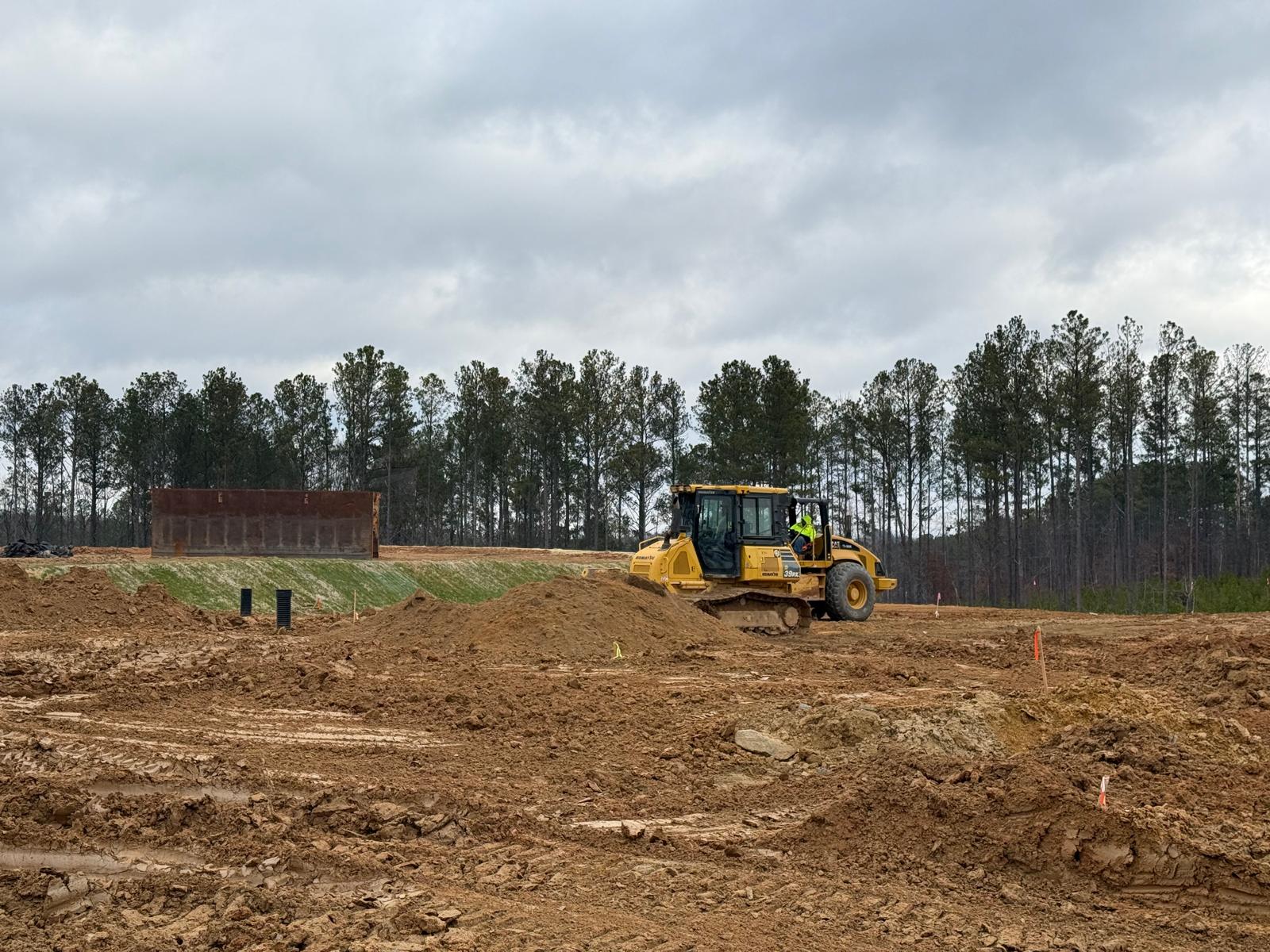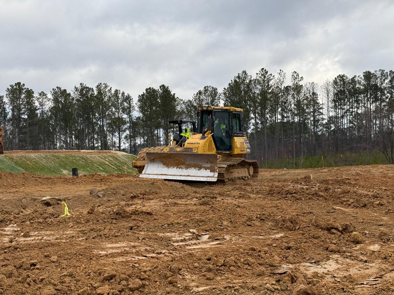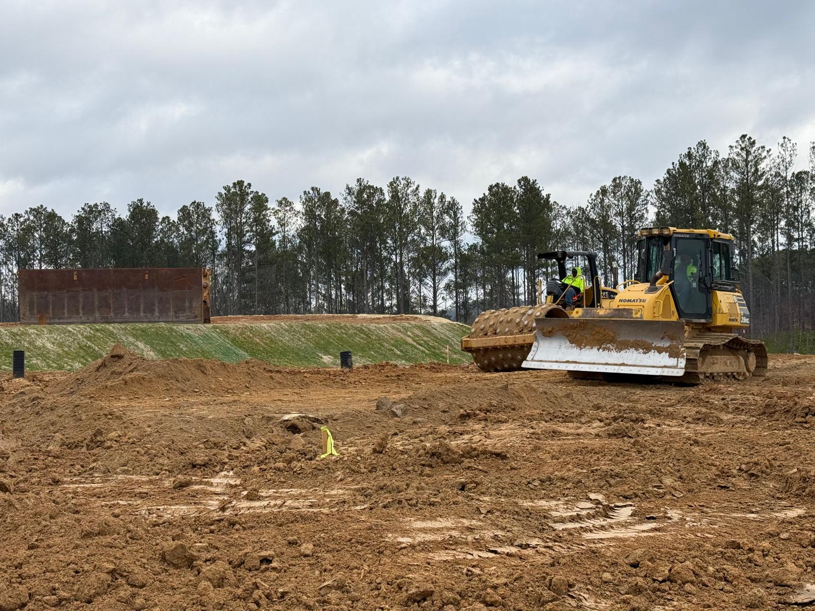 • After the rain from the previous days, the contractor continued scarifying and aerating wet surficial soils using a Komatsu 39PXi dozer. At the same time, a Komatsu PC 360LC was used to address several slopes across the site.