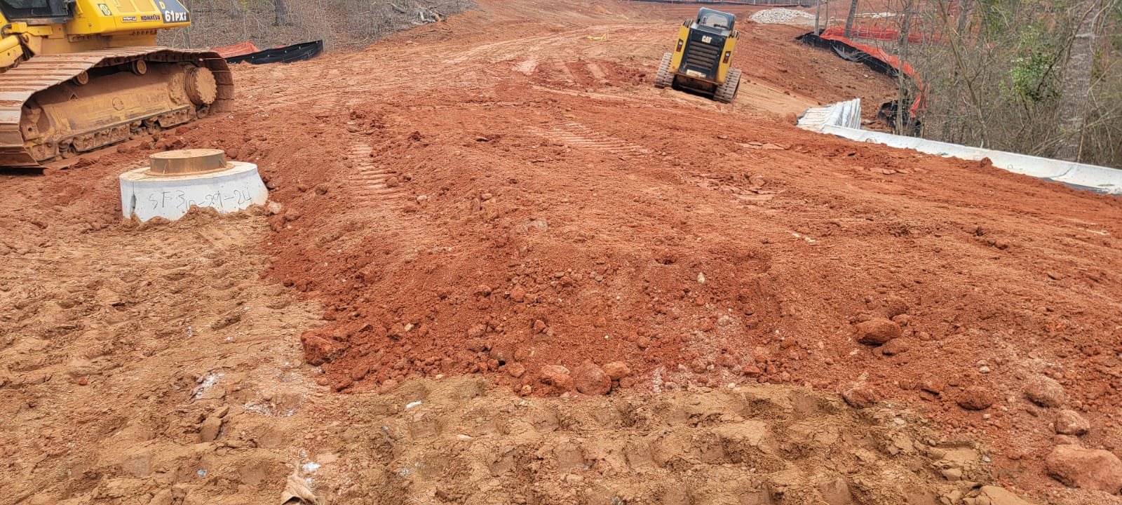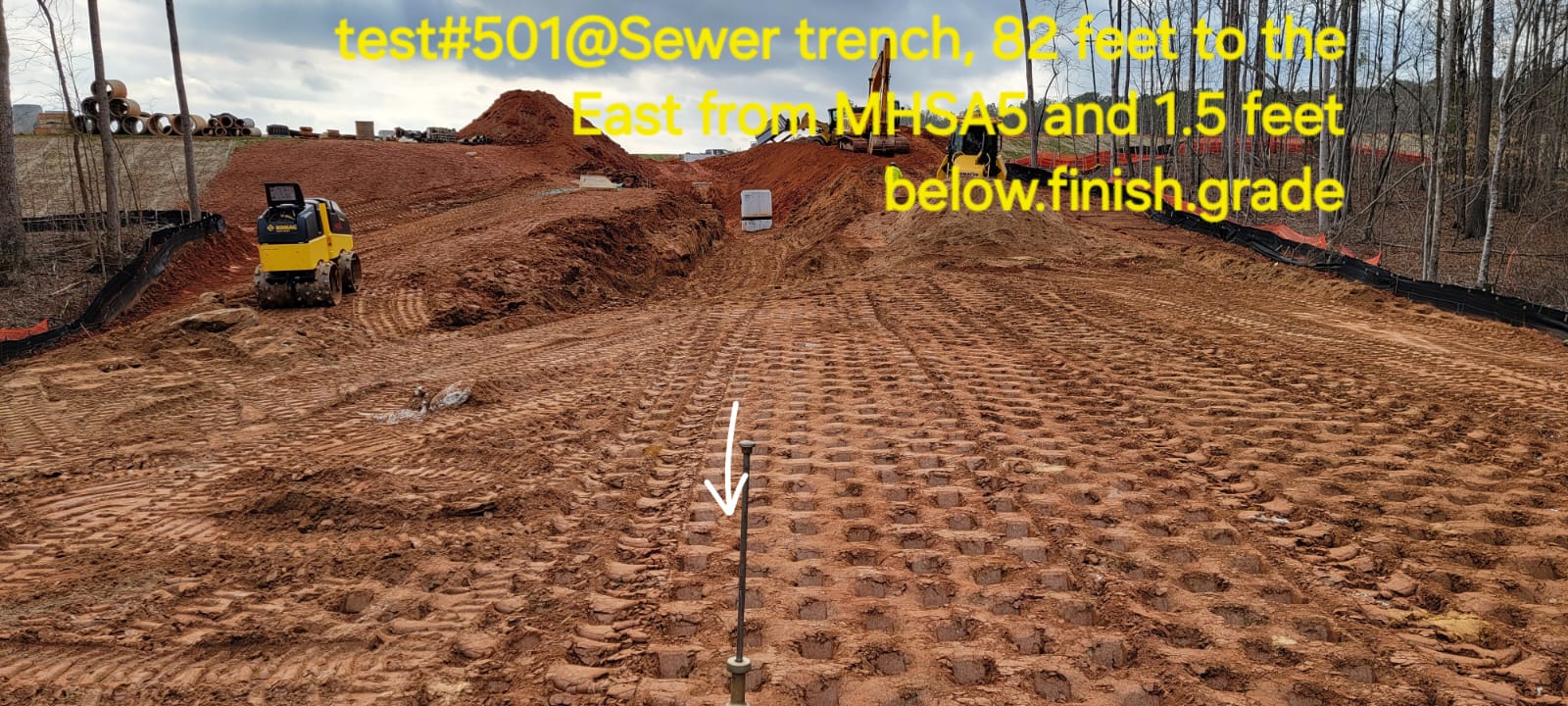 • At the time of arrival, our representative observed that work was in progress with1-foot lifts being placed and compacted using a 6-ton pad-foot and trench compaction equipment. Compaction testing was performed using the Standard Test Method for Density of Soil in Place by Drive-Cylinder (ASTM D 2937), along with general probing using a 3/8″ diameter probe rod.