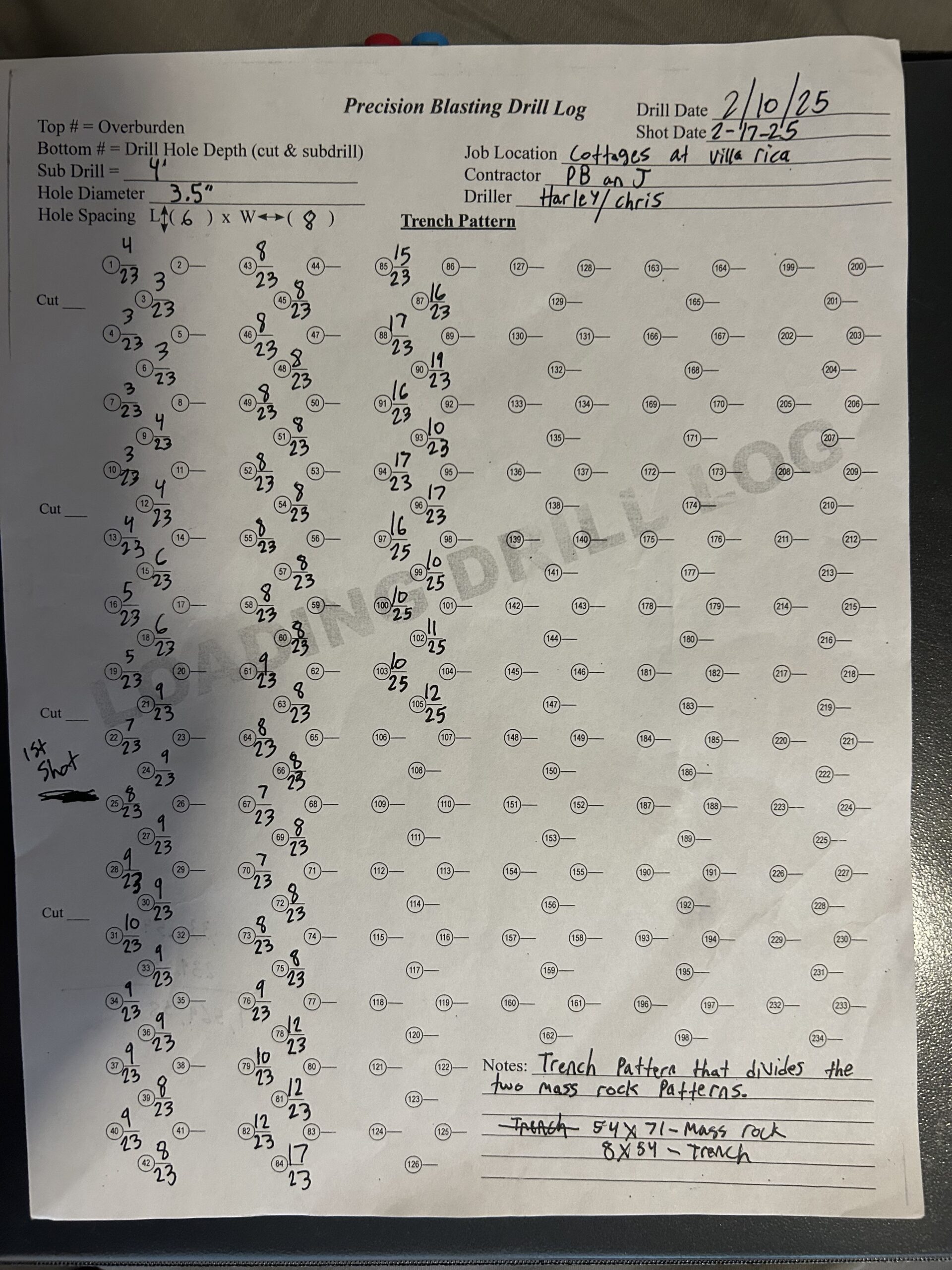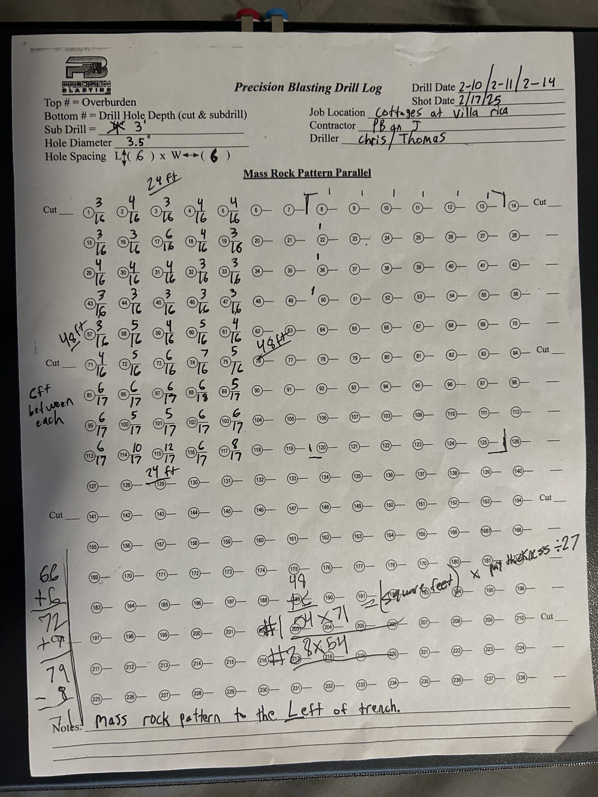 Today, drillers from precision blasting began drilling/cleaning out holes that got filled up from last weeks rain. These holes consisted of a small trench pattern in the middle, with two mass rock patterns on either side. The location of this blasting was in-between lot #189 and lot #57, running down the main sewer line. A total mass rock area blasted was 3,834 square feet with an average pay thickness of 10.37 feet. The calculated volume of the mass rock blasted was 1,472.6 cubic yards. The total trench area blasted was 432 square feet with an average pay thickness of 14.94 feet. The calculated volume of trench rock blasted was 239.06 cubic yards.