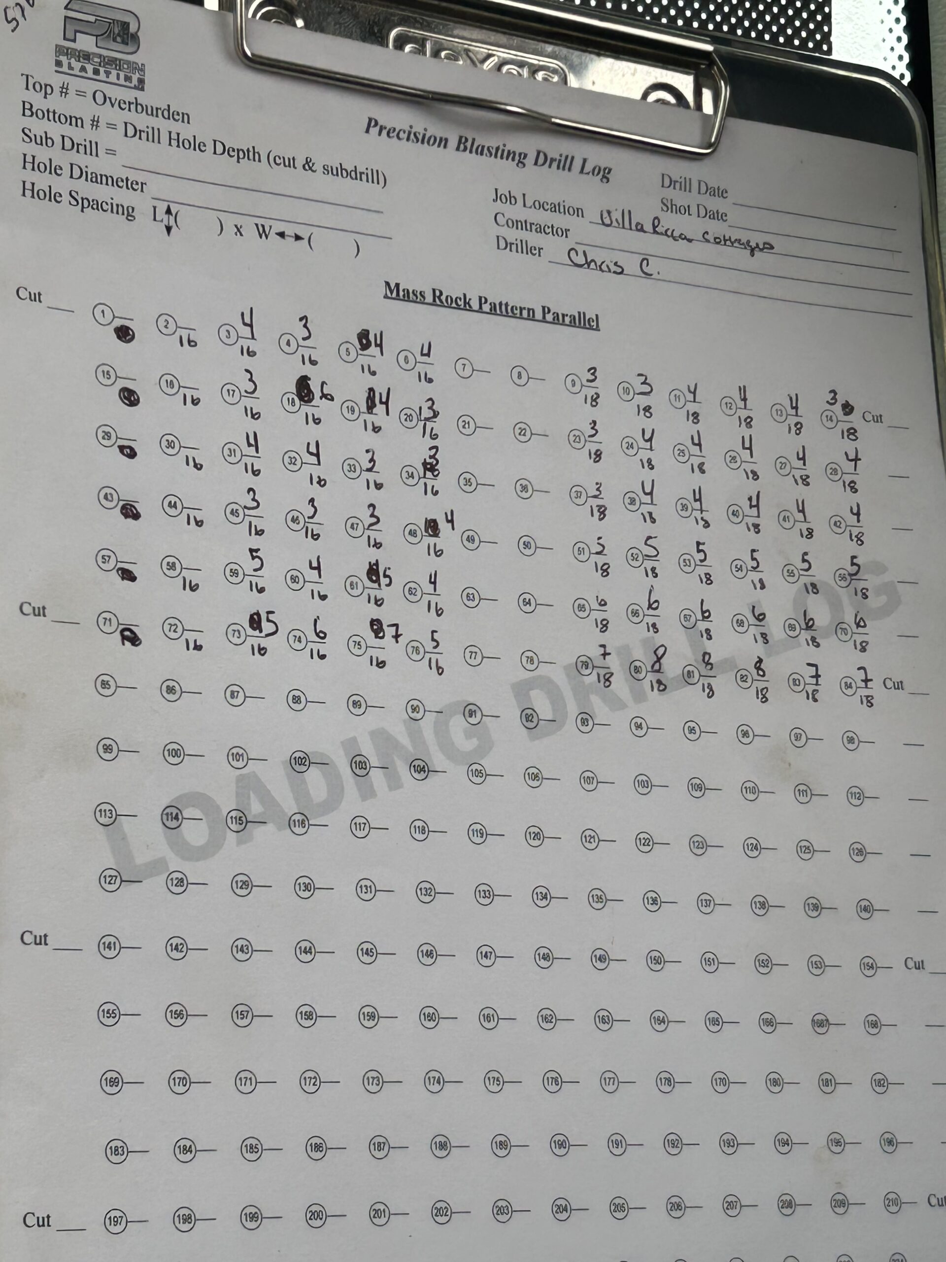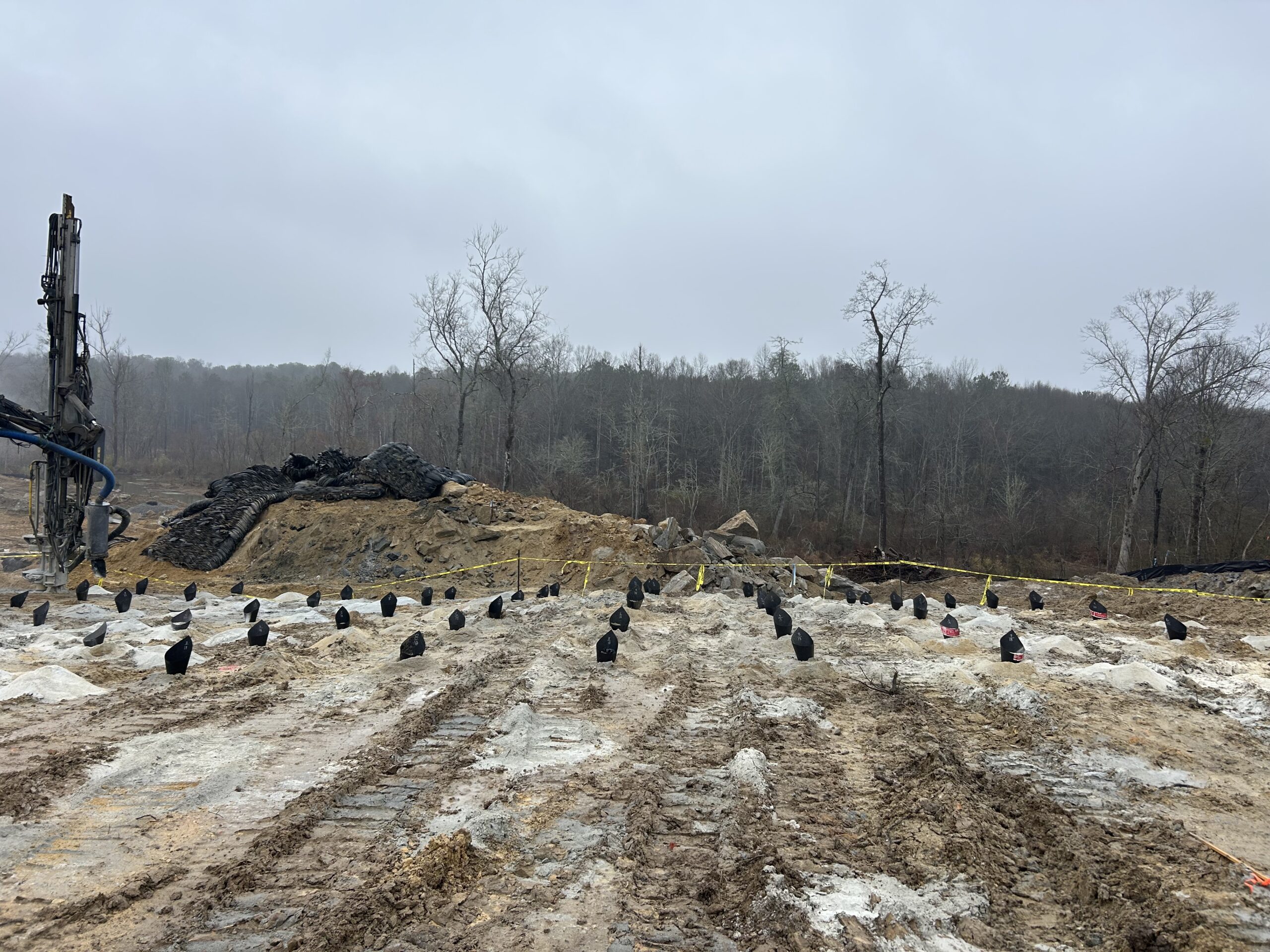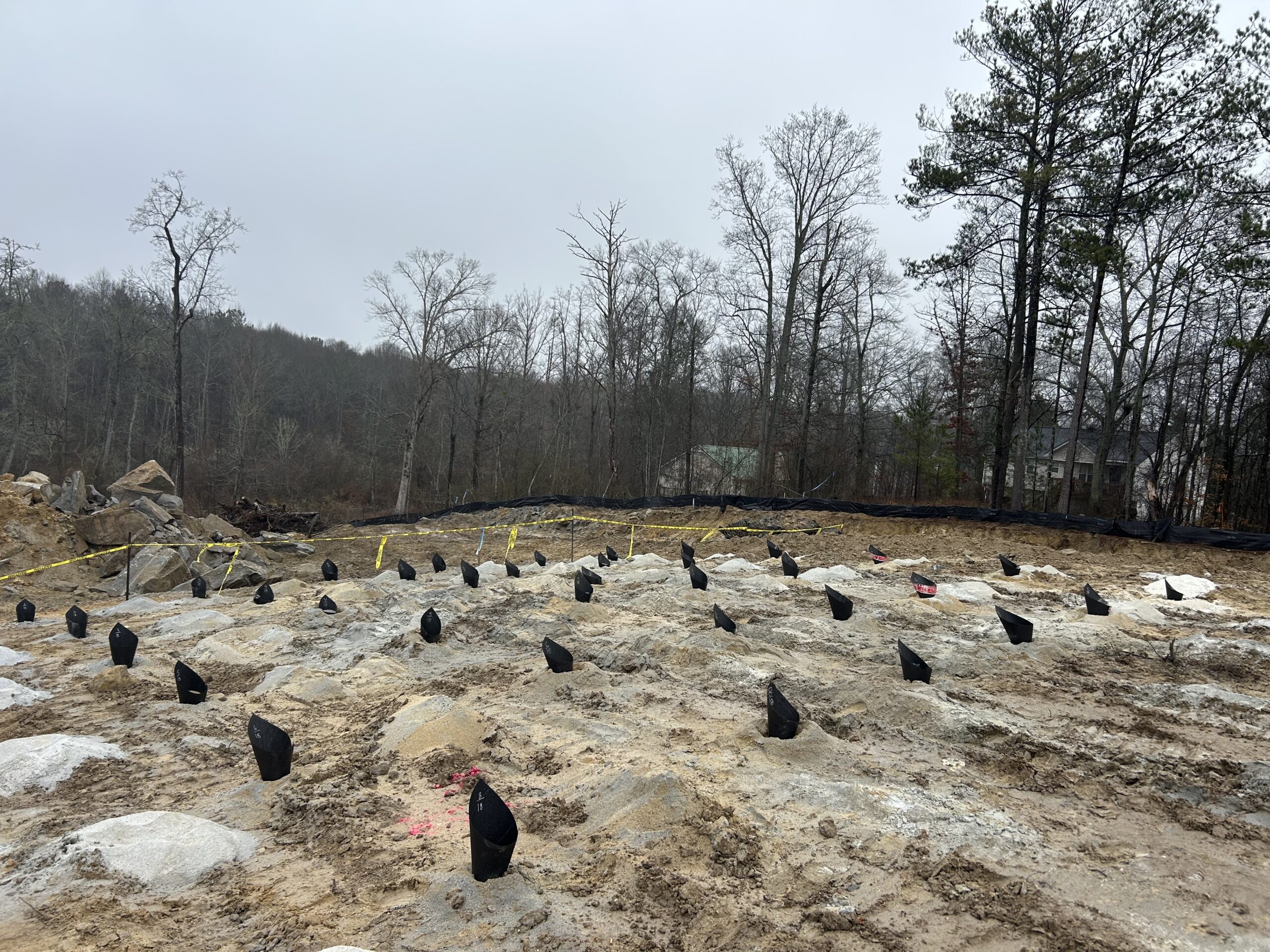 Because of the weather the precision blasting was only able to drill today. It continued south along the main sewer line where all the mass rock is located. The location was in-between lot #191 and lot #55. The pattern of the drilling still followed a trench in the middle and two mass rock patterns, one on each side of the trench. Progress was made but unfortunately, many of these holes will need to be cleaned out before the next blast, due to the weather.