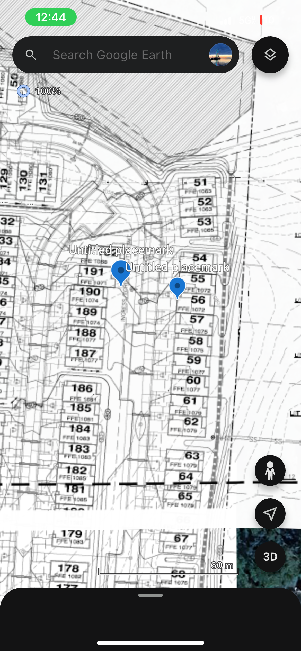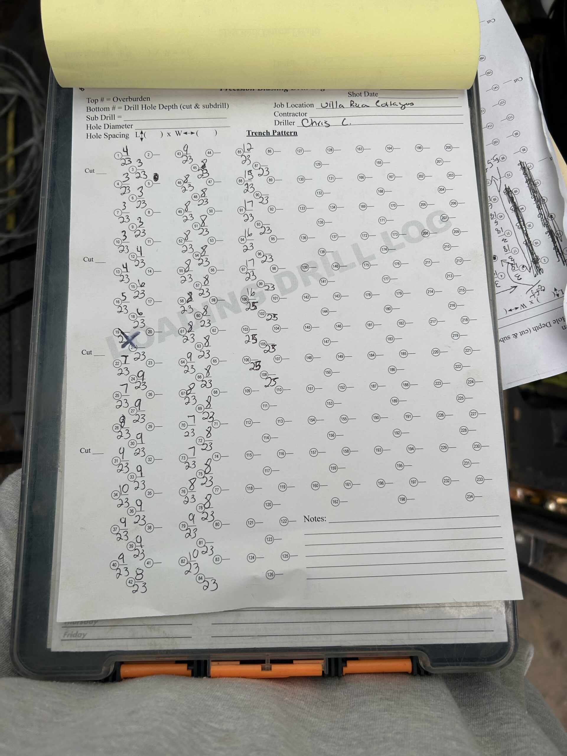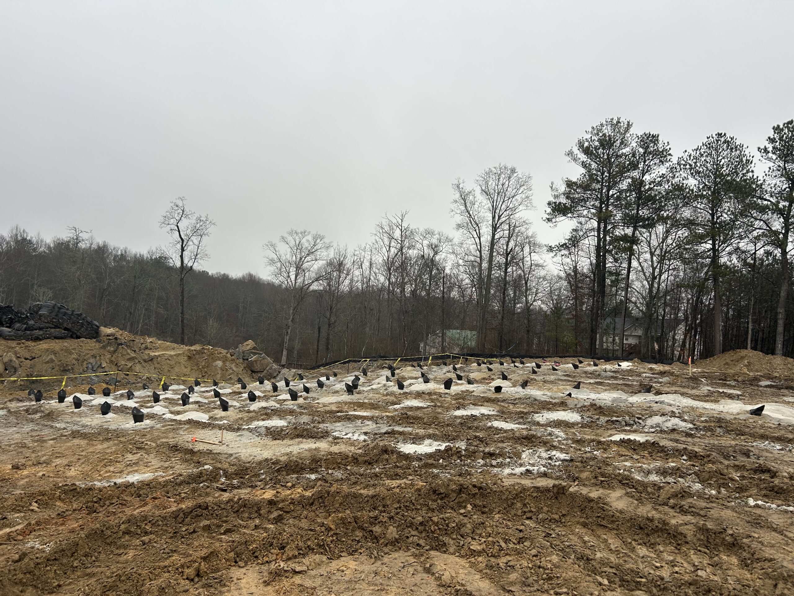 Because of the weather the precision blasting was only able to drill today. It continued south along the main sewer line where all the mass rock is located. The location was in-between lot #191 and lot #55. The pattern of the drilling still followed a trench in the middle and two mass rock patterns, one on each side of the trench. Progress was made but unfortunately, many of these holes will need to be cleaned out before the next blast, due to the weather.