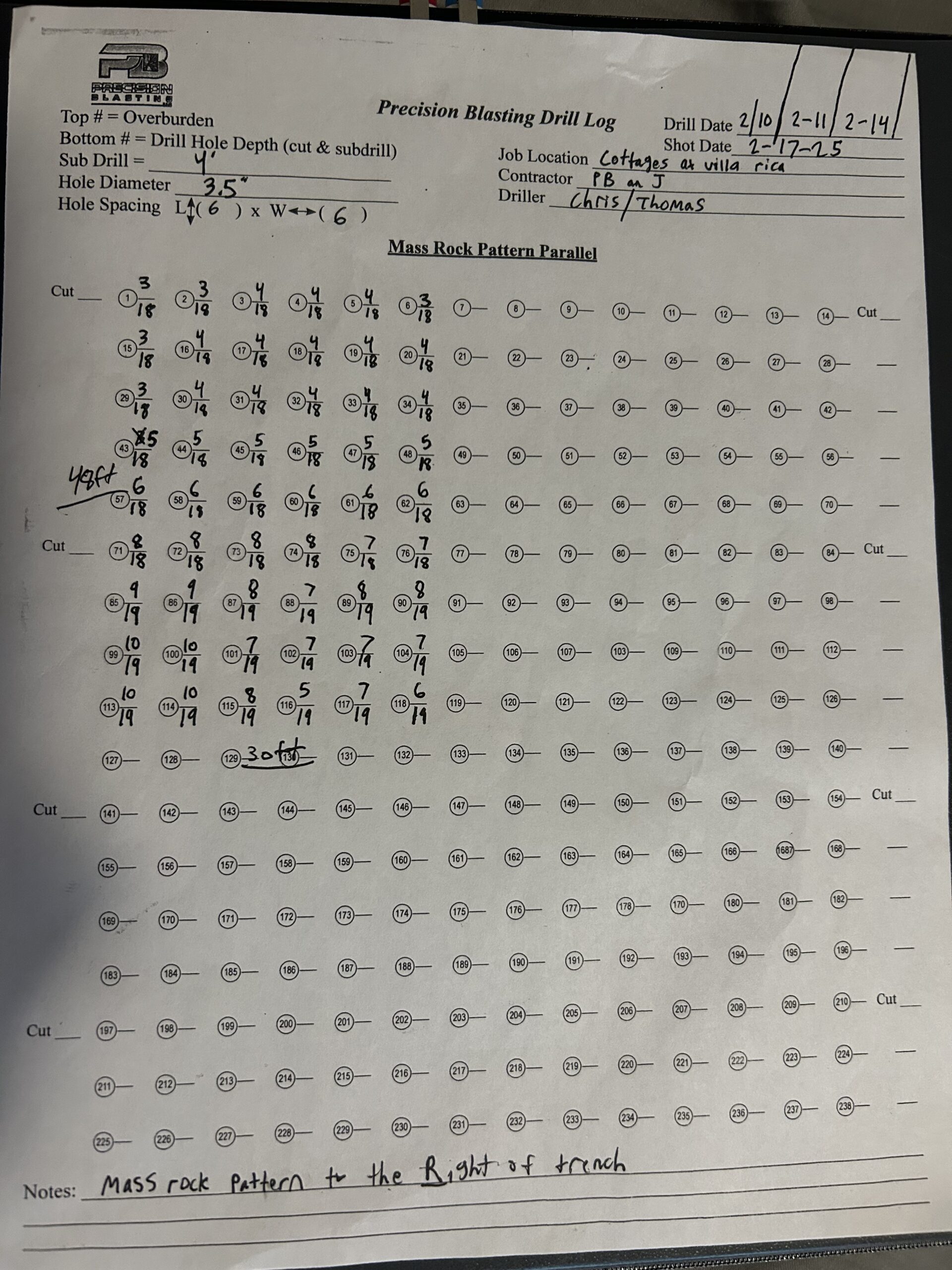 Because the weather cleared up today, precision blasting was able to continue drilling in preparation for the next blast. The drilling area followed the same pattern of trench in the center, with mass rock patterns on each side. The areas drilled were in-between lot #189/#188 and lot #57/#58. Good progress was made for next weeks blast, one driller was working on production drilling while the other was able to clean some previous drilling locations. Everything went according to plan and all drilling met with the production standards.