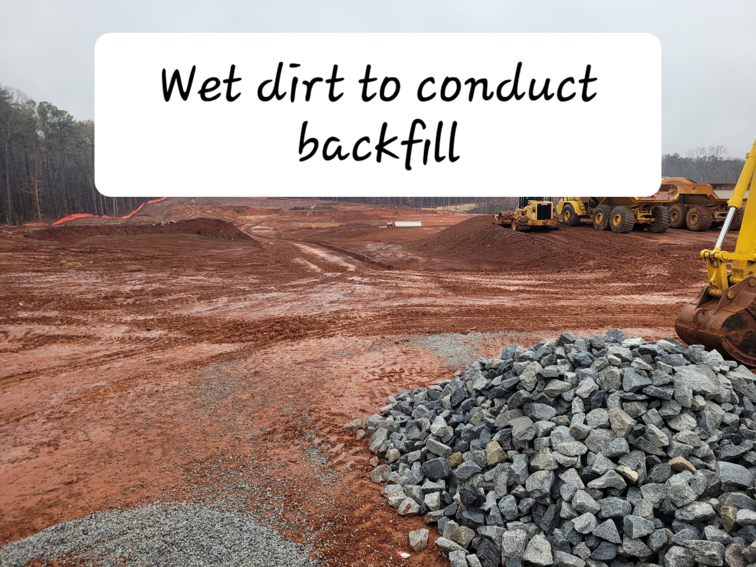 Site is still very wet and muddy with onset of short rain making grading operations not feasible today. Contractor will spend time dewatering and demucking in hopes of starting up grading operations again tomorrow.