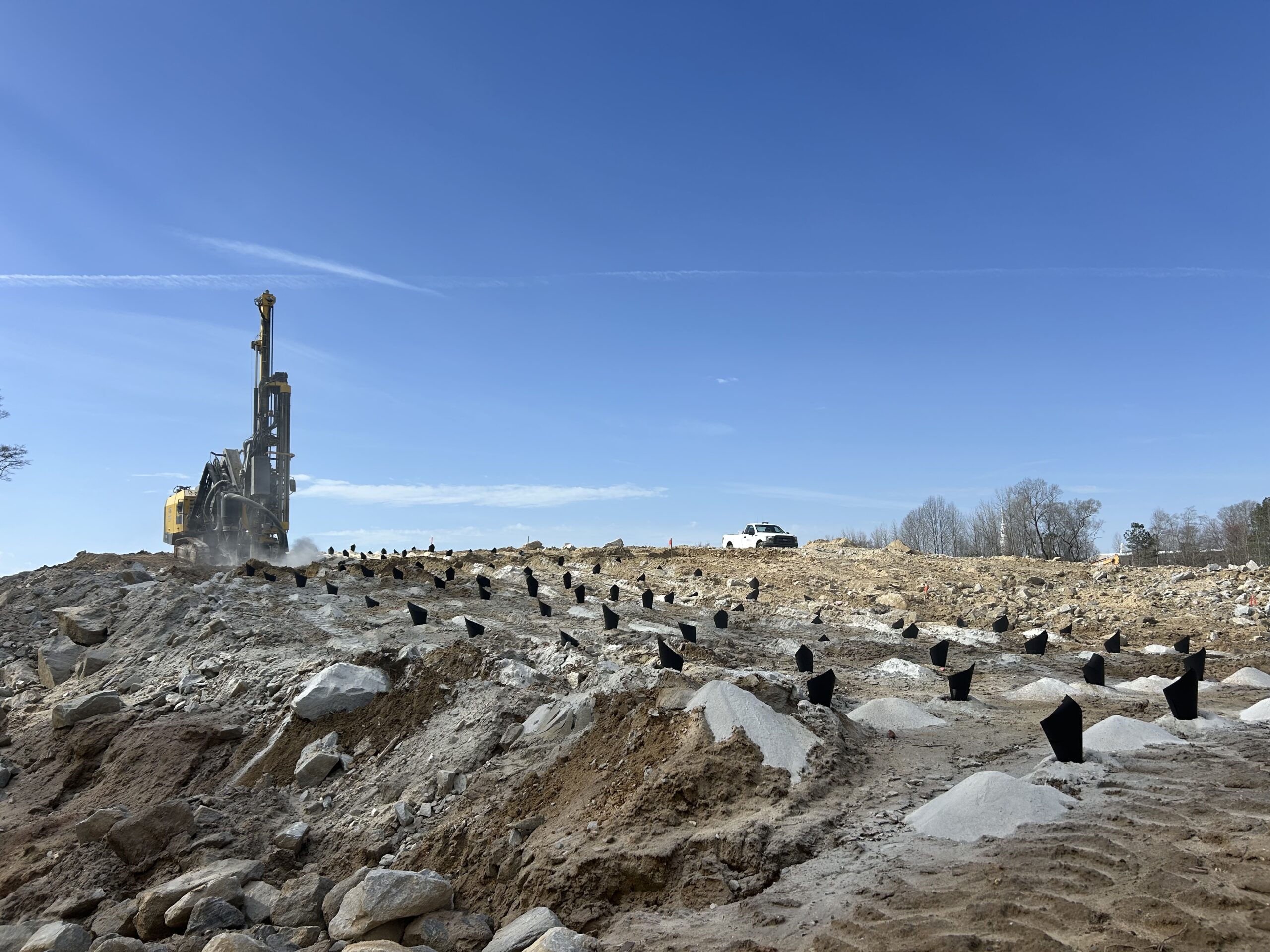 Today, the drilling team continued working on the mass rock pattern in the northeast corner of the development. Drilling began at Lot #55 and progressed south toward Lot #56. The hole spacing remained consistent at 6 feet throughout the operation.