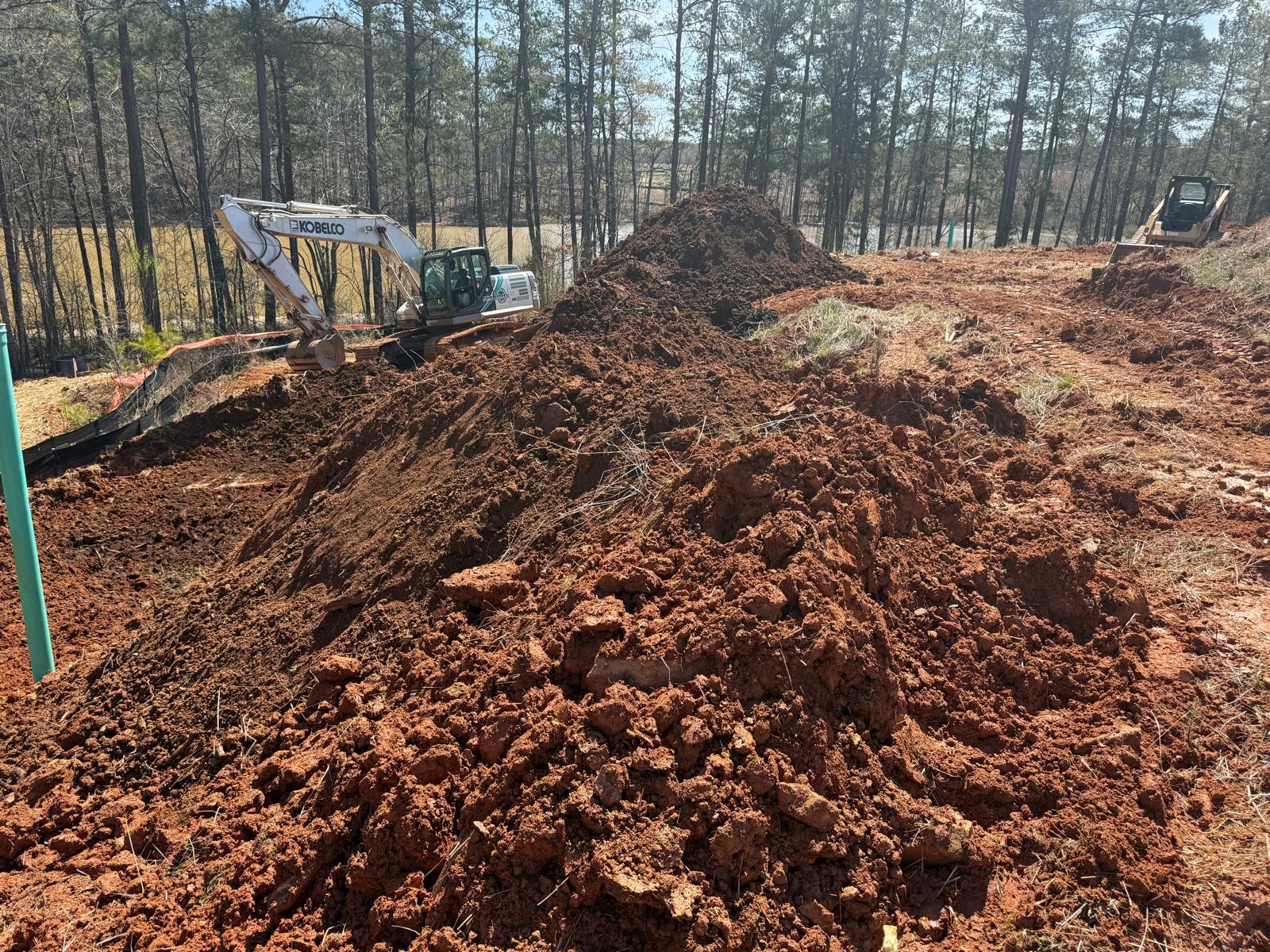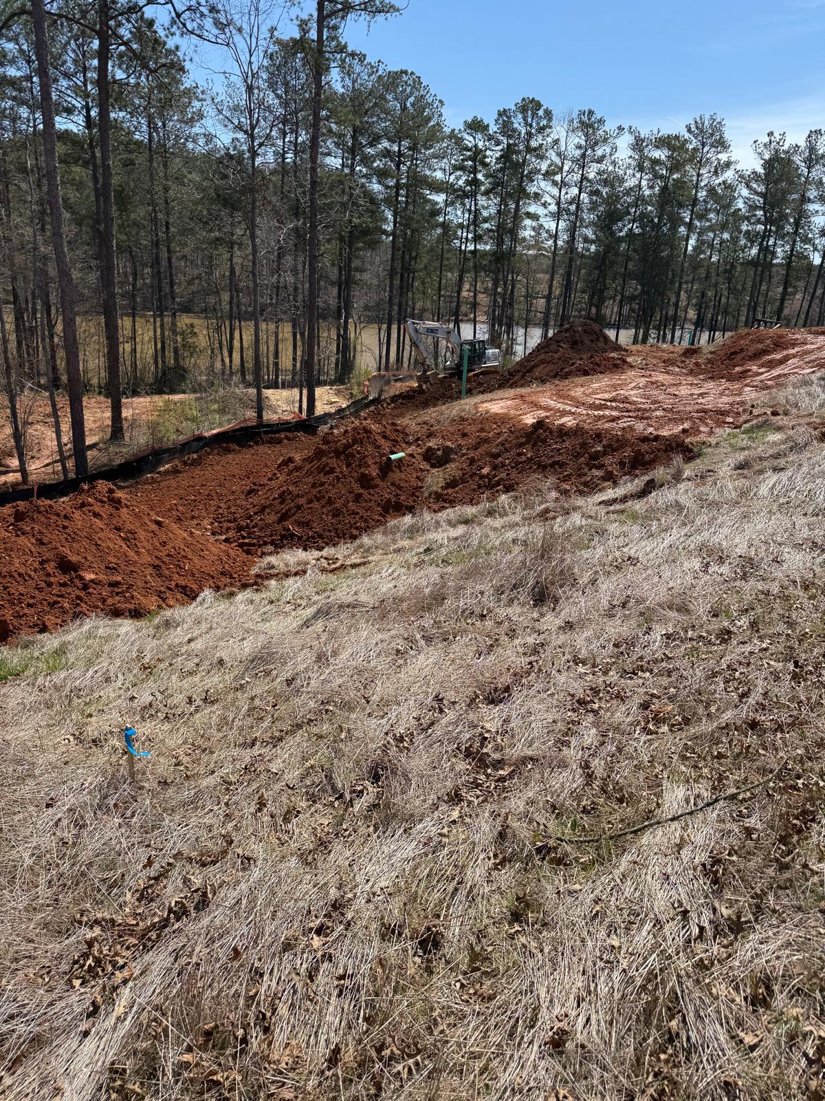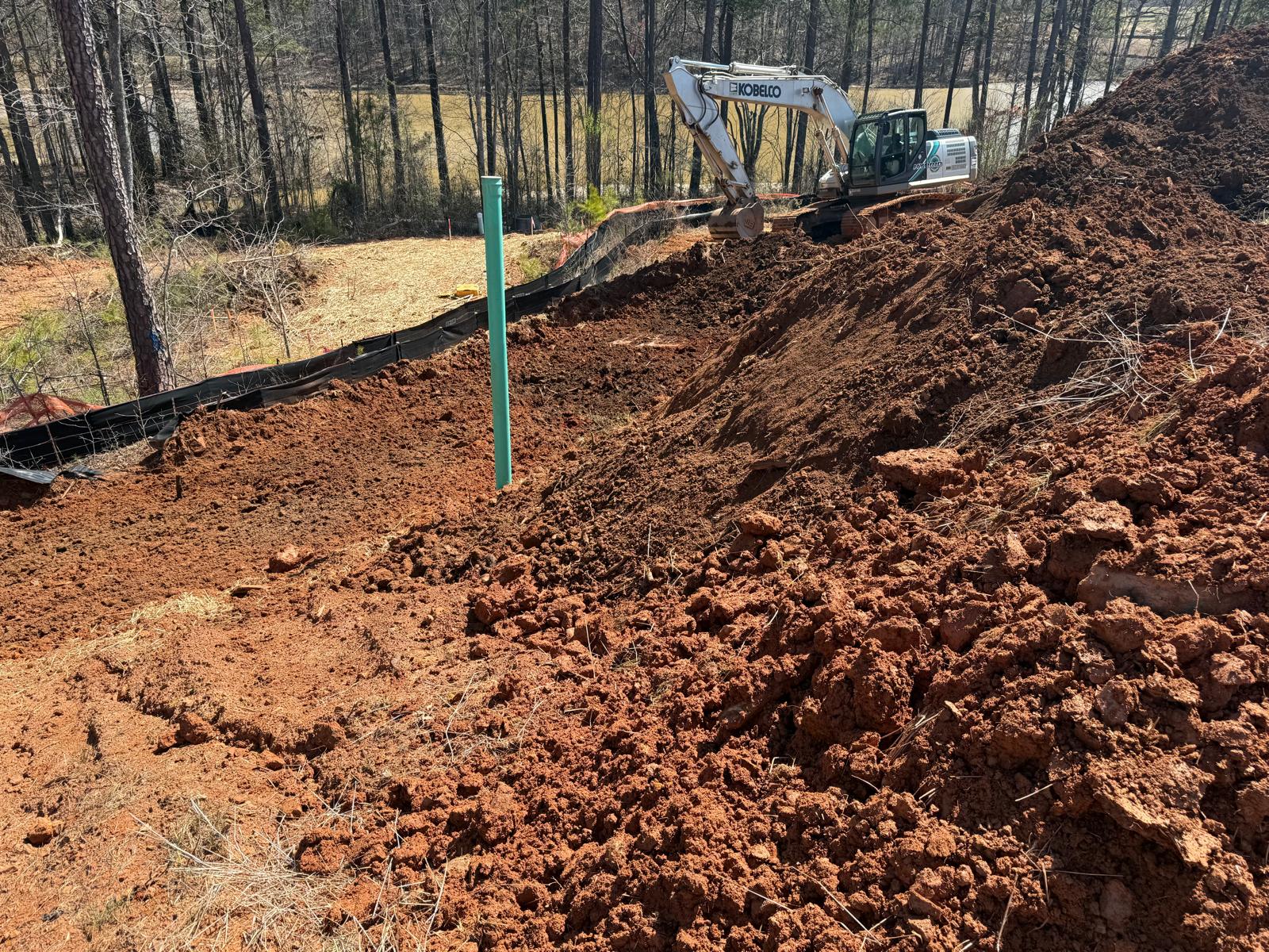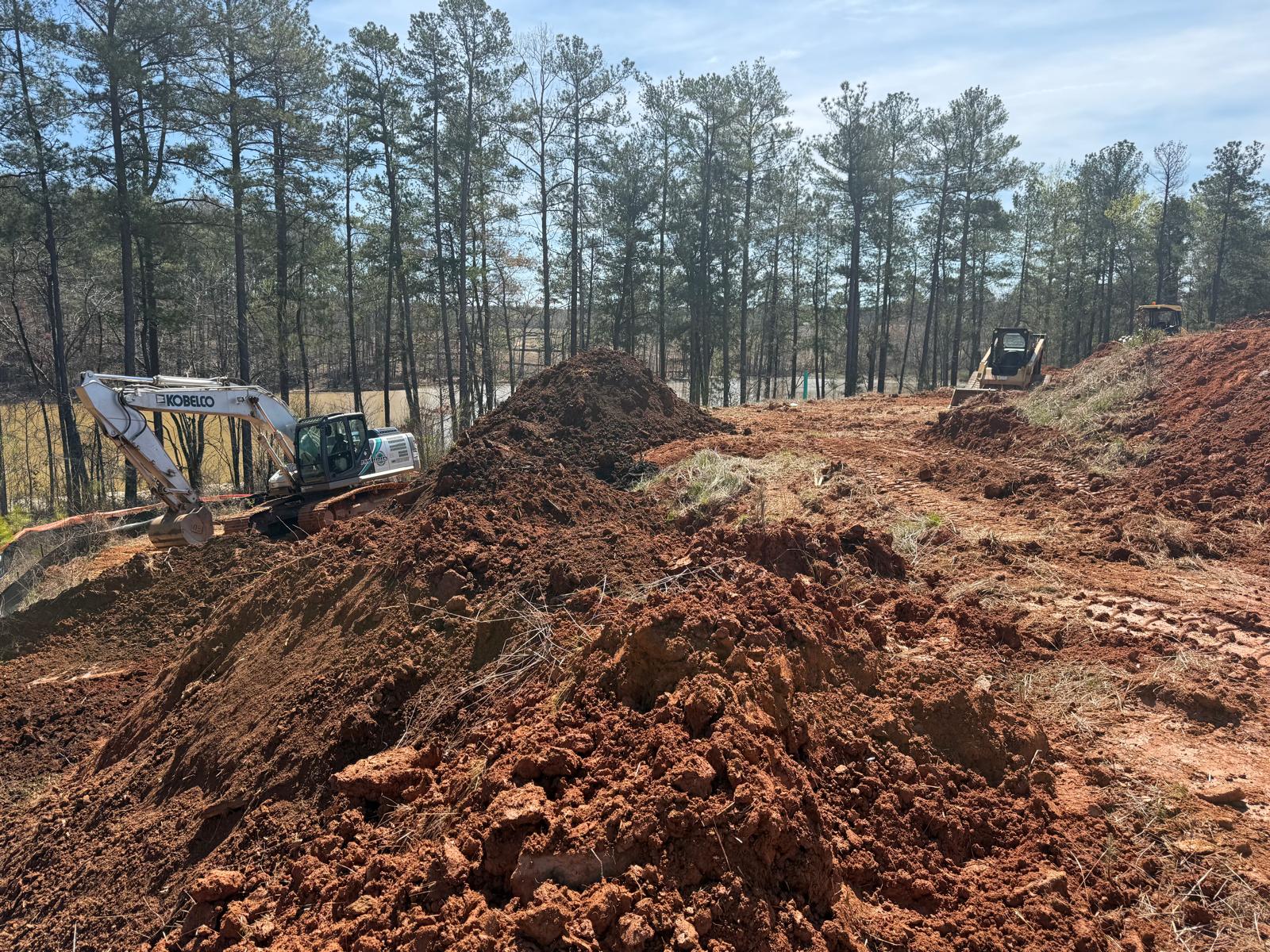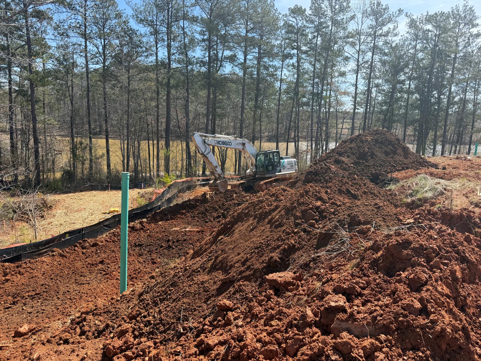 The work has commenced behind Lots #225, 226, and 227. The excavation for the retaining wall has been initiated, with a cut being made using a Kobelco SK300LC excavator. The contractor has successfully removed soft grey soils to suitable, stable soils.