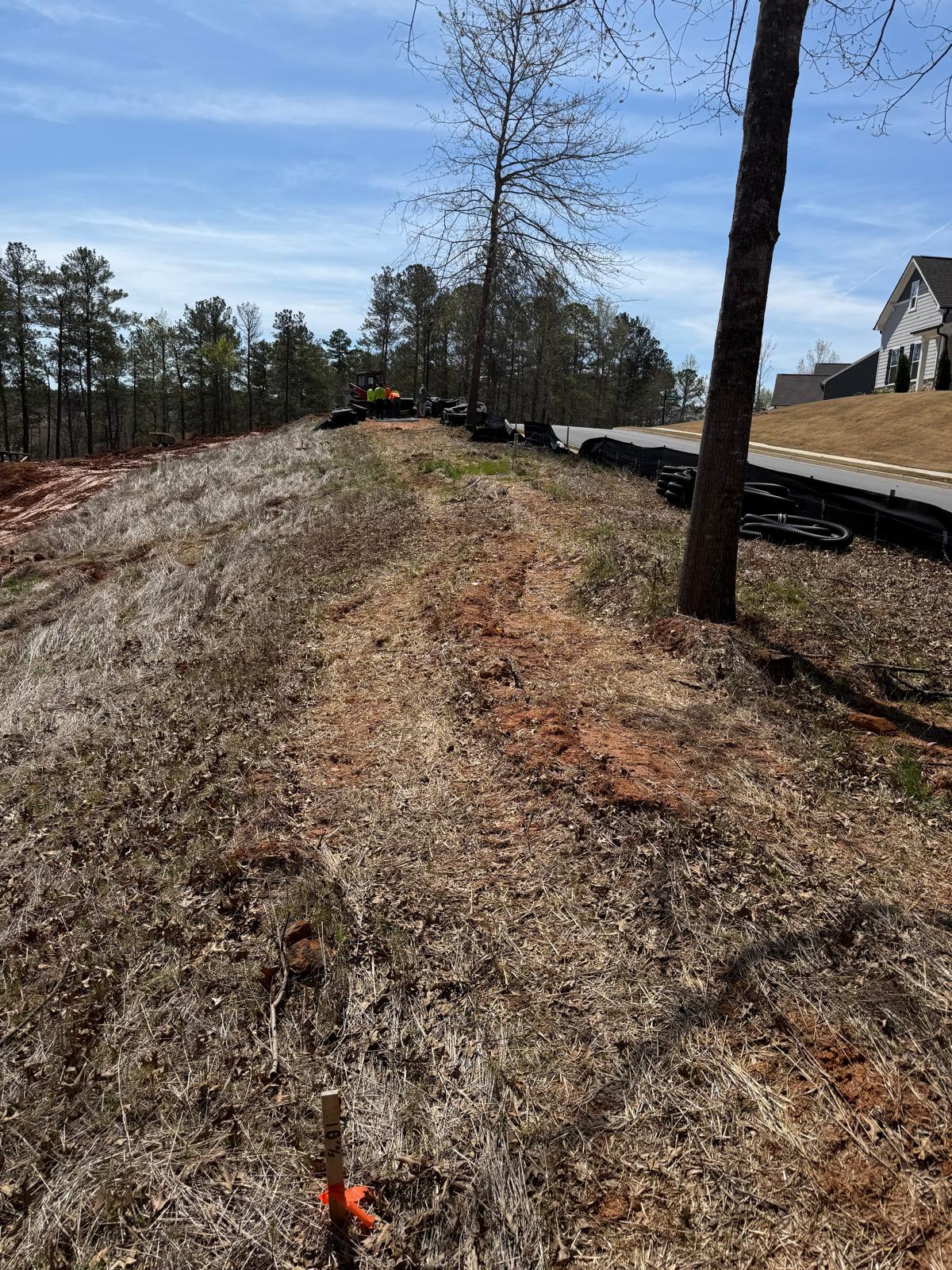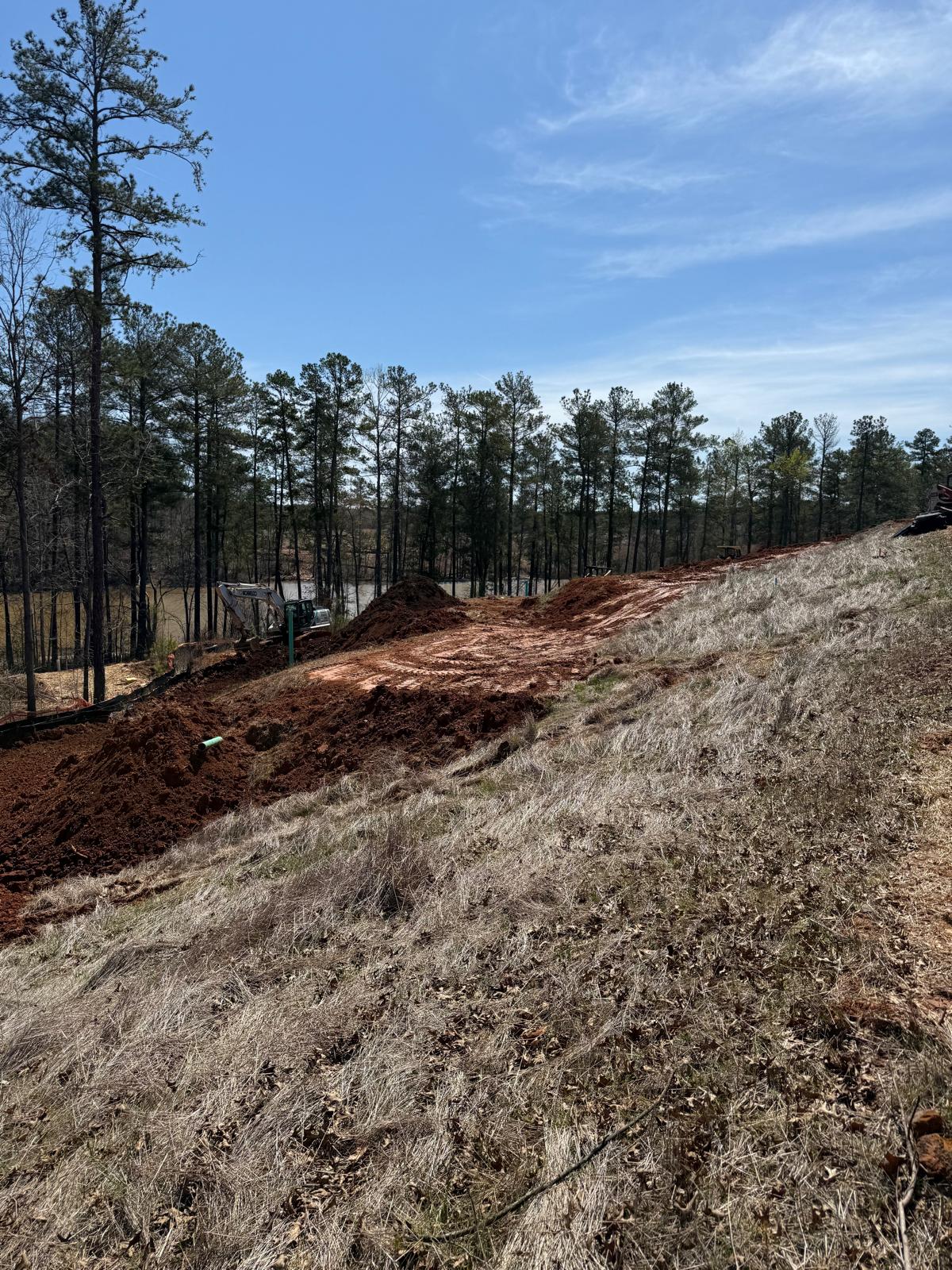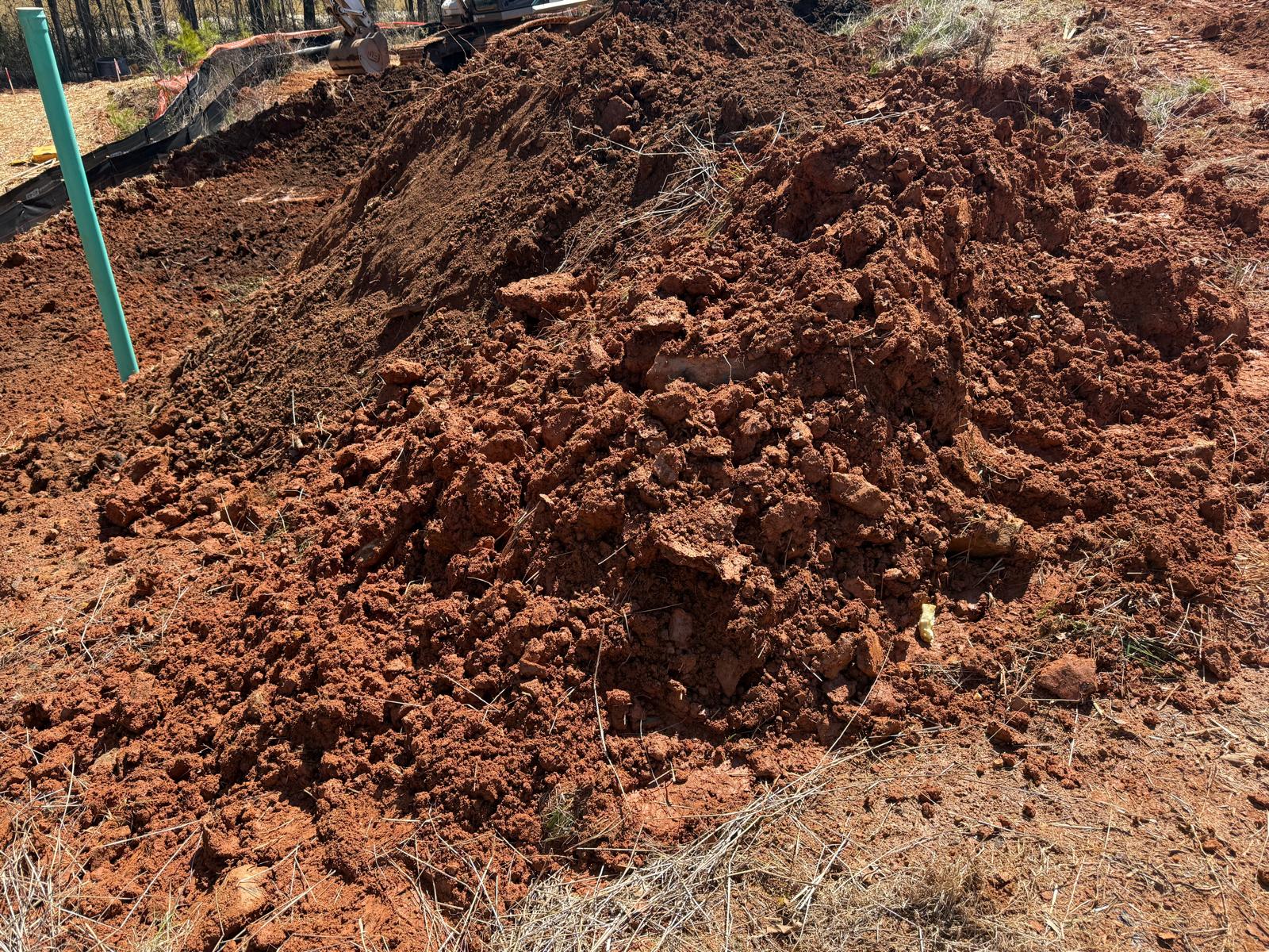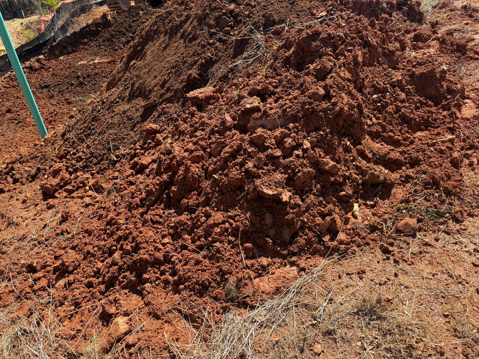 The work has commenced behind Lots #225, 226, and 227. The excavation for the retaining wall has been initiated, with a cut being made using a Kobelco SK300LC excavator. The contractor has successfully removed soft grey soils to suitable, stable soils.