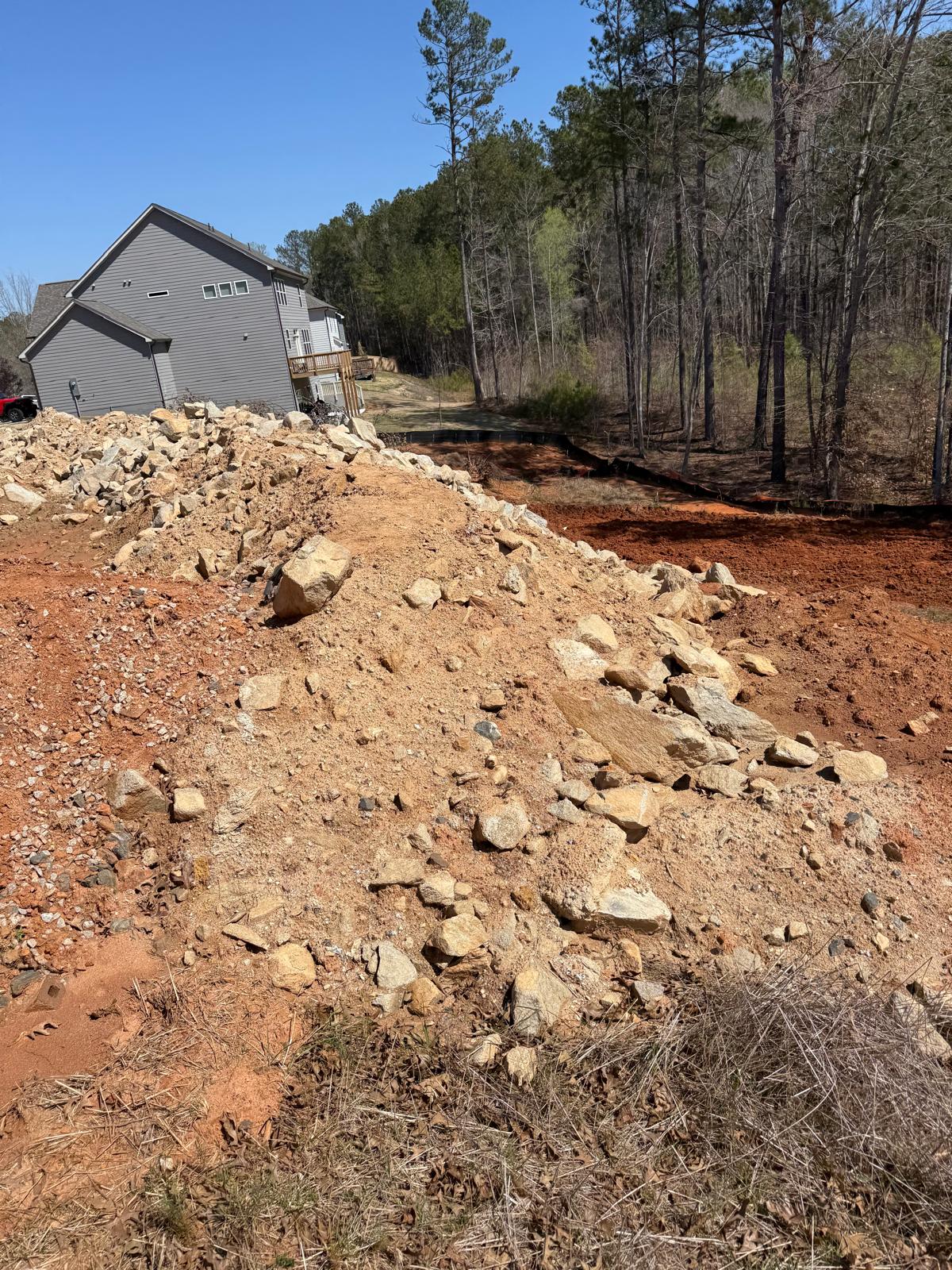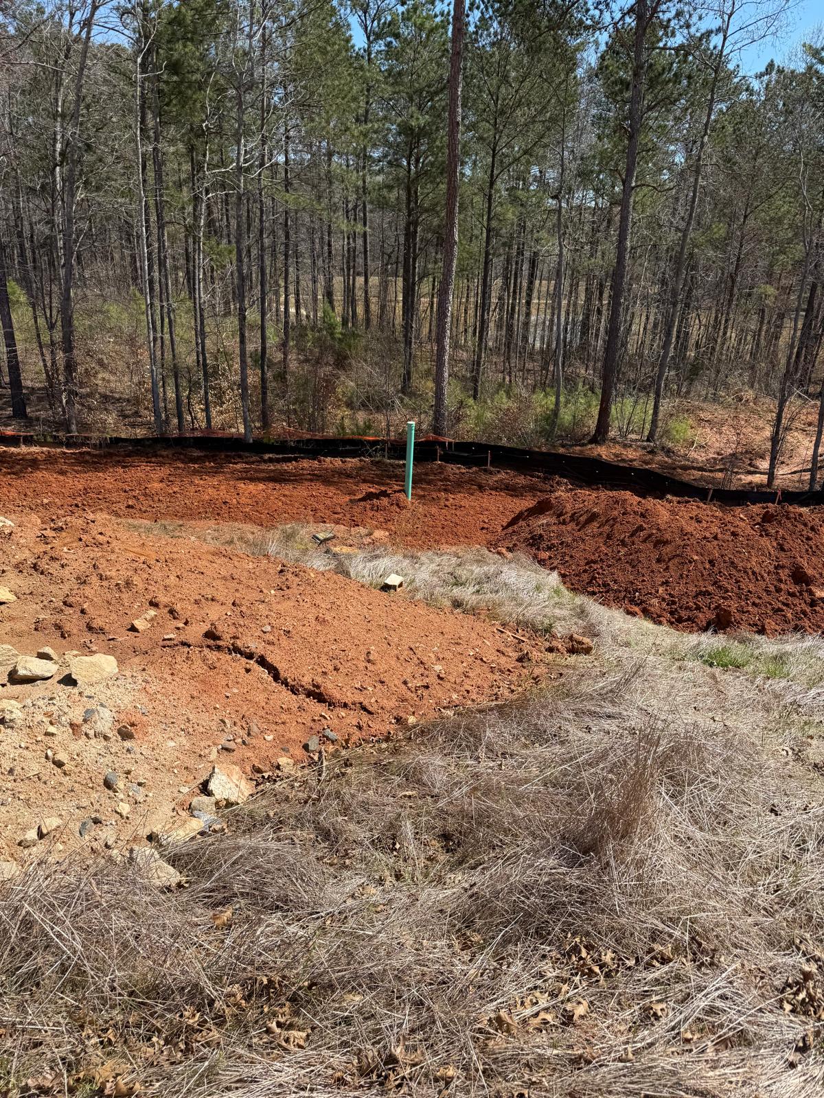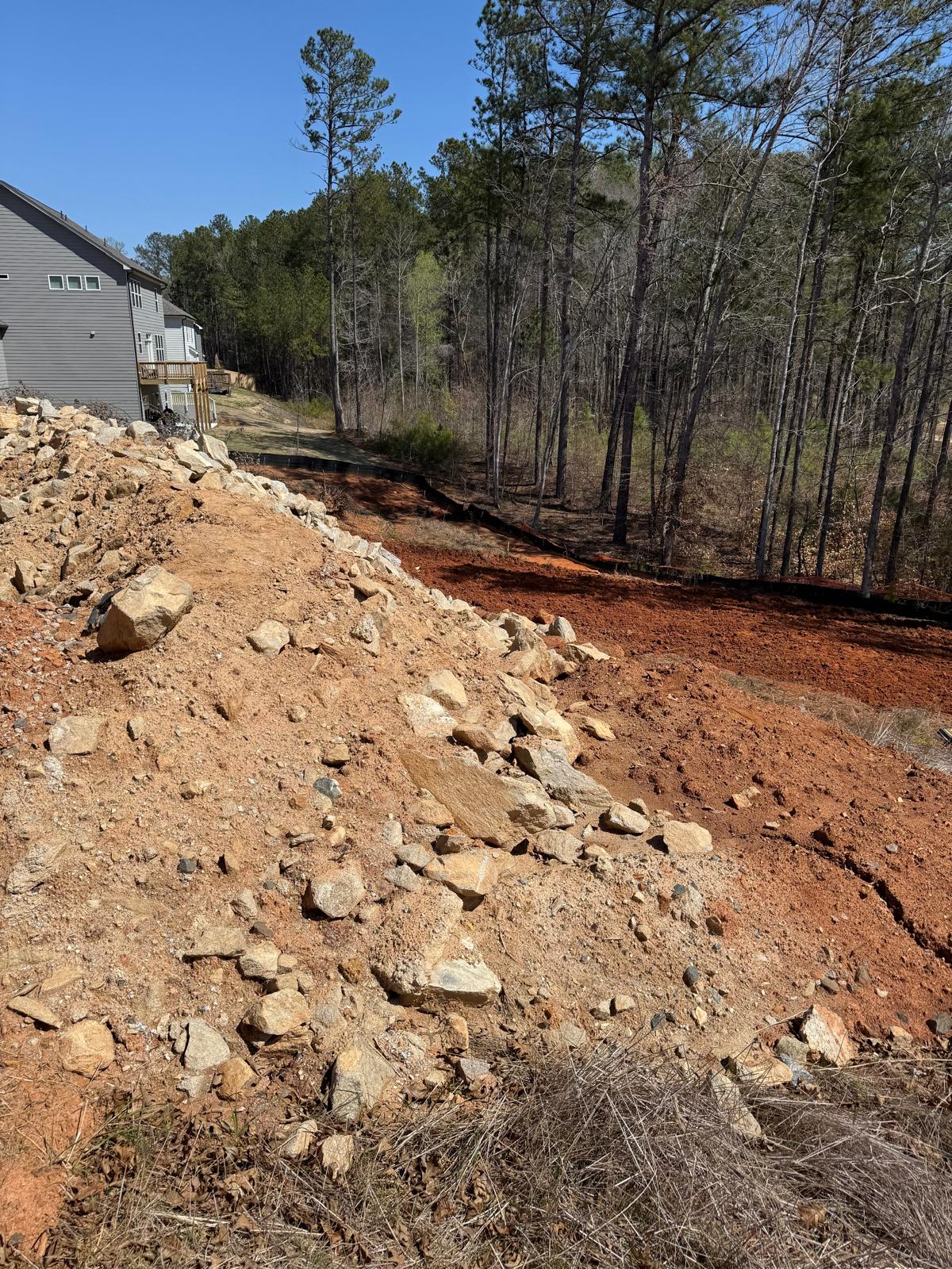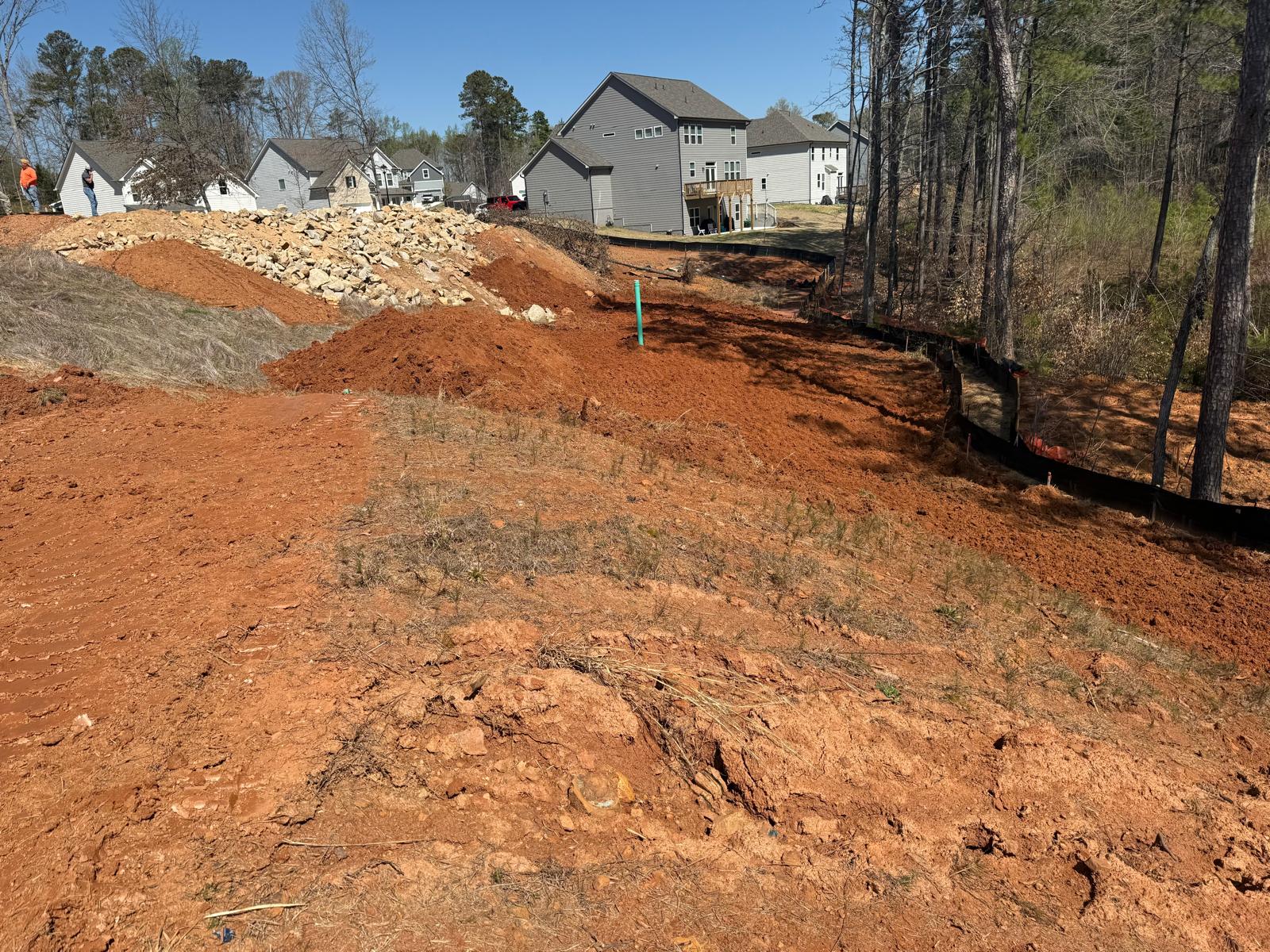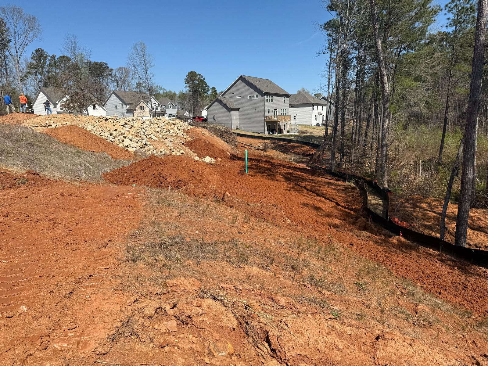 The work has commenced behind Lots #225, 226, and 227. The excavation for the retaining wall has been initiated, with a cut being made using a Kobelco SK300LC excavator. The contractor has successfully removed soft grey soils to suitable, stable soils.