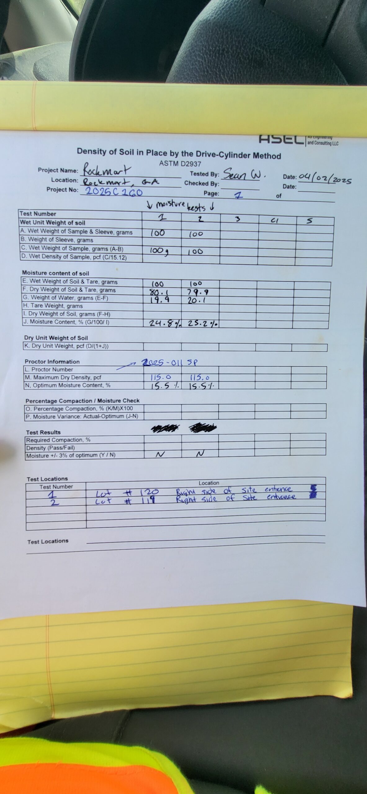 On the above date, our AS Engineering & Consulting representative was on site as requested by the contractor (HB NEXT). The technician observed the placement of fill soils – in approximately 8in lifts – in the approximate location of Lot #119 and Lot #120 (Phase 1 plans) to approximately 4 feet below finished grade. The technician observed a proof-roll of the approximate location of Lot #119. The proof-roll showed no signs of severe pumping and/or rutting. Moisture content tests were performed which resulted in approximately 25% moisture content. Optimum moisture content for the material proctor is approximately 15.5%. Our representative advised the head contractor (Randy) of the results and recommended to spread the fill out and allow it to aerate to reduce in-situ moistures prior to replacement and recompaction.