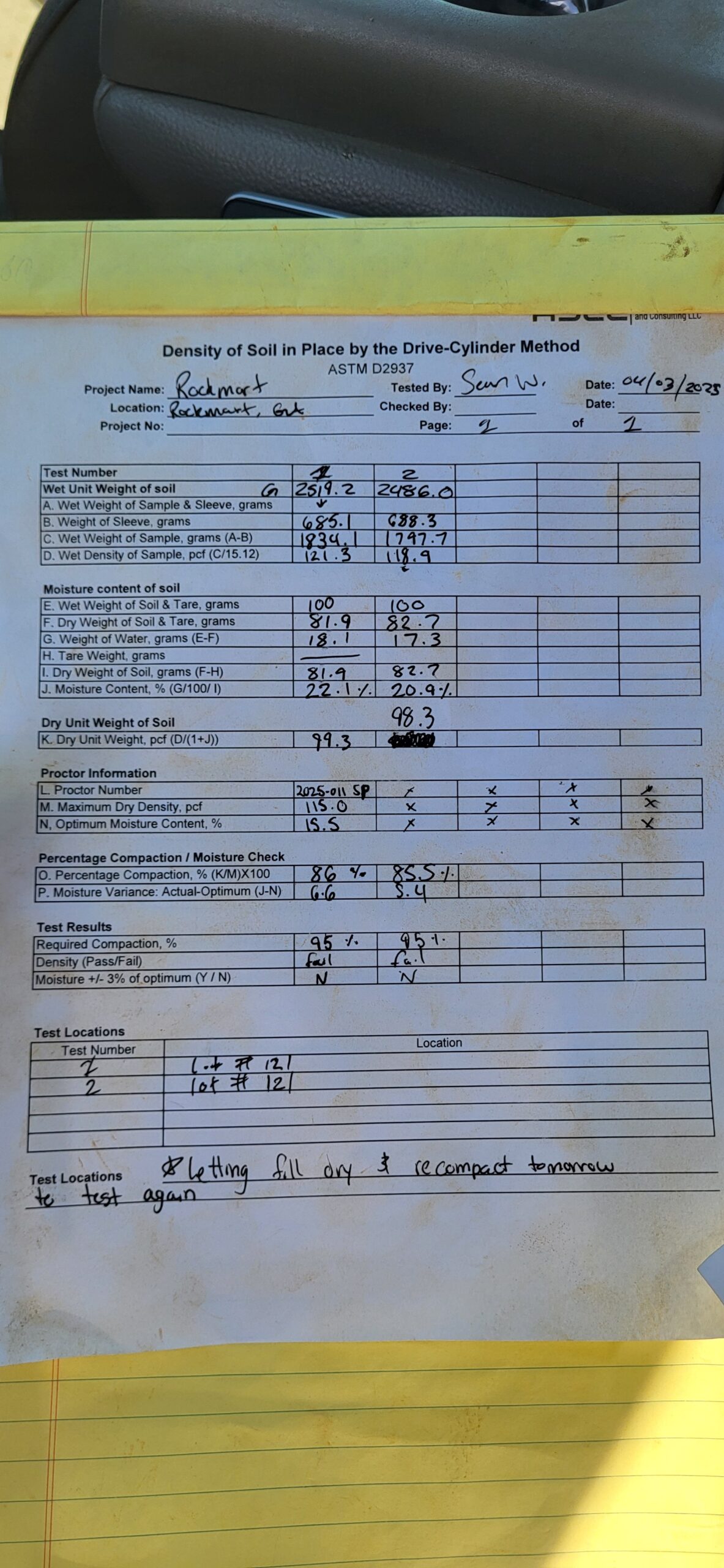Our ASEC representative was onsite as requested by the contractor (Willbanks) for the observation/testing of soil placement. Our representative observed a proof-roll for the approximate location of Lots #121, through #126. The proof-roll displayed not signs of severe pumping and/or rutting. A moisture content test of the fill placed was taken and found to be 20 to 23%. Fill was placed in approximately 8in lifts. The contractor was notified of the high moisture contents and recommended spreading the fill to allow it to aerate to approximately 15.5% (+/- 3%) moisture content. The contractor agreed and began placing fill in approximately 8in lifts on the proof rolled lots to allow it to dry before compaction. Compaction tests were approximately 86% for Lot #121. The contractor was recommended to allow ample time for drying, and to recompact the materials tomorrow to retest for compaction. Proof-rolling of Lot #33 was performed with of which no severe pumping/rutting was observed.