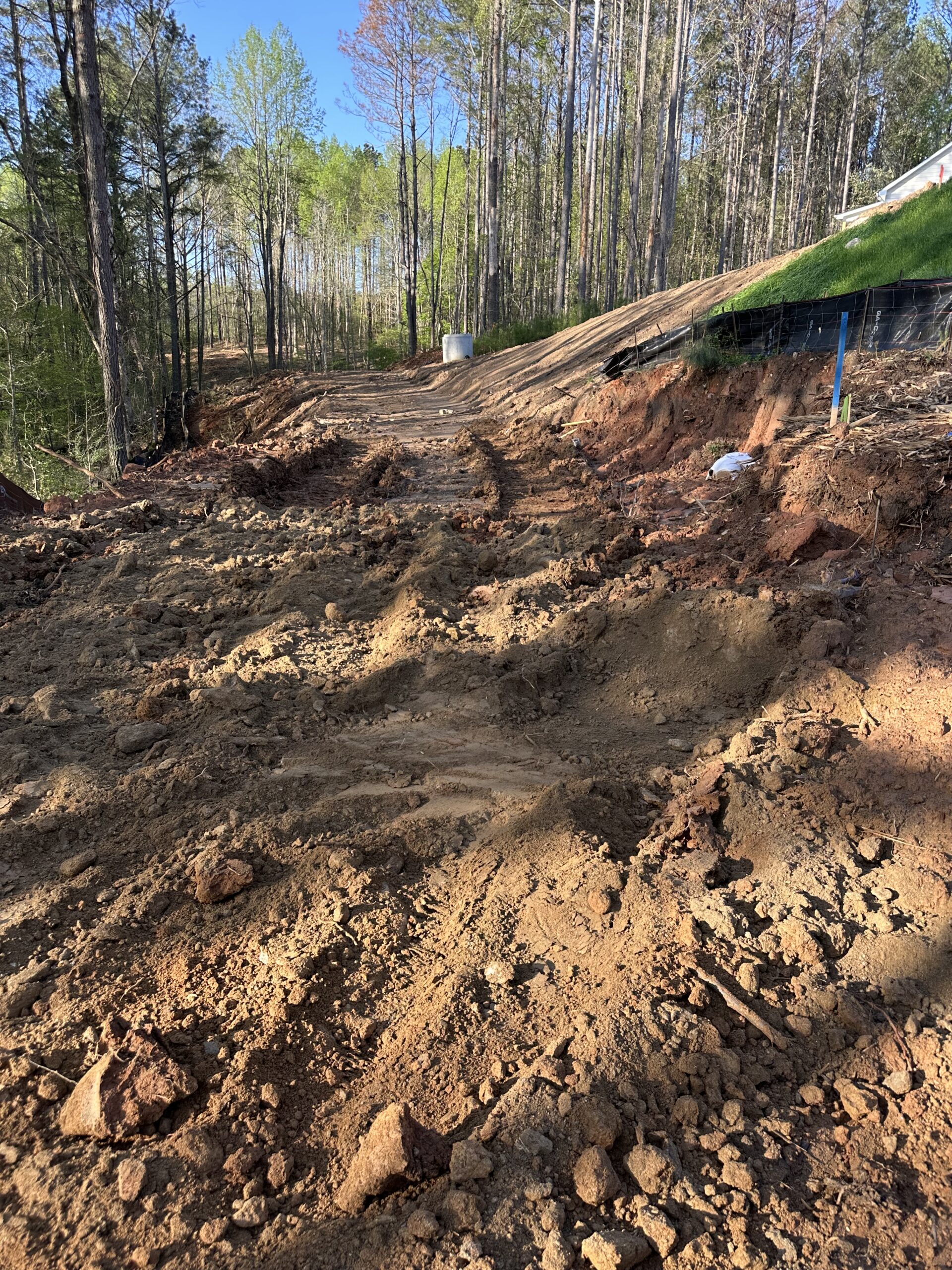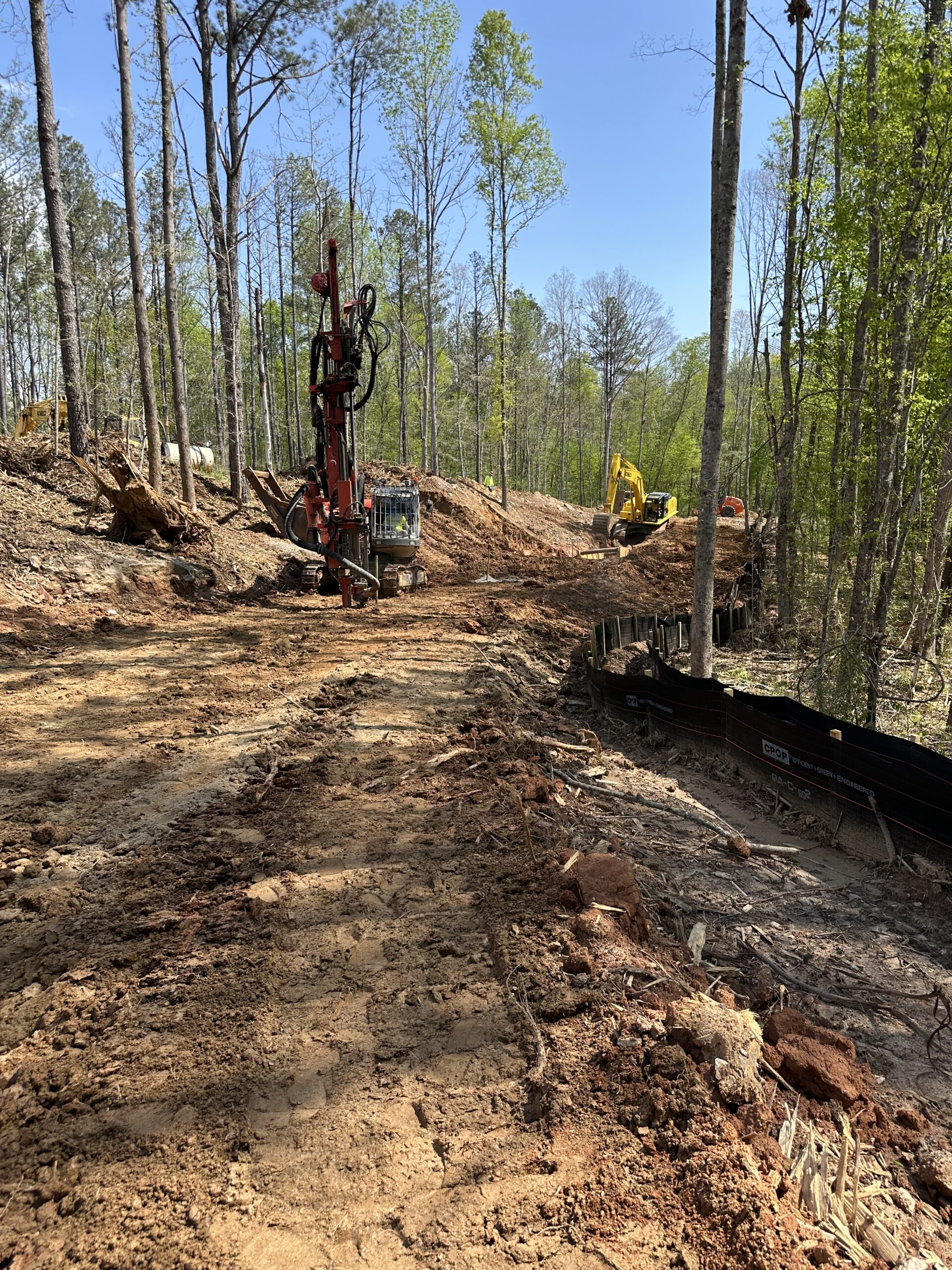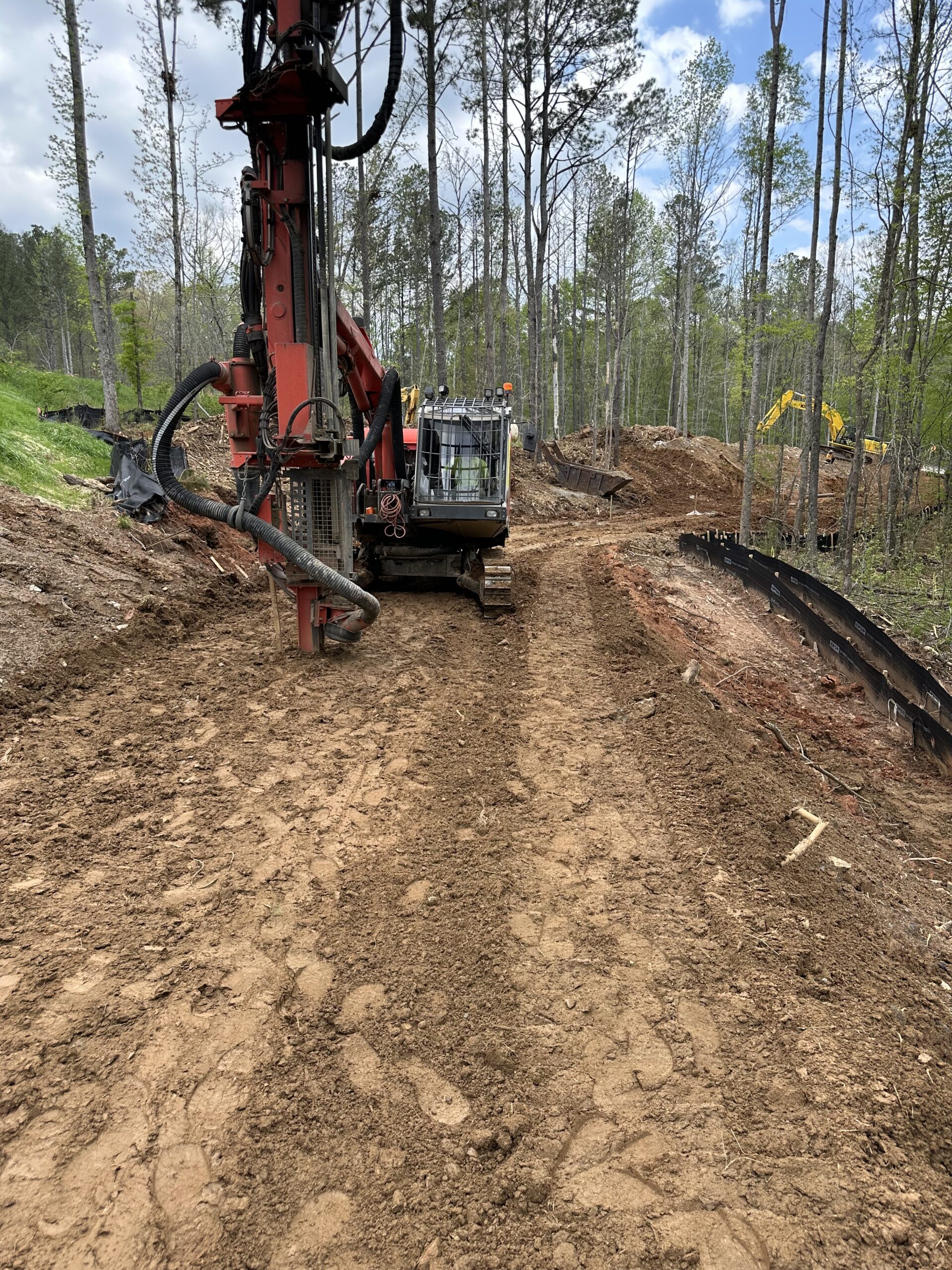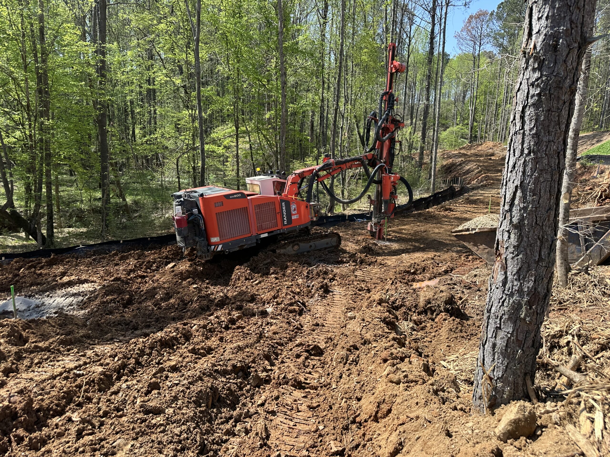 A Ranger DX800 (see attached photos) was mobilized to the site to perform test borings. A total of 11 test borings were completed in-line with the proposed sewer path. Drilling was conducted by Nick from Advanced Explosives, progressing from north to south. Test borings were spaced approximately 30 feet apart, aligned along the centerline as staked by the onsite grading company foreman (see photo).