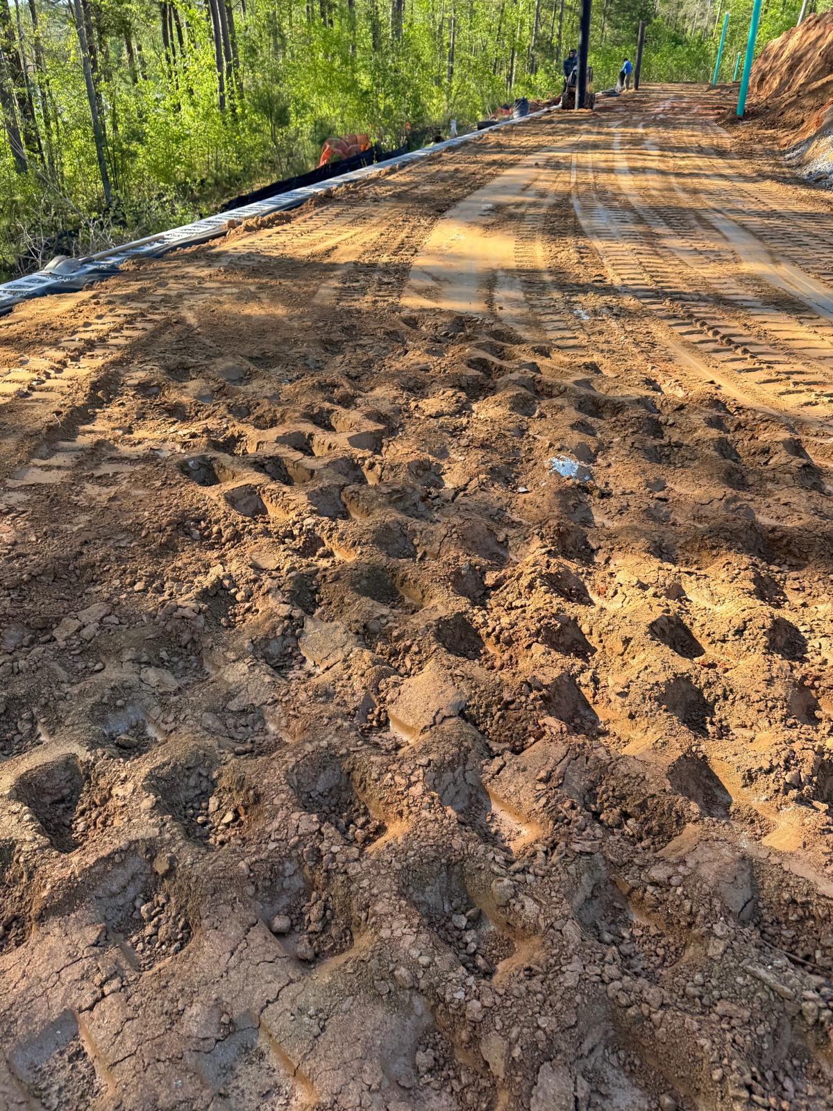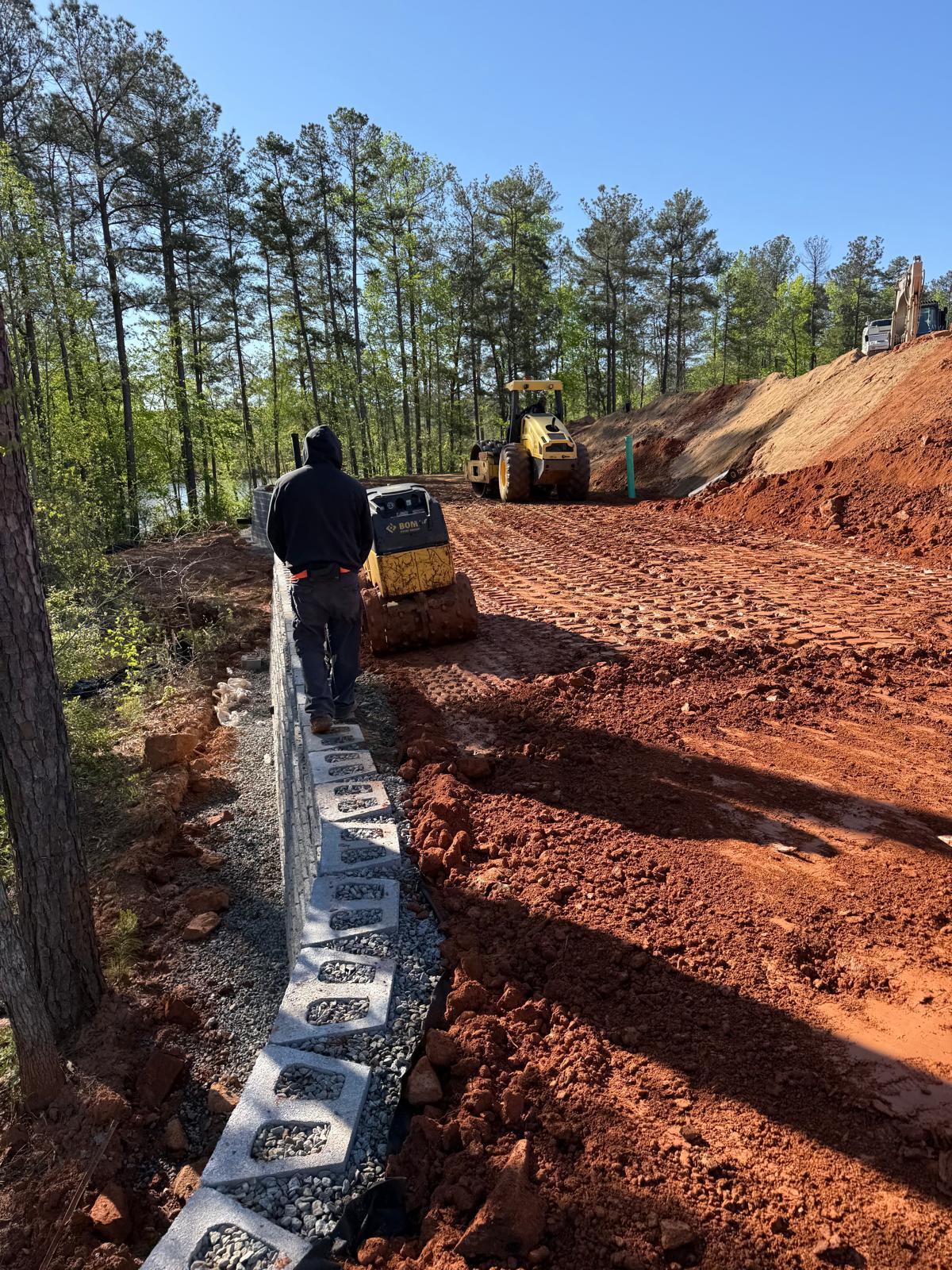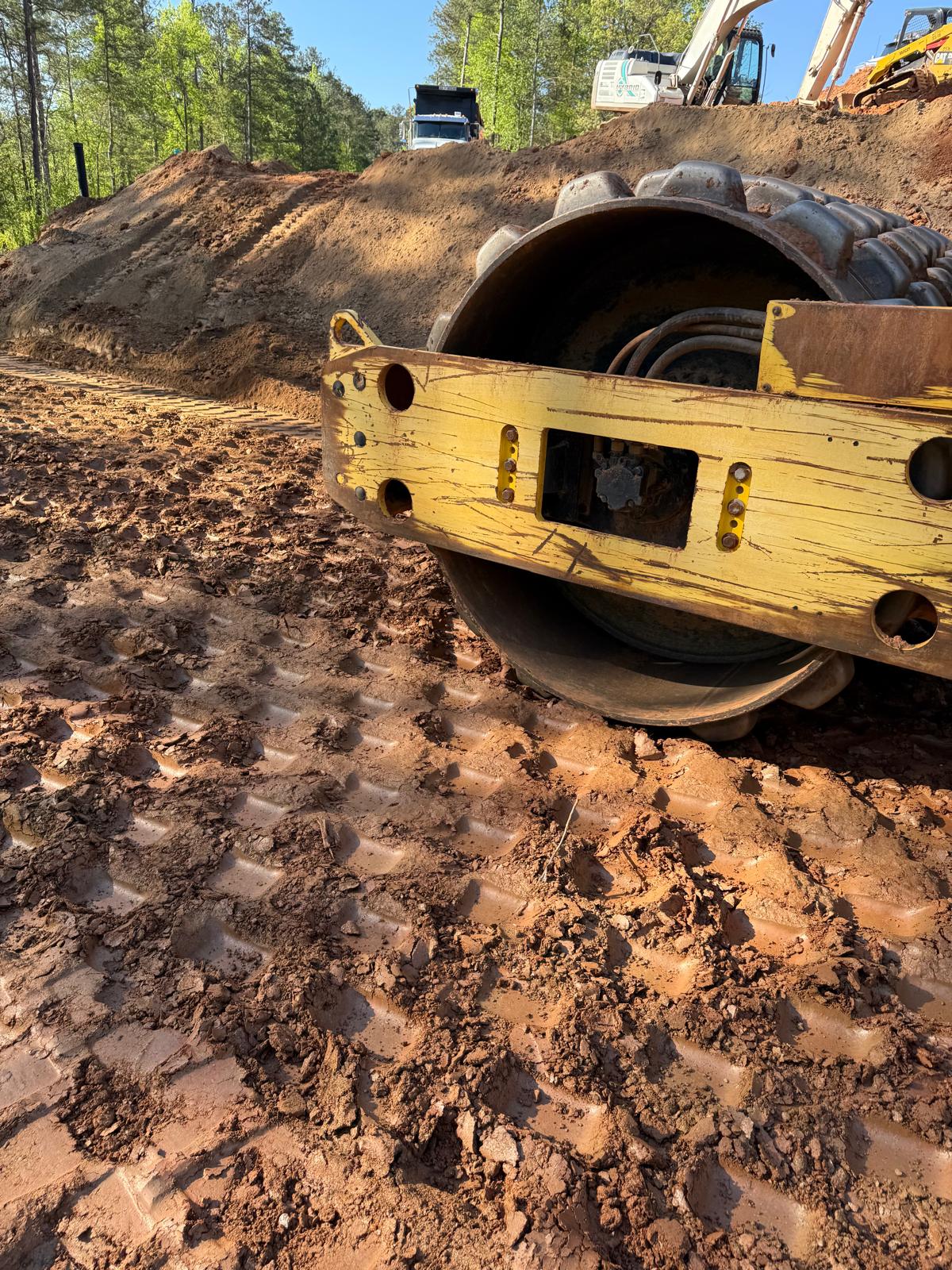 Focusing on backfilling and compaction operations behind the newly installing retaining wall sections along Lots #224–#229.  Following the drainage installation, the next layer of backfill was placed over the previously installed geogrid reinforcement sheet, in preparation for subsequent compaction. Excavation and placement of fill material was conducted using a Kobelco 310LC excavator and transported on site with a CAT 750 dump truck. Subsequent to placement, two Takeuchi TL12R2 Bobcats were used to distribute the fill uniformly along Lots #224–#229. Once the fill was evenly spread, compaction was carried out using a Bomag BW211 sheep foot compactor in combination with a Bomag RR-106 roller. A new type of soil material was borrowed today, and a sample of this material was dropped by the ASEC laboratory for a Moisture-Density relationship (proctor).