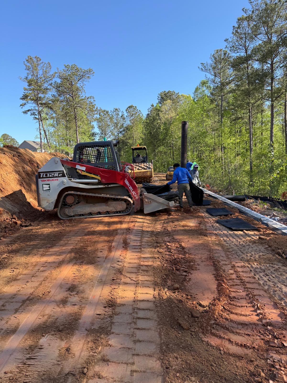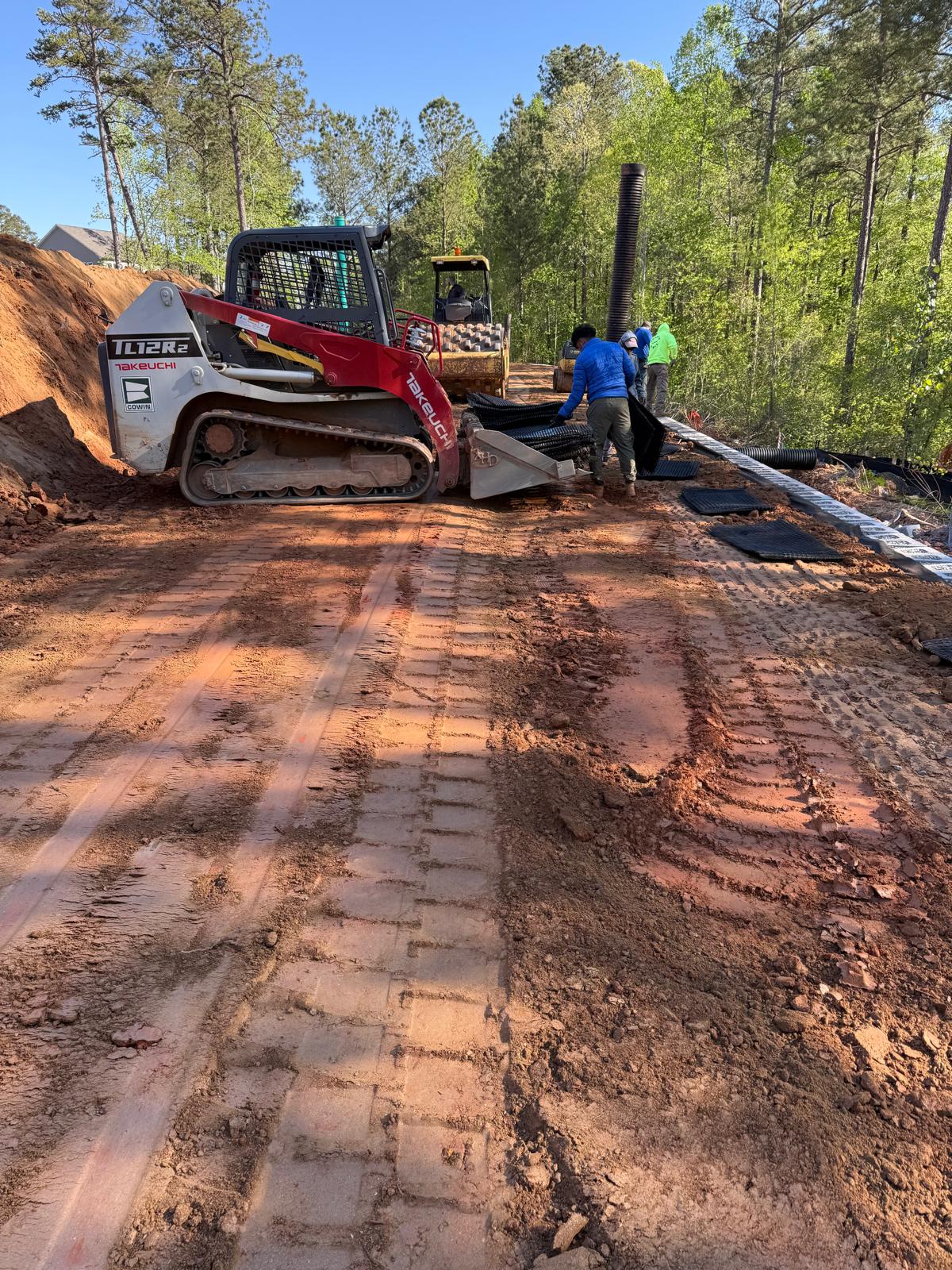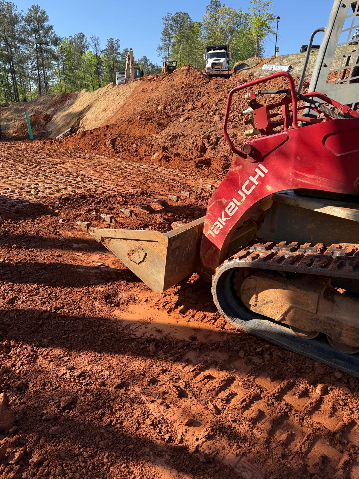 Focusing on backfilling and compaction operations behind the newly installing retaining wall sections along Lots #224–#229.  Following the drainage installation, the next layer of backfill was placed over the previously installed geogrid reinforcement sheet, in preparation for subsequent compaction. Excavation and placement of fill material was conducted using a Kobelco 310LC excavator and transported on site with a CAT 750 dump truck. Subsequent to placement, two Takeuchi TL12R2 Bobcats were used to distribute the fill uniformly along Lots #224–#229. Once the fill was evenly spread, compaction was carried out using a Bomag BW211 sheep foot compactor in combination with a Bomag RR-106 roller. A new type of soil material was borrowed today, and a sample of this material was dropped by the ASEC laboratory for a Moisture-Density relationship (proctor).