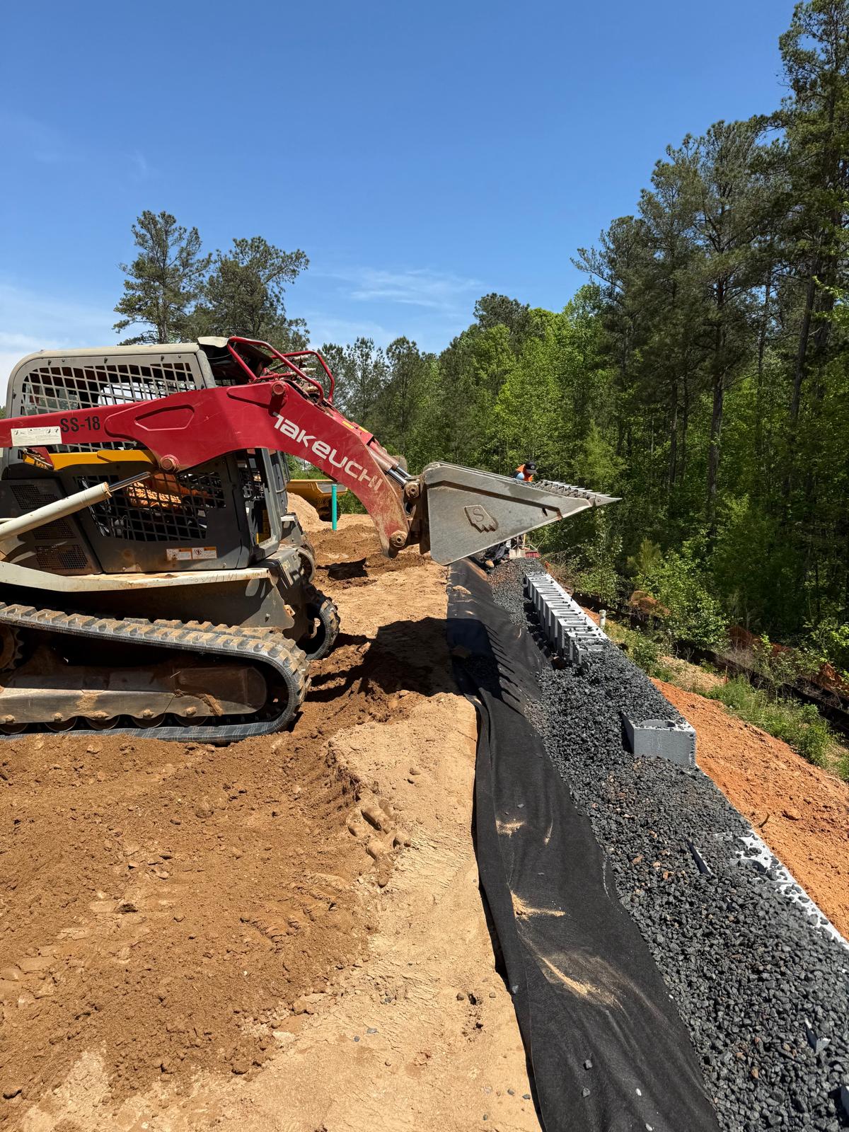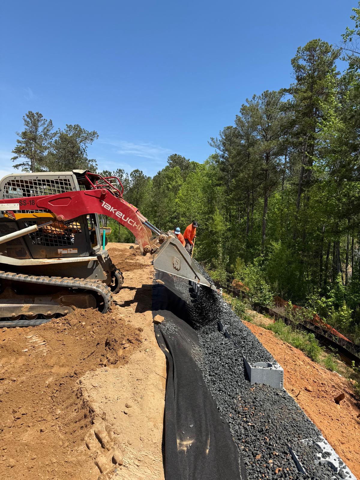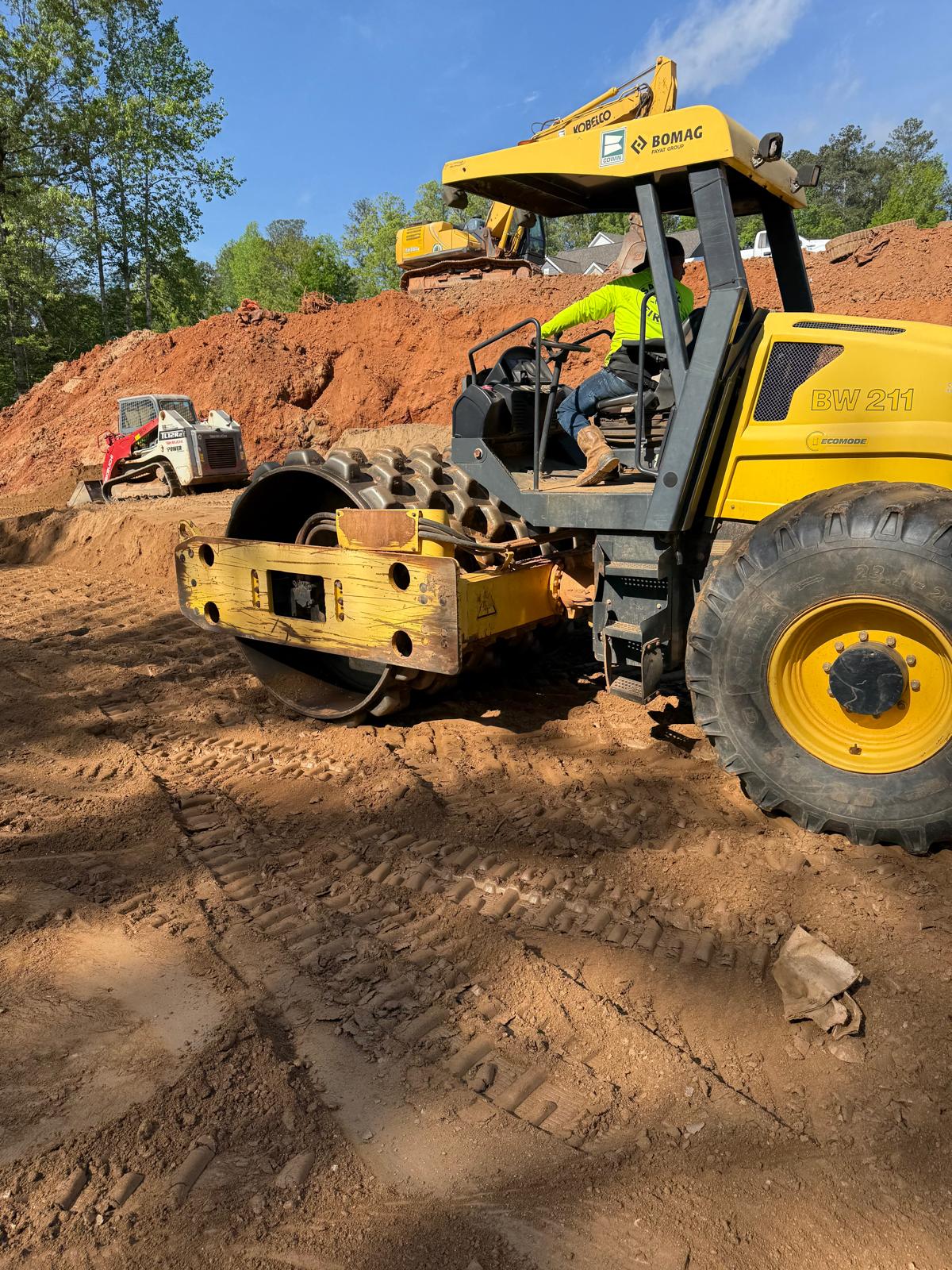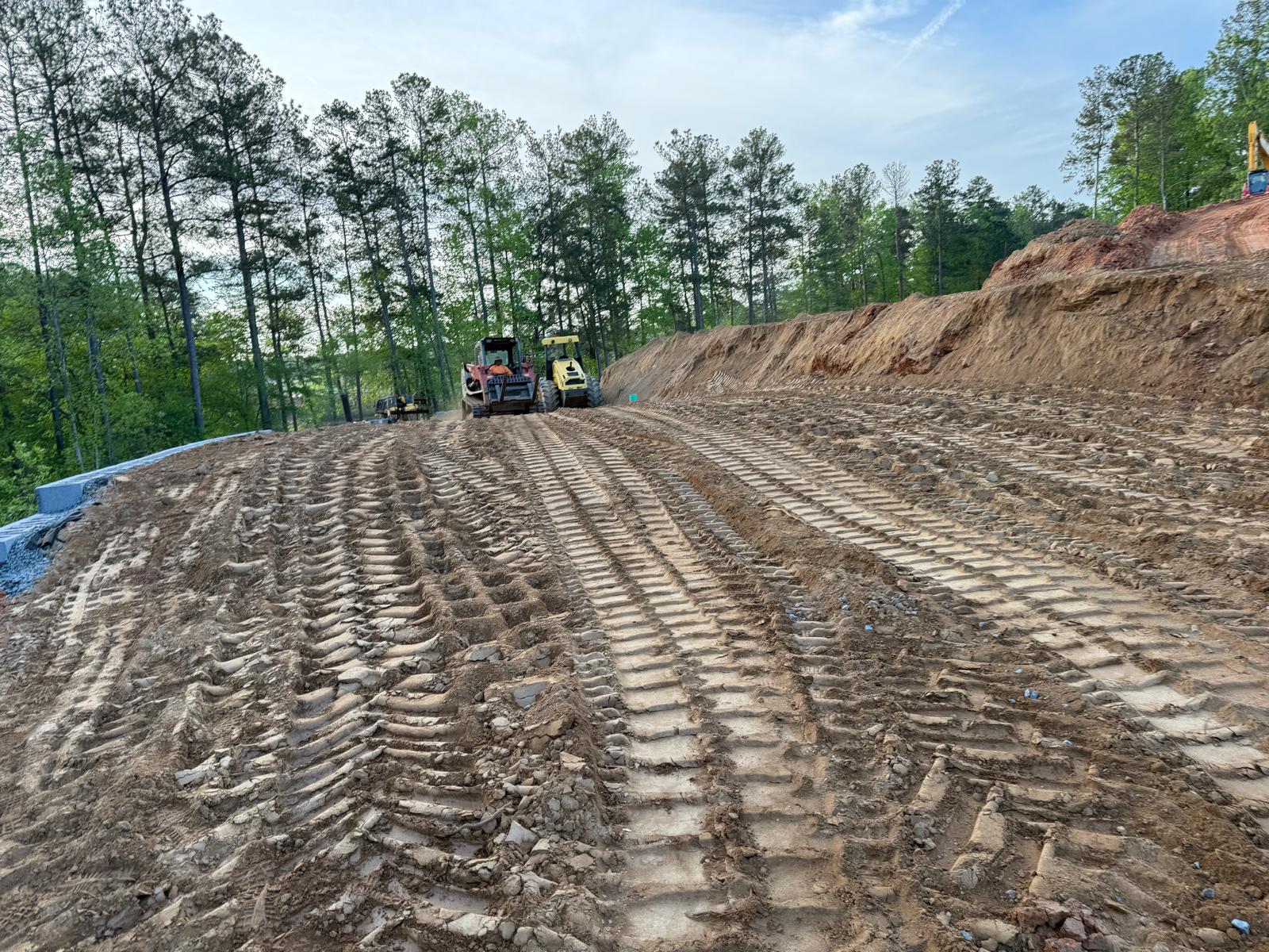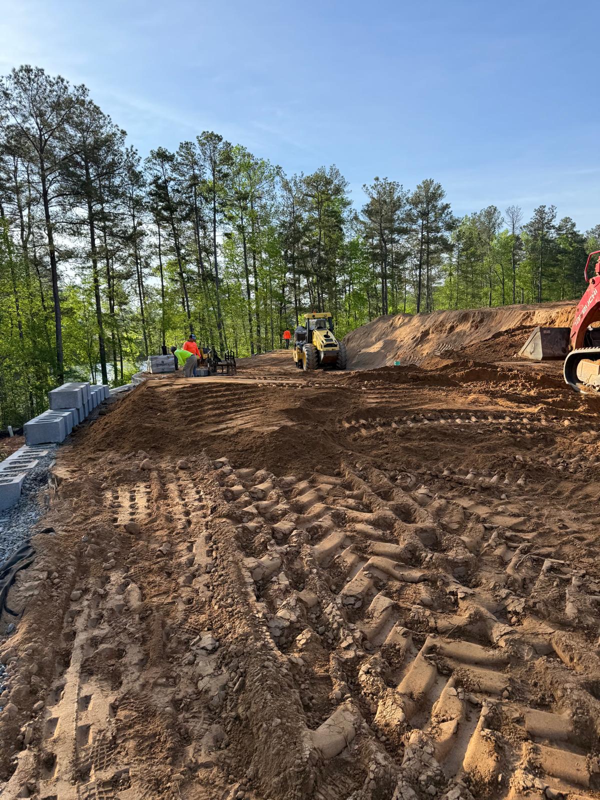 Focusing on backfilling and compaction operations behind the newly installing retaining wall structure along Lots #224–3229, Following the drainage installation, the next layer of backfill was placed over the previously installed geogrid reinforcement sheet, in preparation for subsequent compaction. Excavation and placement of fill material was conducted using a Kobelco 310LC excavator and transported on site with a CAT 750 dump truck. Subsequent to placement, two Takeuchi TL12R2 Bobcats were used to distribute the fill uniformly along Lots #224–3229. Once the fill was evenly spread, compaction was carried out using a Bomag BW211 sheep foot compactor roller.