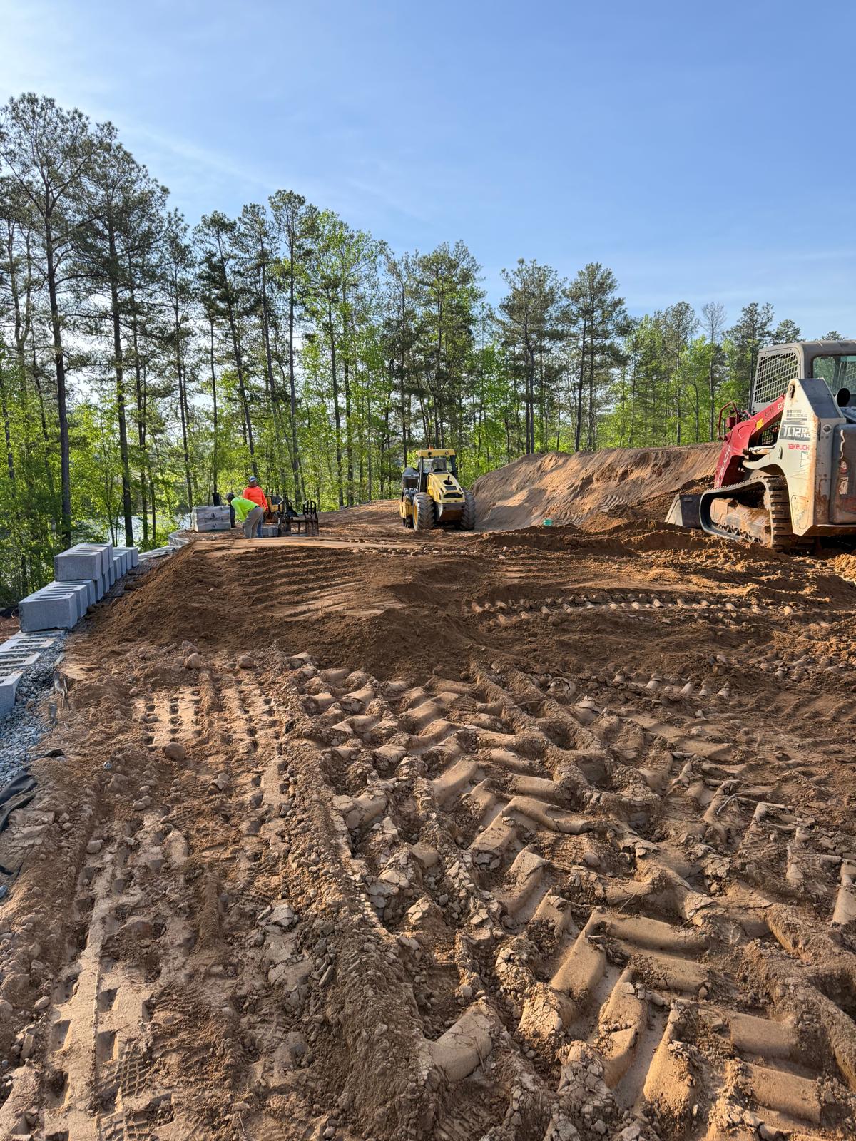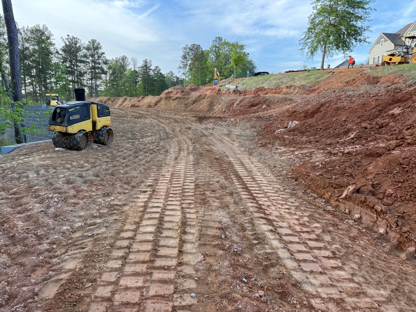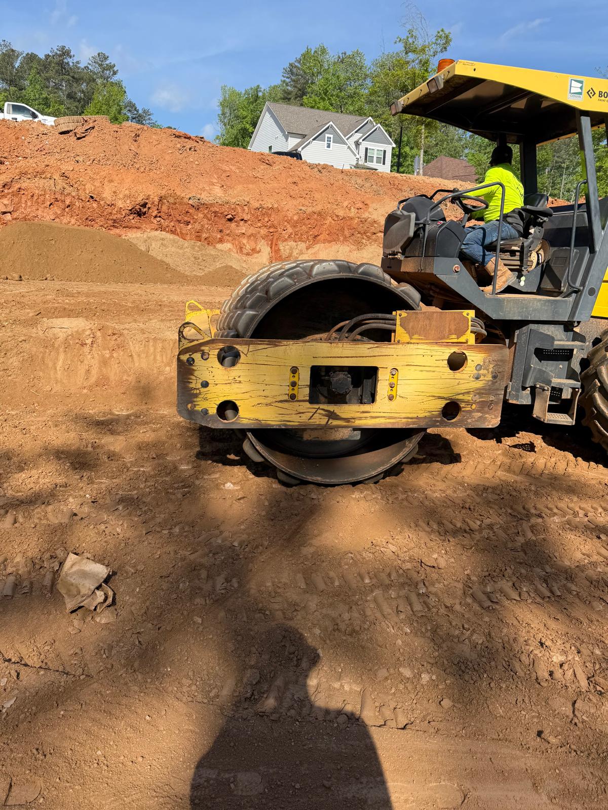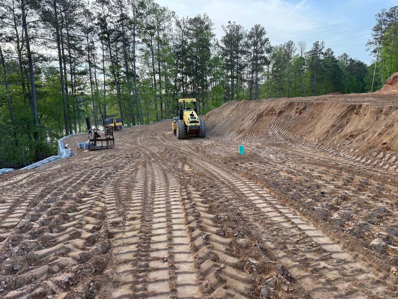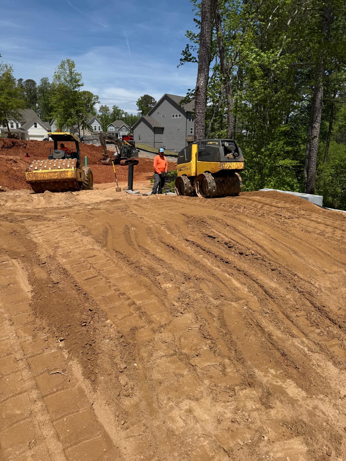 Focusing on backfilling and compaction operations behind the newly installing retaining wall structure along Lots #224–3229, Following the drainage installation, the next layer of backfill was placed over the previously installed geogrid reinforcement sheet, in preparation for subsequent compaction. Excavation and placement of fill material was conducted using a Kobelco 310LC excavator and transported on site with a CAT 750 dump truck. Subsequent to placement, two Takeuchi TL12R2 Bobcats were used to distribute the fill uniformly along Lots #224–3229. Once the fill was evenly spread, compaction was carried out using a Bomag BW211 sheep foot compactor roller.