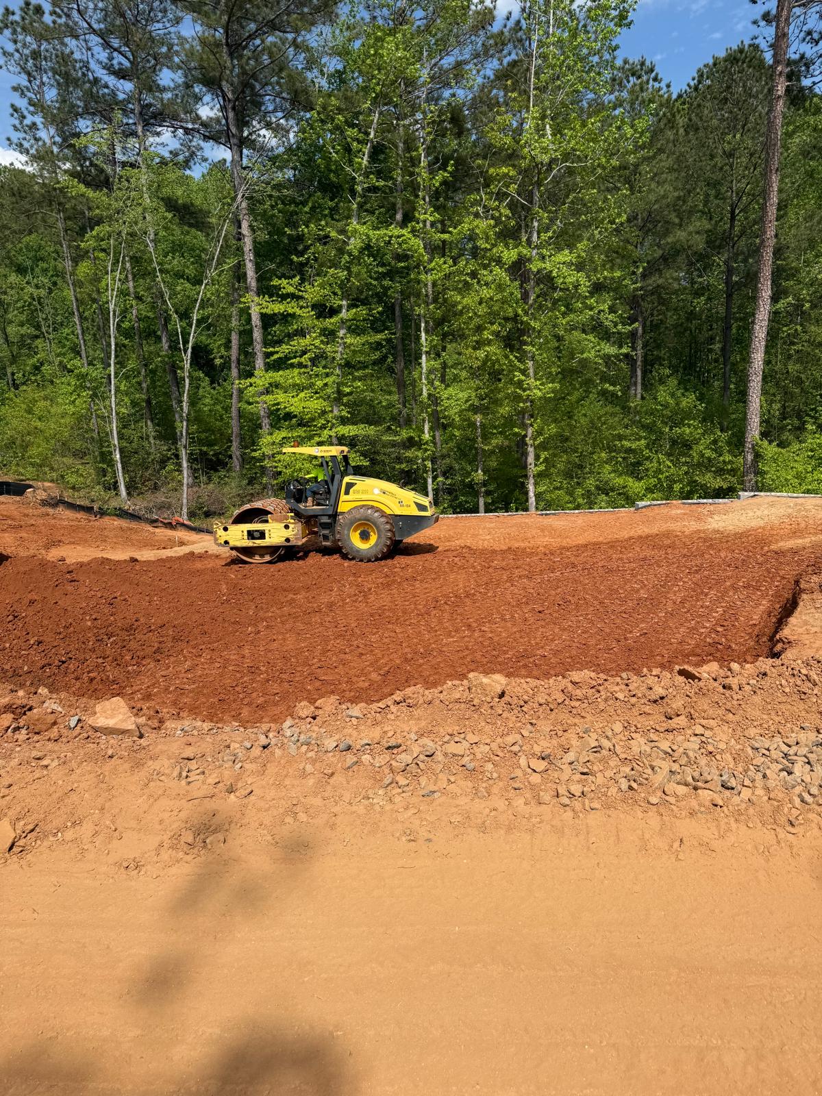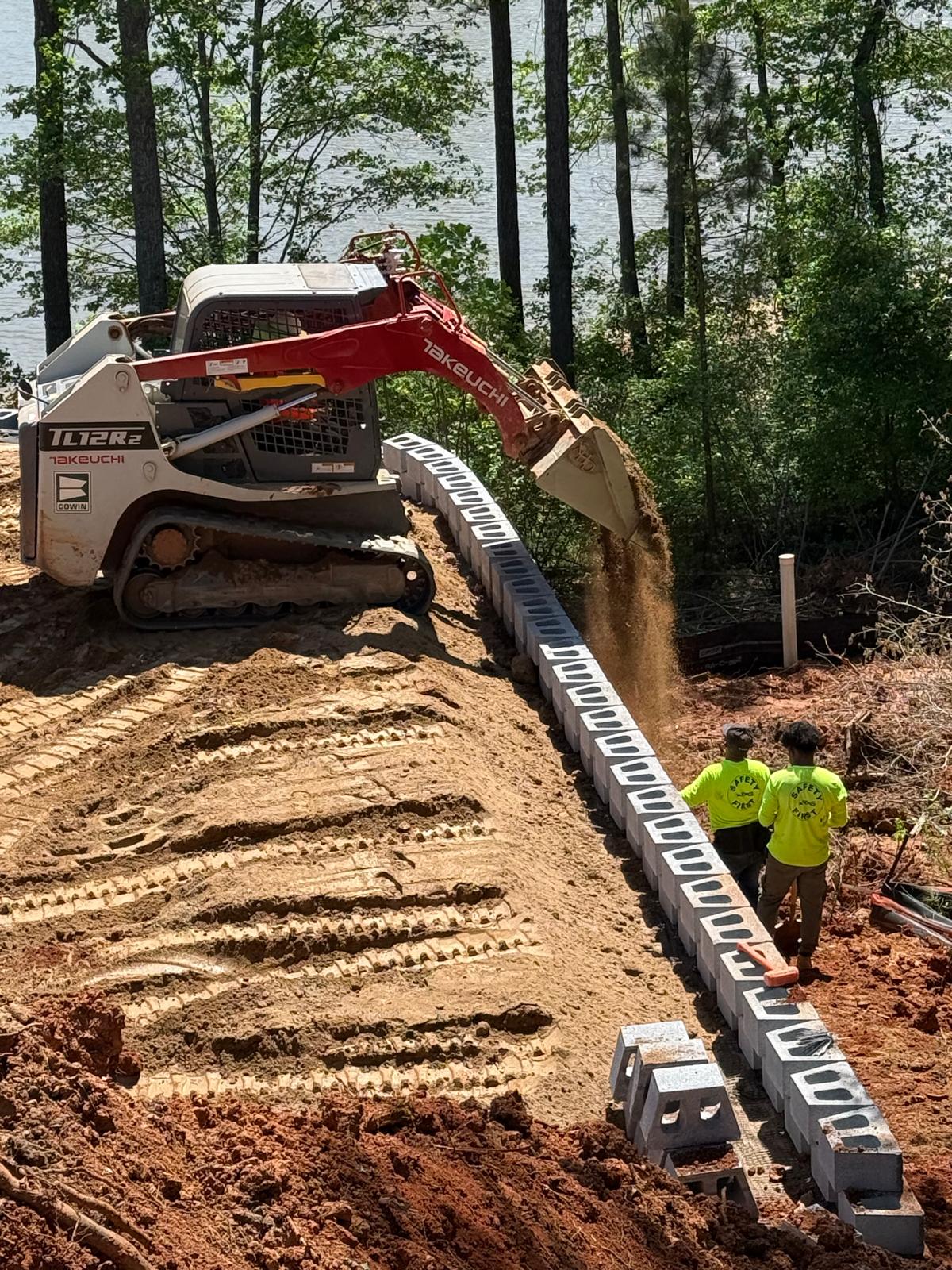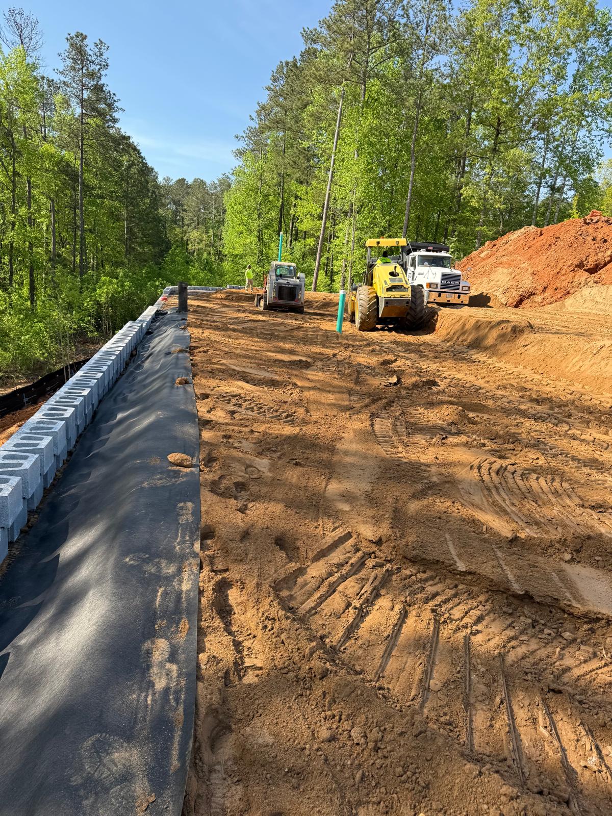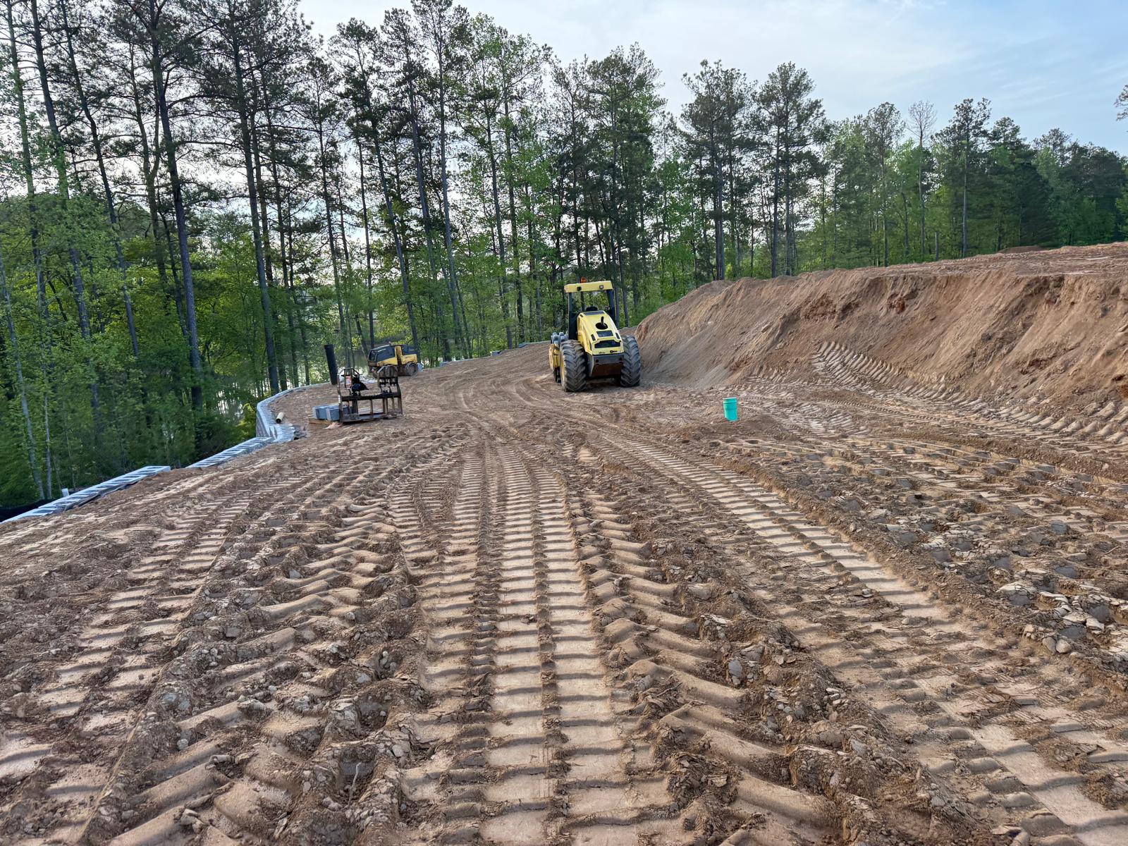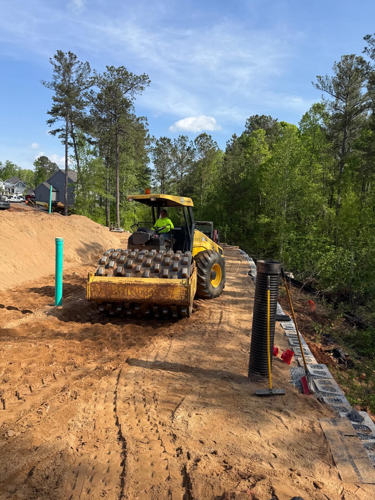 Focusing on backfilling and compaction operations behind the newly installing retaining wall structure along Lots #224–3229, Following the drainage installation, the next layer of backfill was placed over the previously installed geogrid reinforcement sheet, in preparation for subsequent compaction. Excavation and placement of fill material was conducted using a Kobelco 310LC excavator and transported on site with a CAT 750 dump truck. Subsequent to placement, two Takeuchi TL12R2 Bobcats were used to distribute the fill uniformly along Lots #224–3229. Once the fill was evenly spread, compaction was carried out using a Bomag BW211 sheep foot compactor roller.
