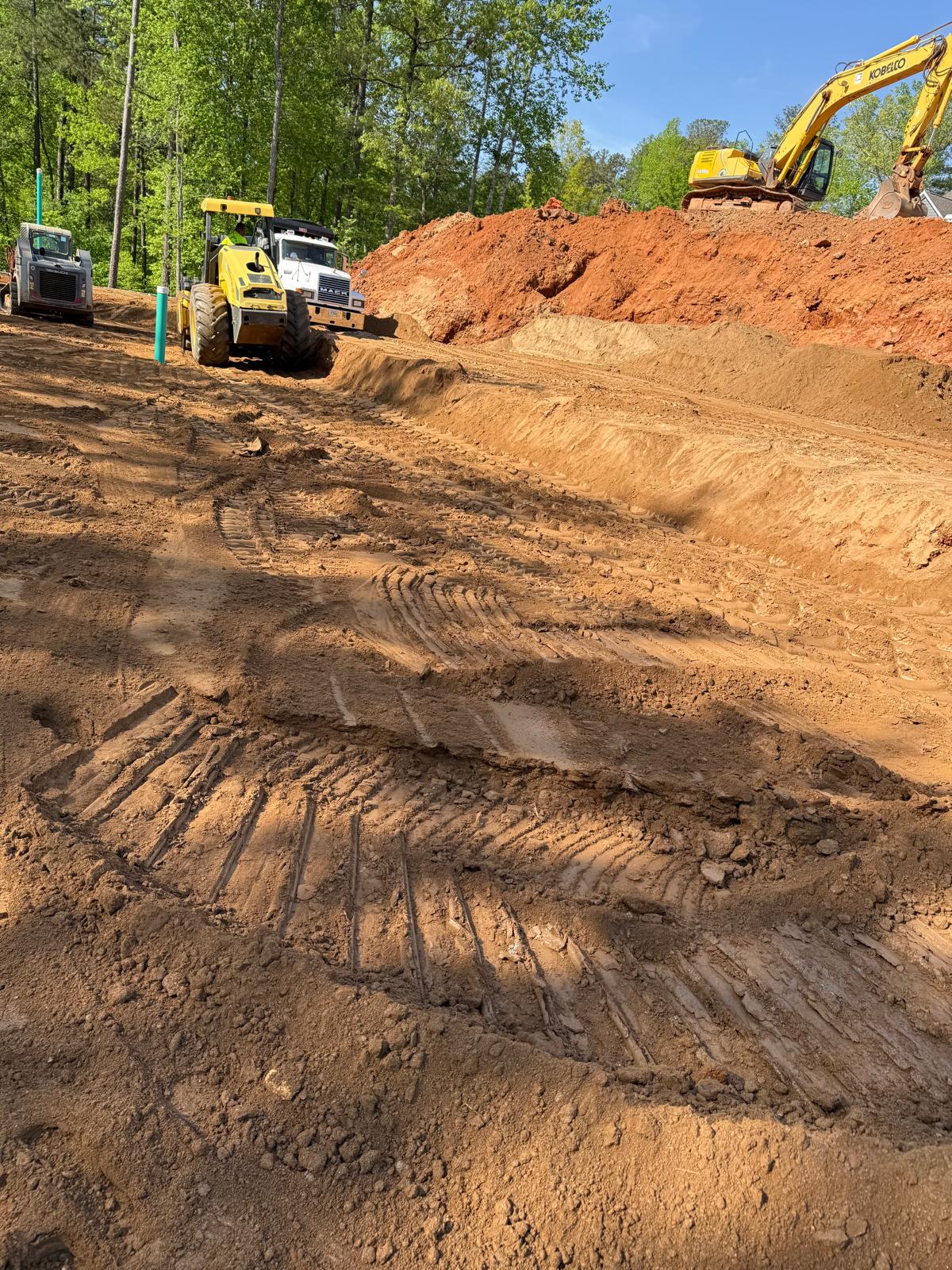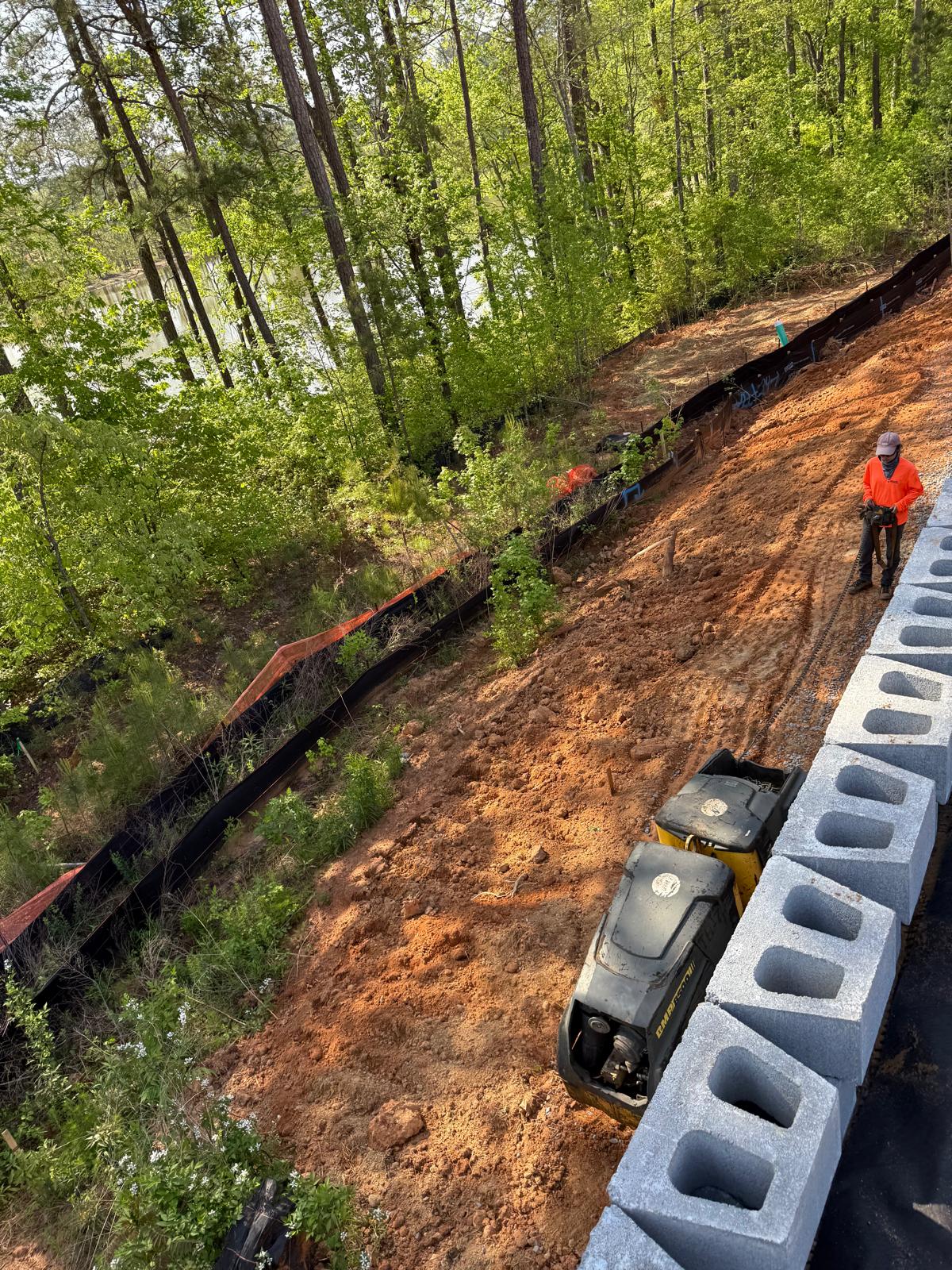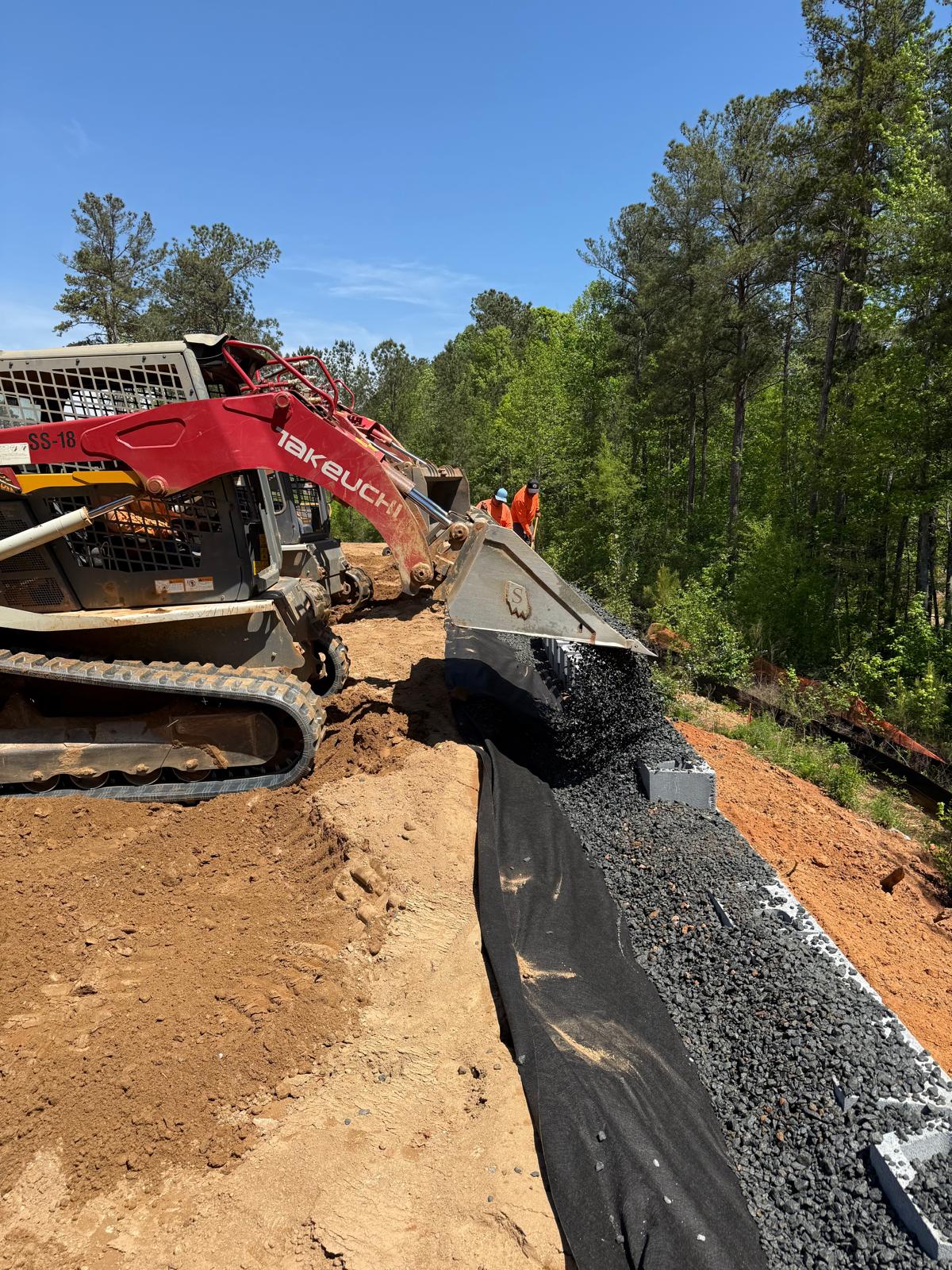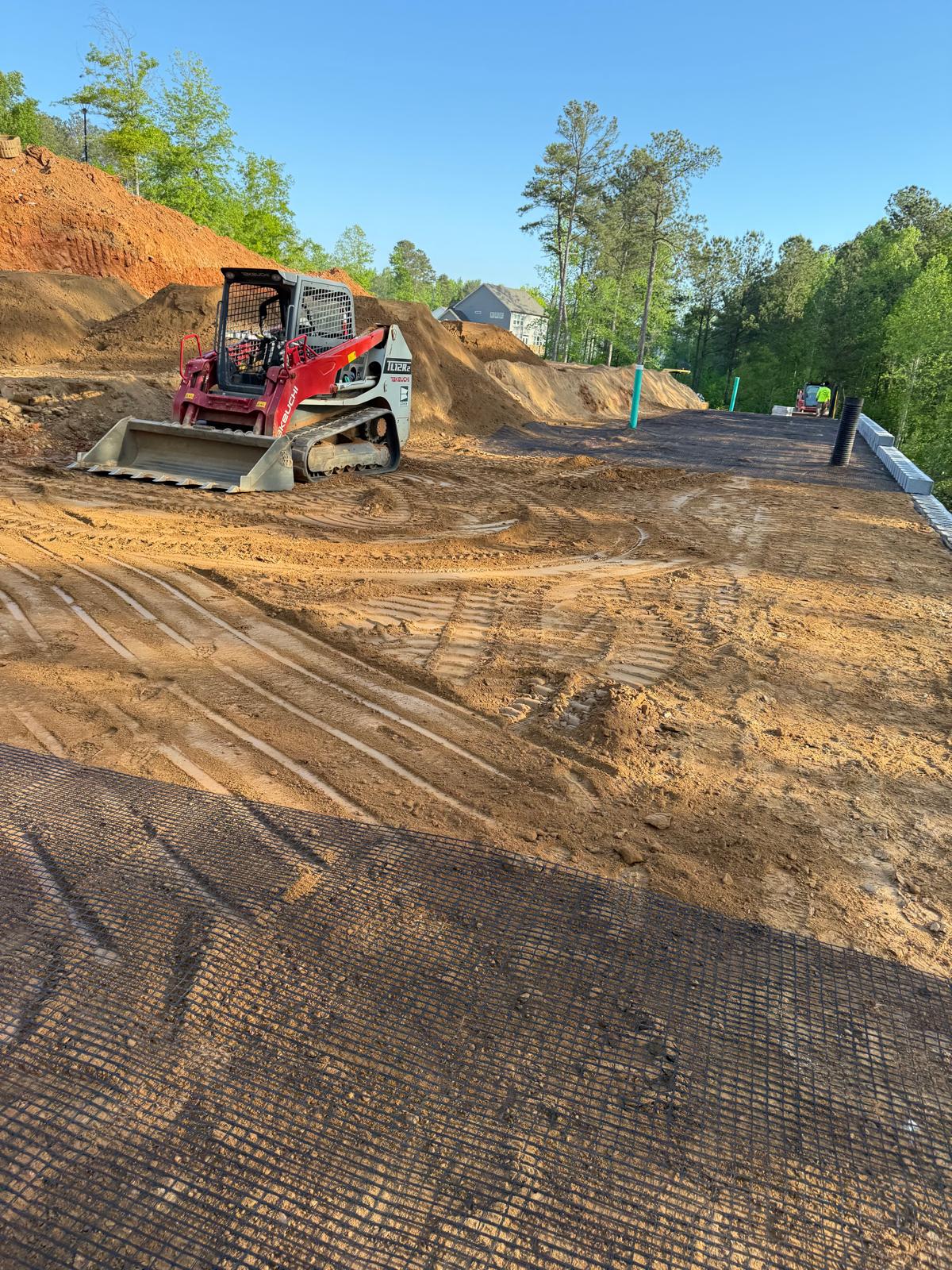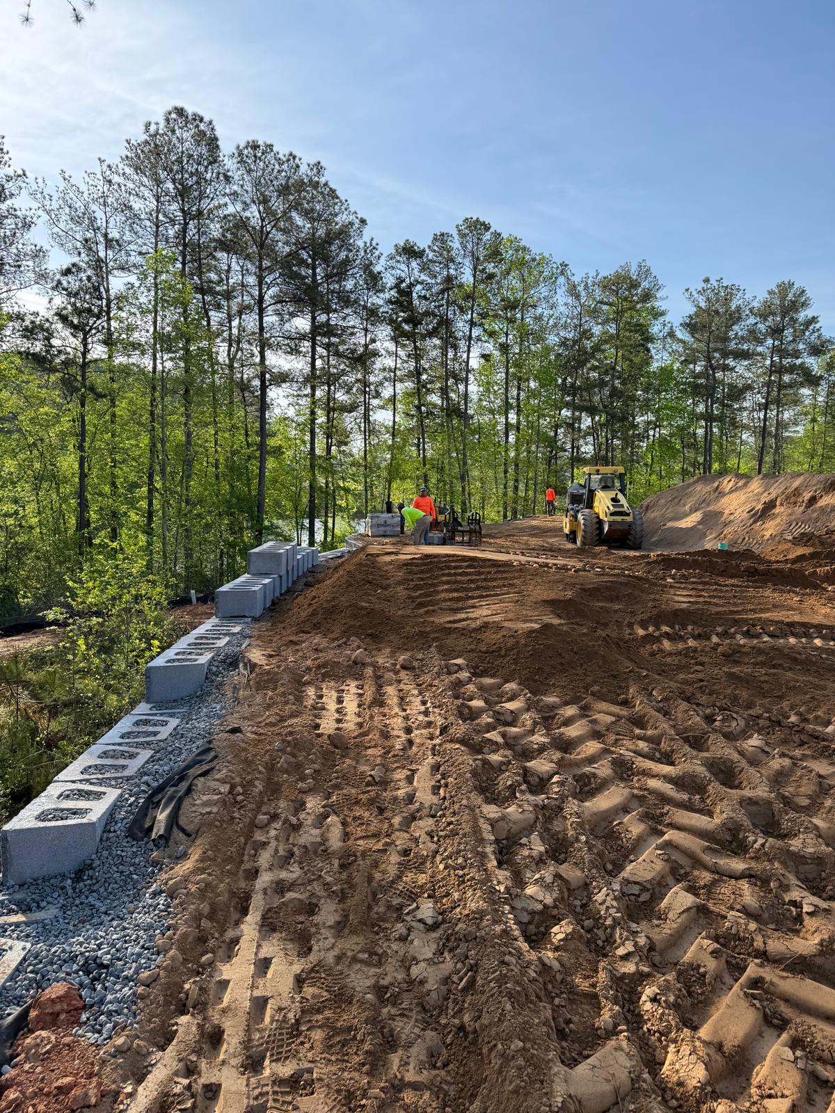Focusing on backfilling and compaction operations behind the newly installing retaining wall structure along Lots #224–3229, Following the drainage installation, the next layer of backfill was placed over the previously installed geogrid reinforcement sheet, in preparation for subsequent compaction. Excavation and placement of fill material was conducted using a Kobelco 310LC excavator and transported on site with a CAT 750 dump truck. Subsequent to placement, two Takeuchi TL12R2 Bobcats were used to distribute the fill uniformly along Lots #224–3229. Once the fill was evenly spread, compaction was carried out using a Bomag BW211 sheep foot compactor roller.