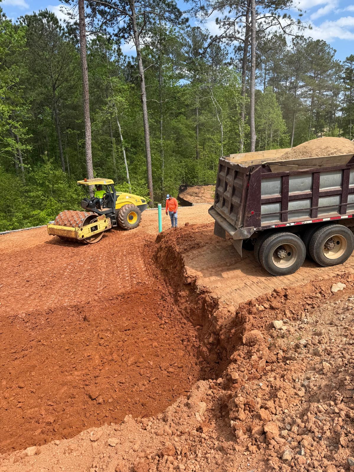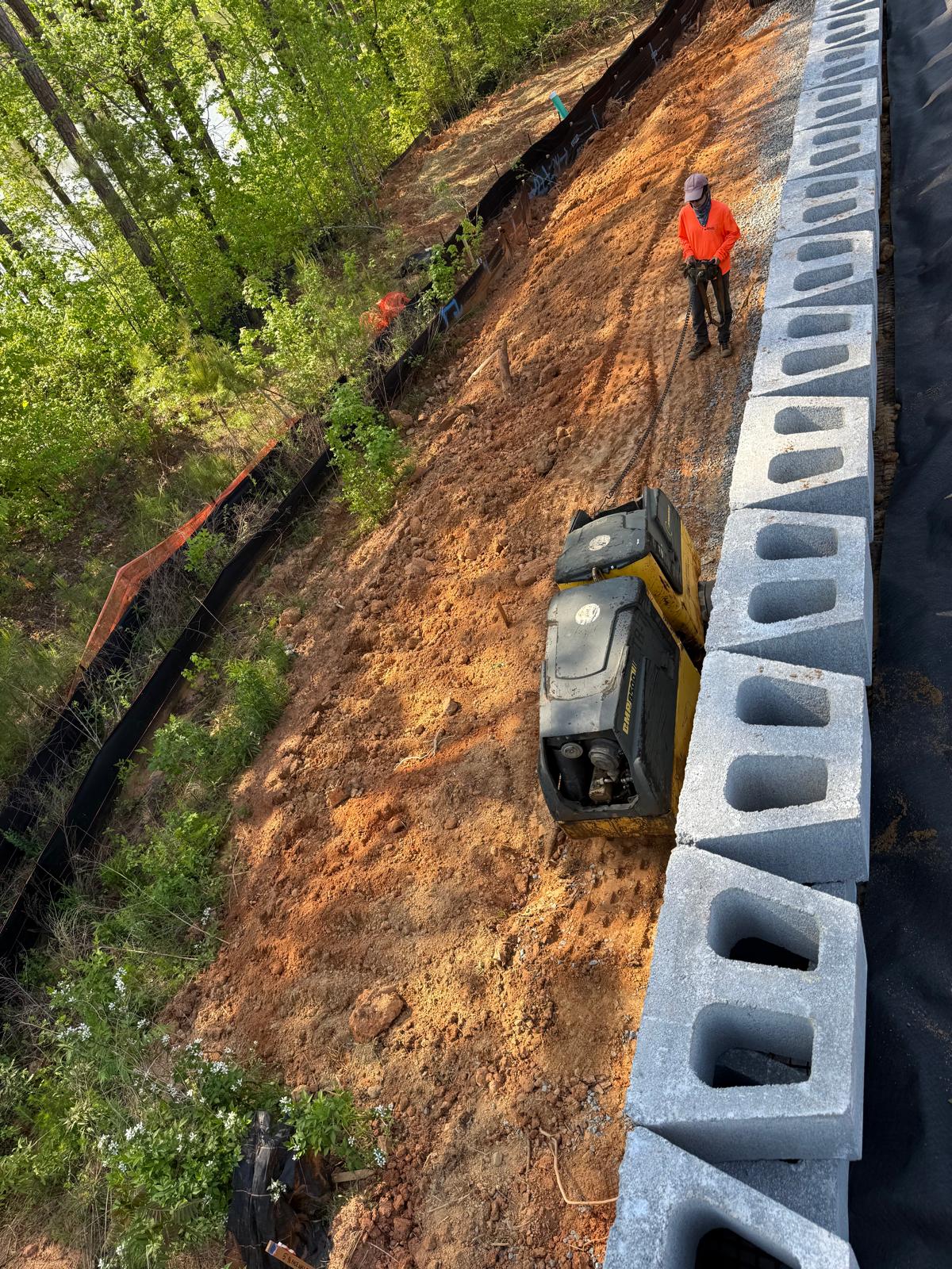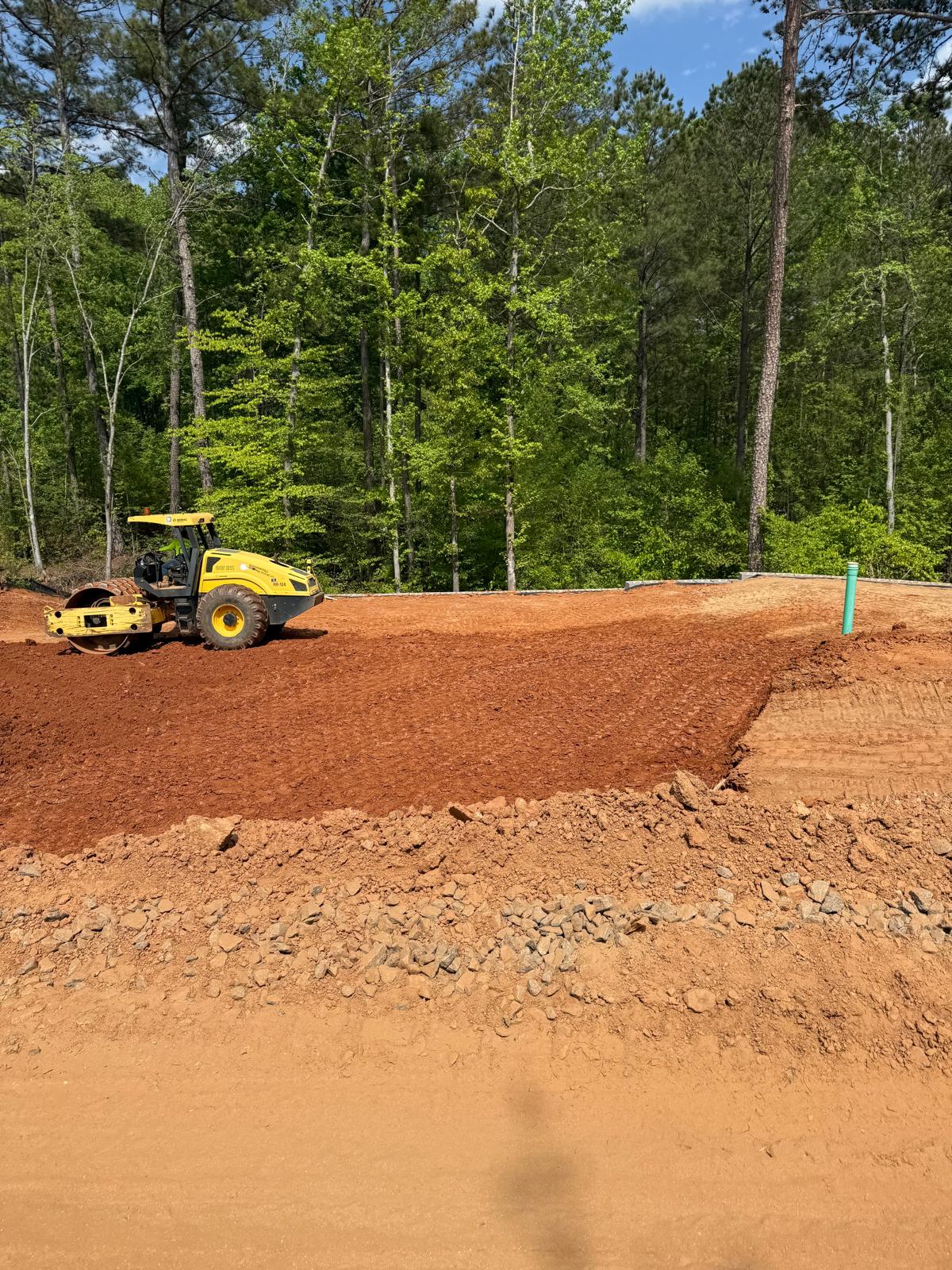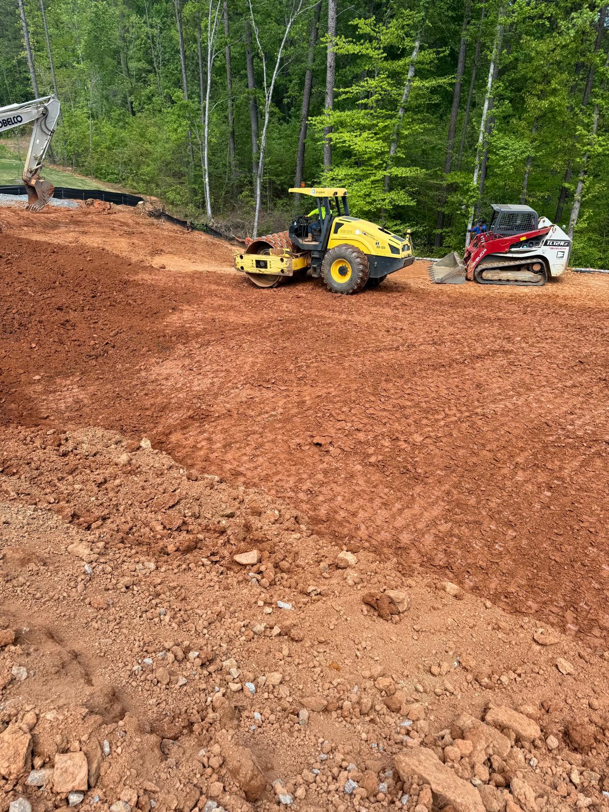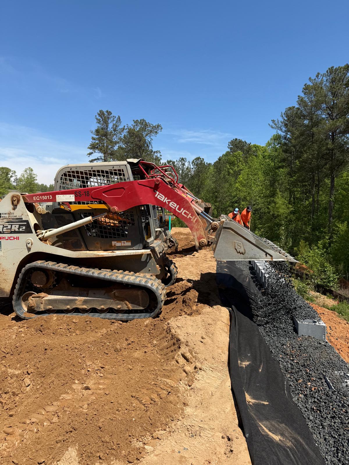 Focusing on backfilling and compaction operations behind the newly installing retaining wall structure along Lots #224–3229, Following the drainage installation, the next layer of backfill was placed over the previously installed geogrid reinforcement sheet, in preparation for subsequent compaction. Excavation and placement of fill material was conducted using a Kobelco 310LC excavator and transported on site with a CAT 750 dump truck. Subsequent to placement, two Takeuchi TL12R2 Bobcats were used to distribute the fill uniformly along Lots #224–3229. Once the fill was evenly spread, compaction was carried out using a Bomag BW211 sheep foot compactor roller.