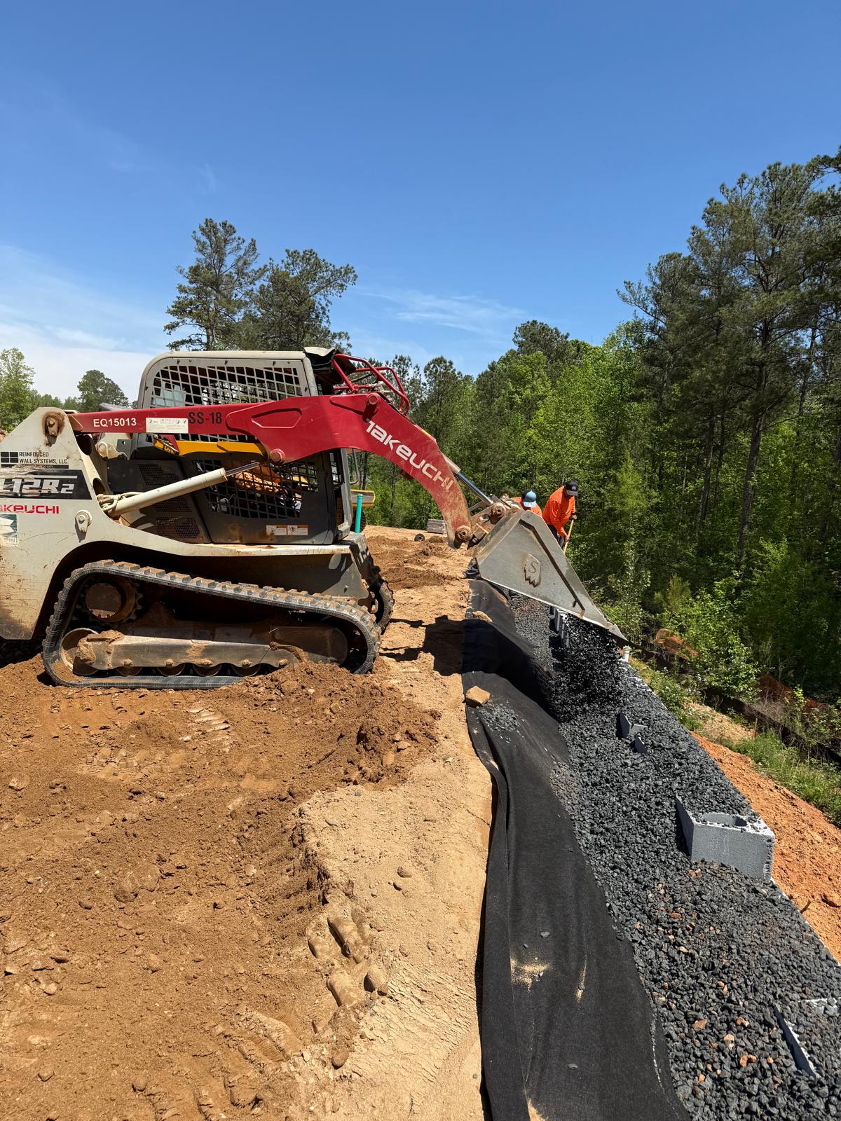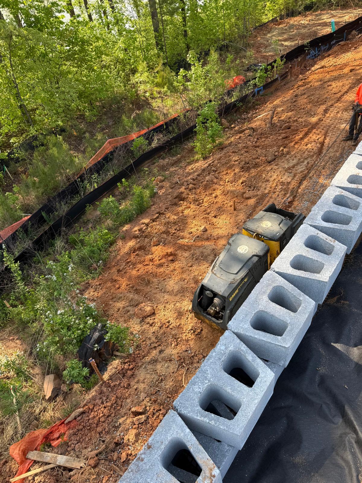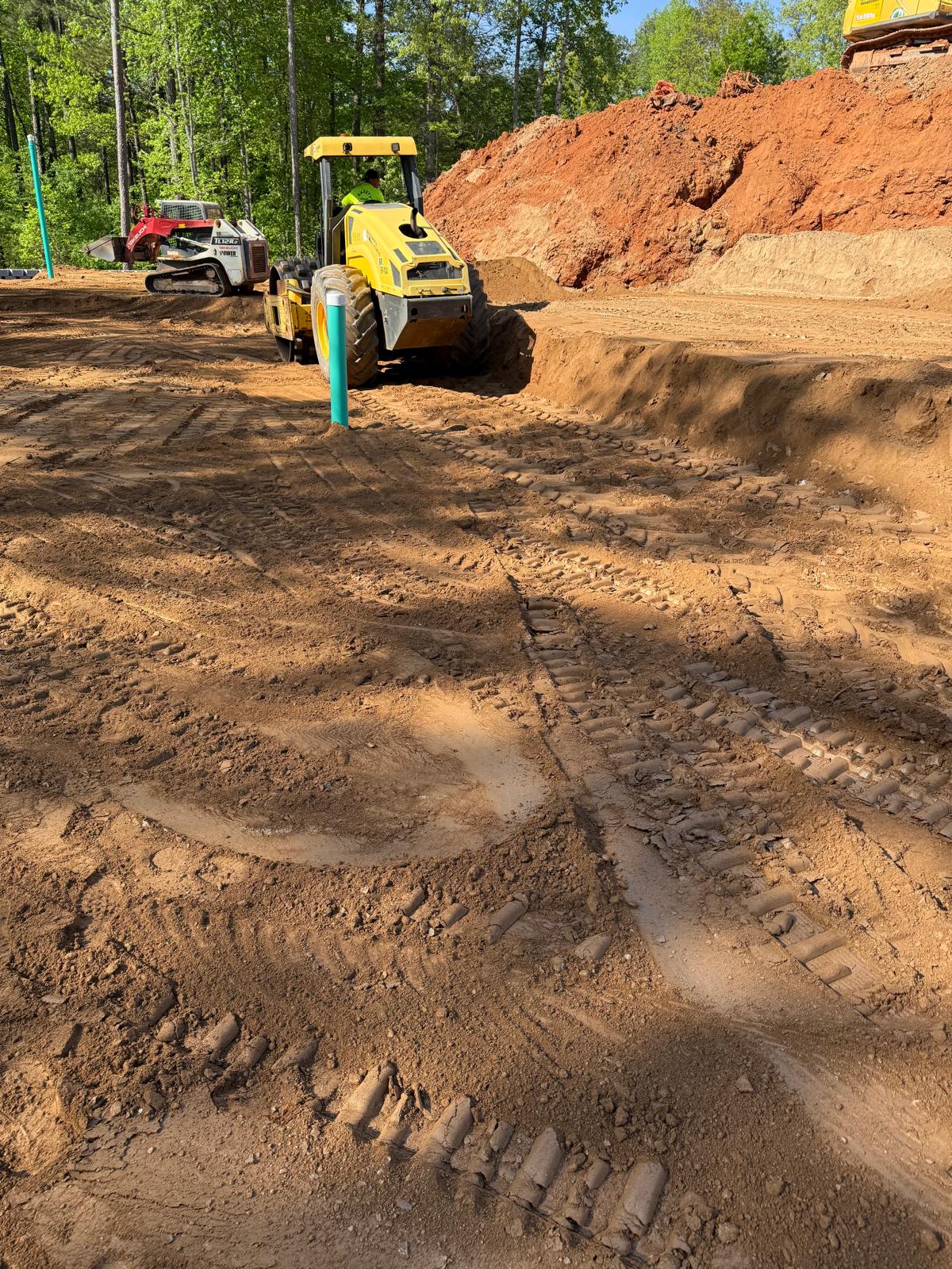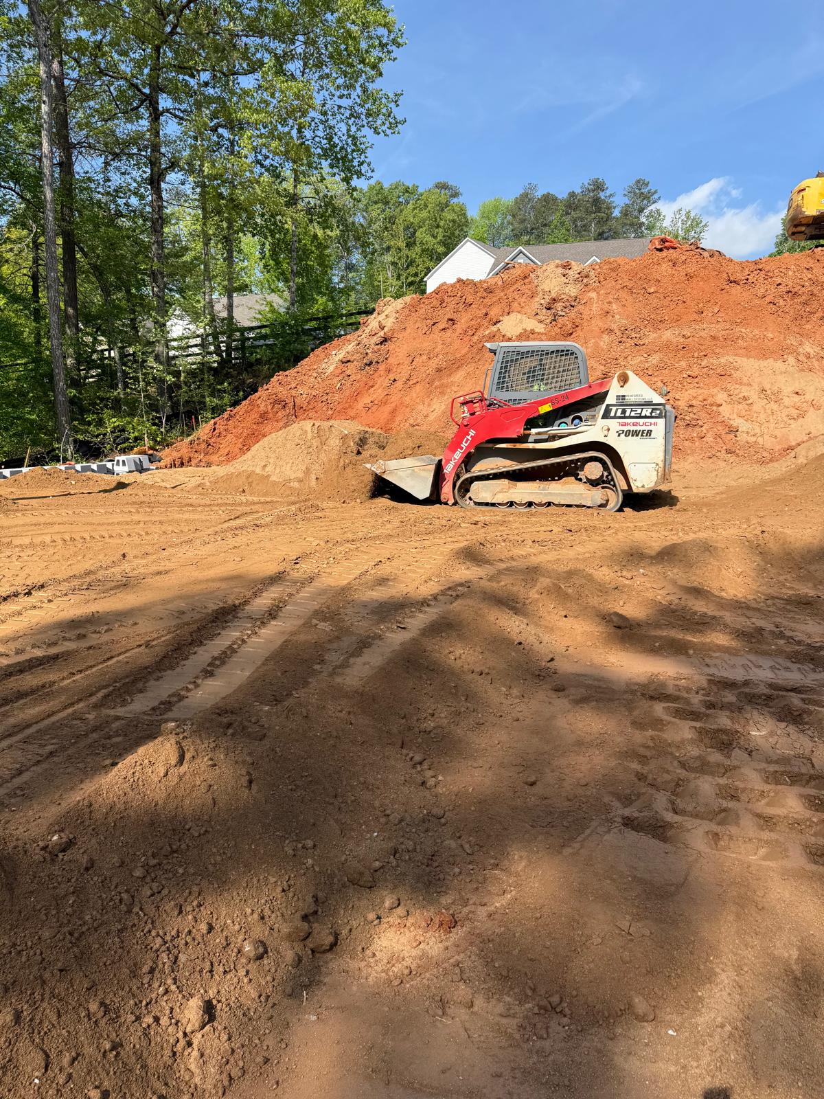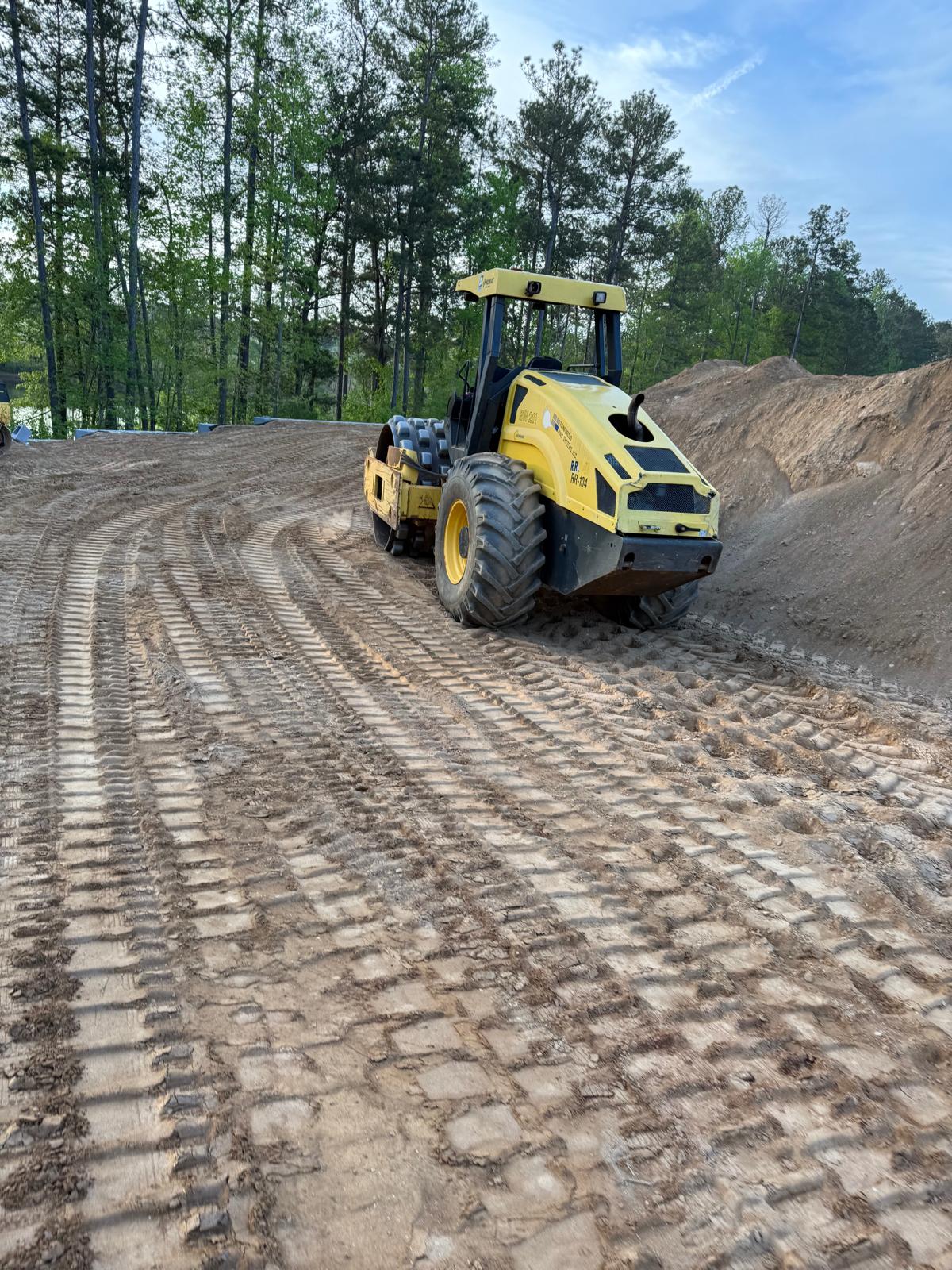 Focusing on backfilling and compaction operations behind the newly installing retaining wall structure along Lots #224–3229, Following the drainage installation, the next layer of backfill was placed over the previously installed geogrid reinforcement sheet, in preparation for subsequent compaction. Excavation and placement of fill material was conducted using a Kobelco 310LC excavator and transported on site with a CAT 750 dump truck. Subsequent to placement, two Takeuchi TL12R2 Bobcats were used to distribute the fill uniformly along Lots #224–3229. Once the fill was evenly spread, compaction was carried out using a Bomag BW211 sheep foot compactor roller.