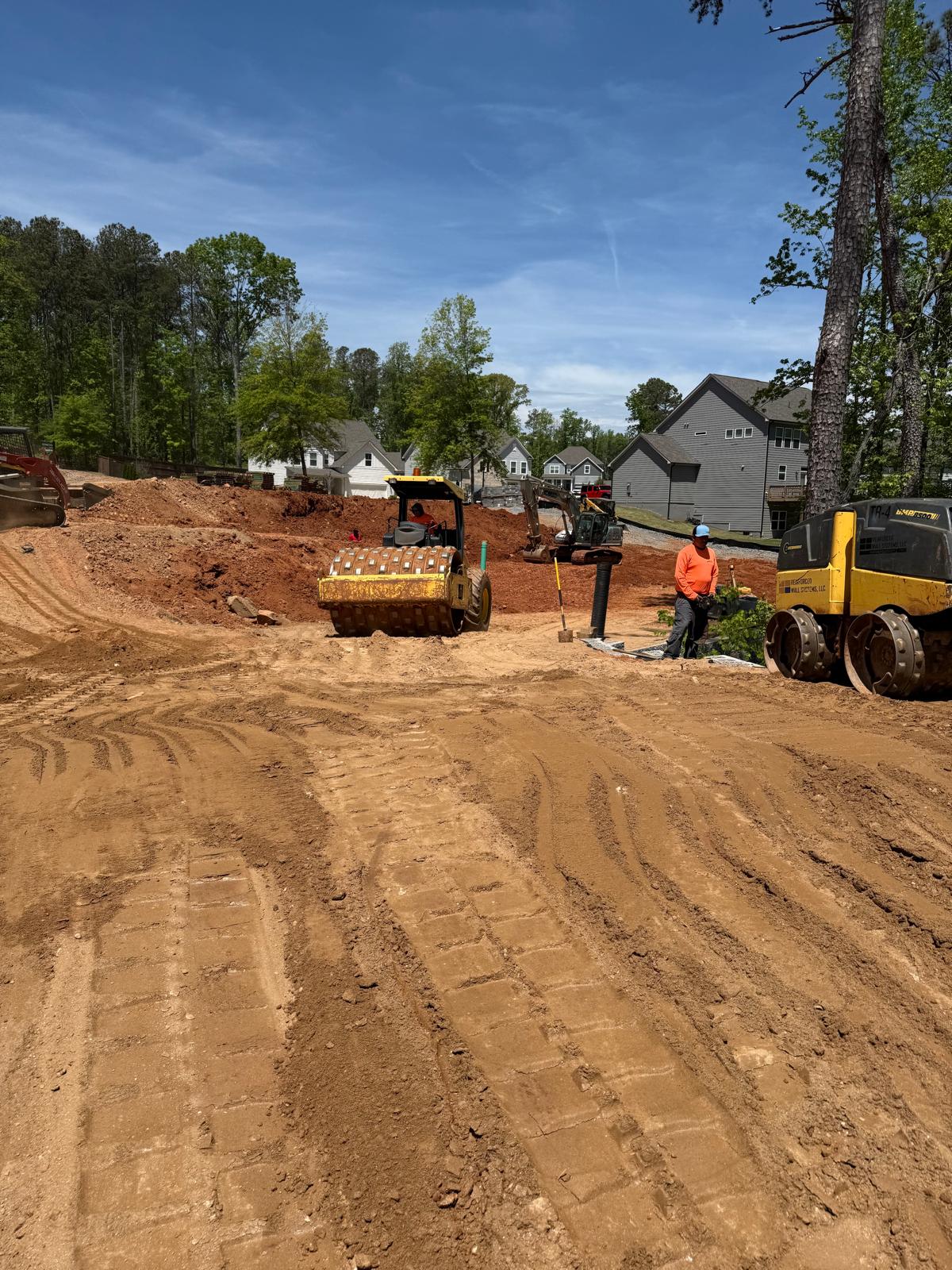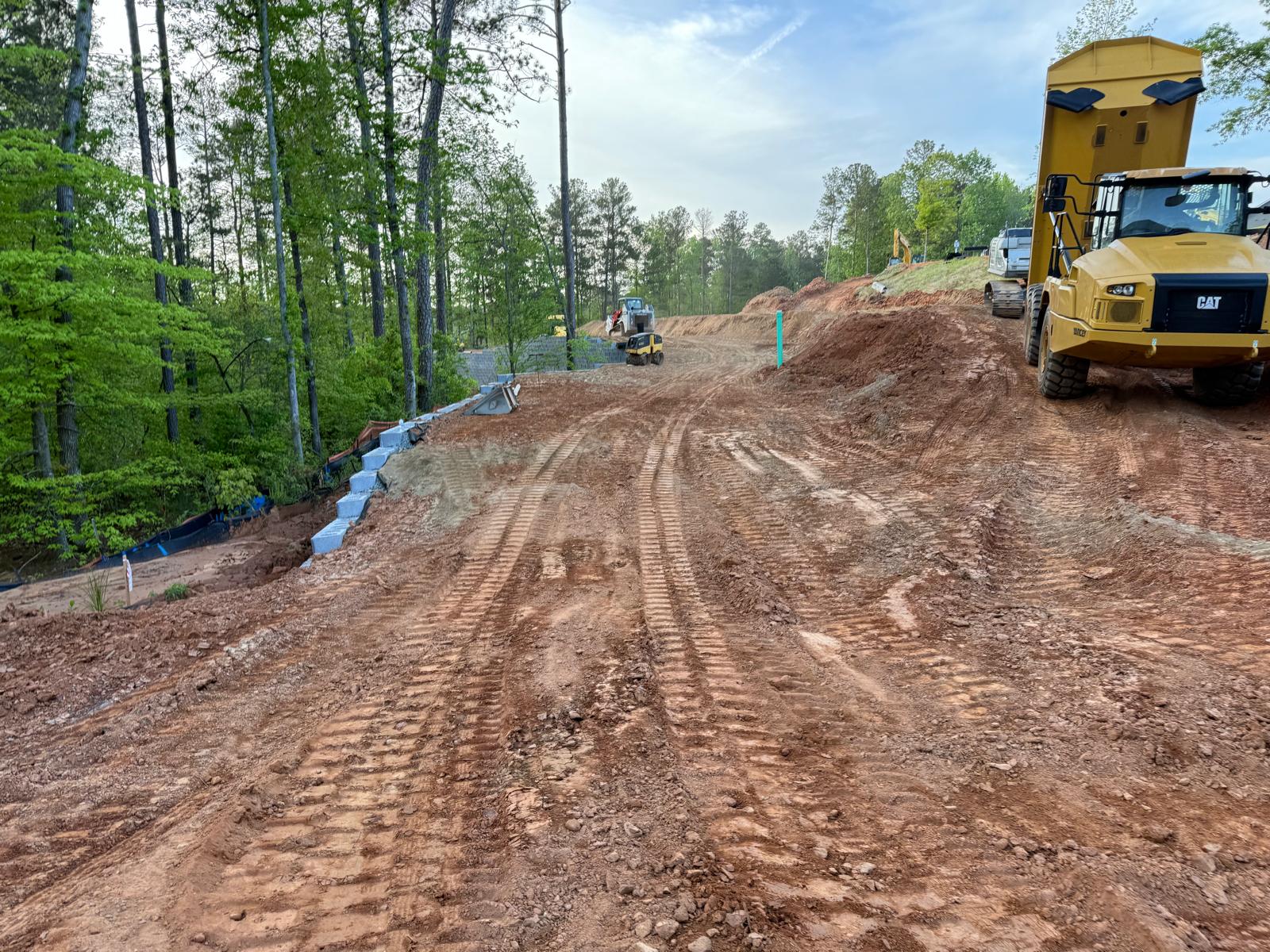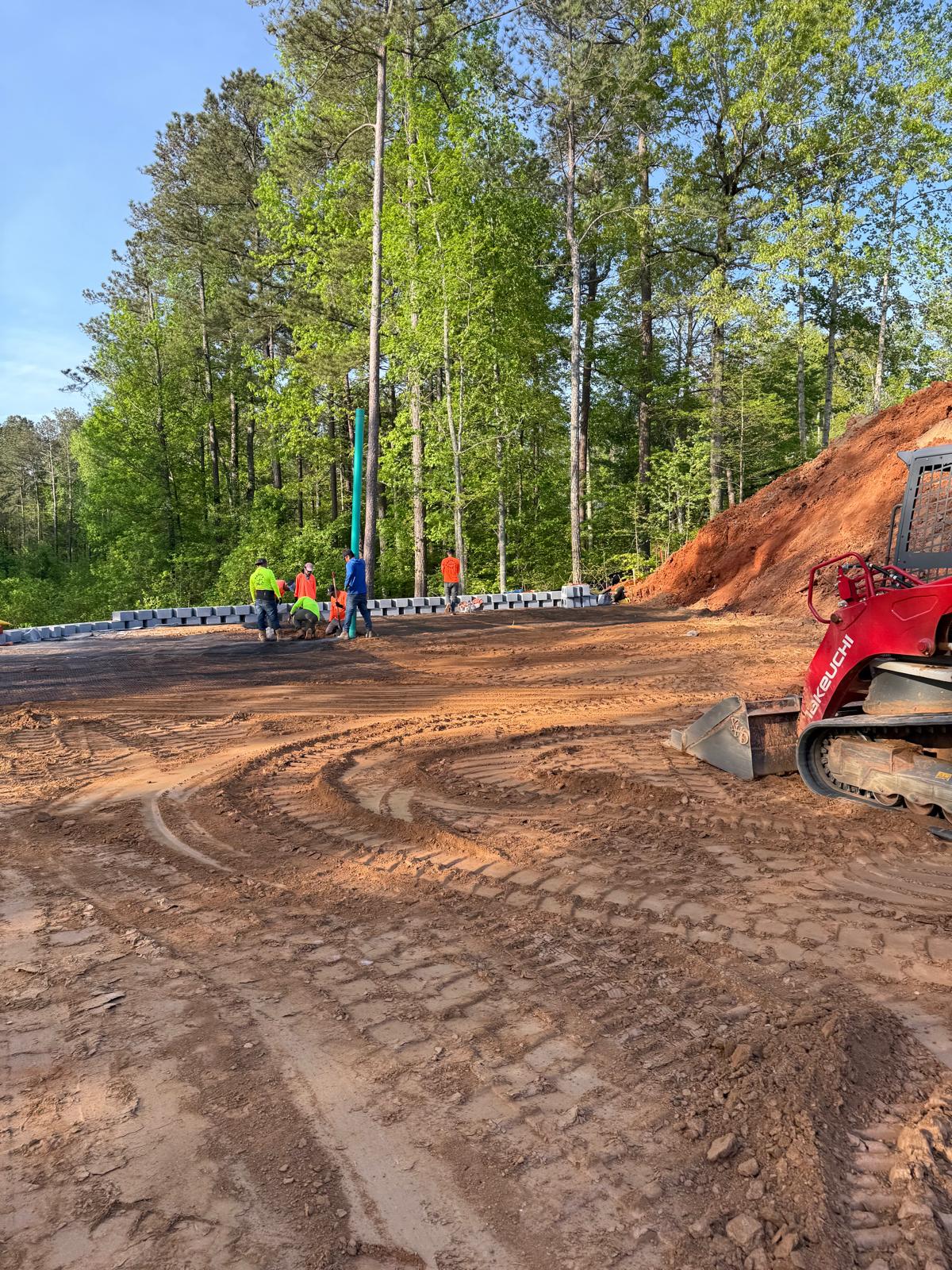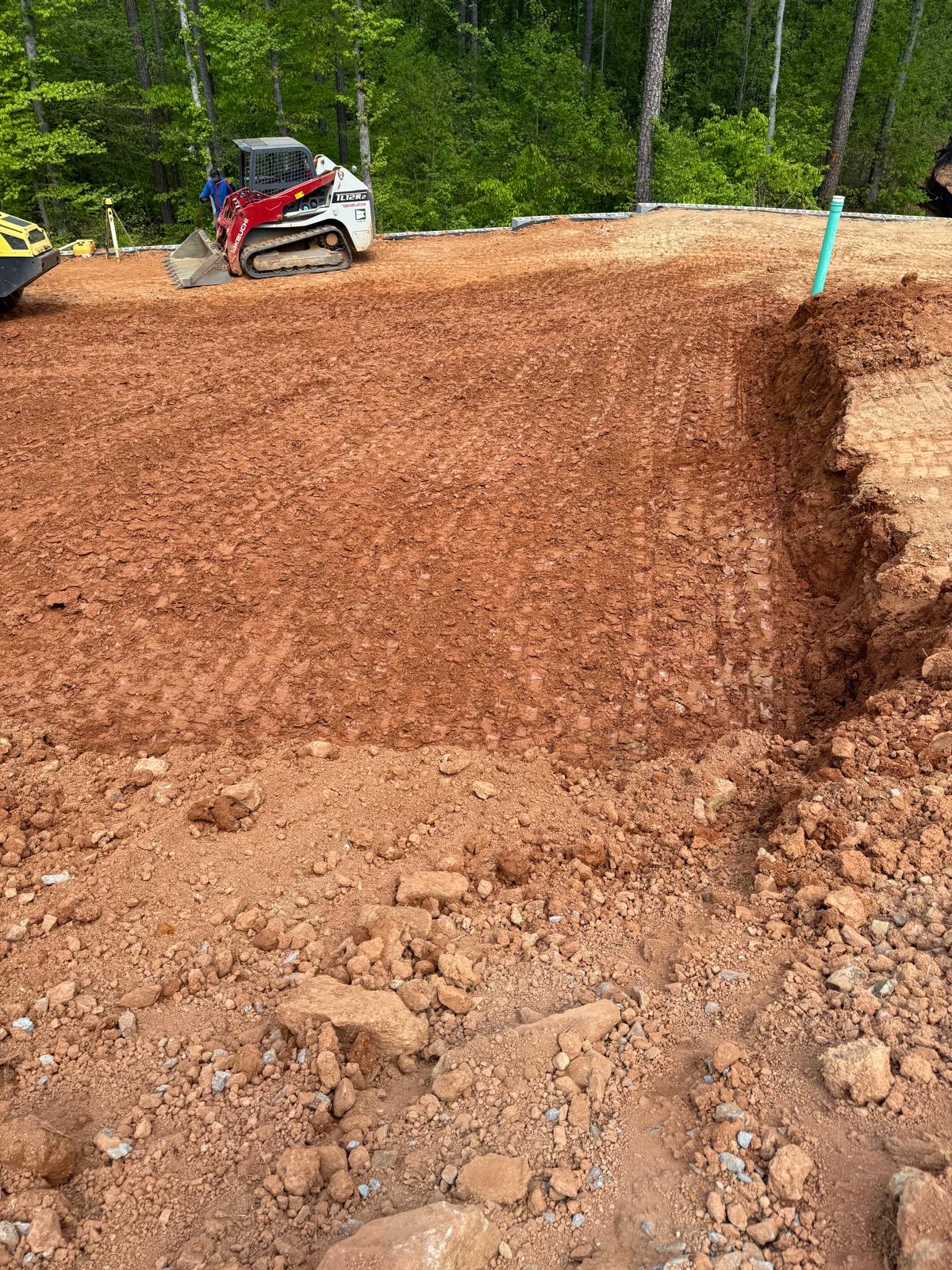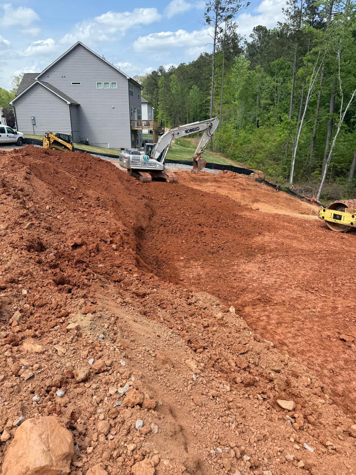 Focusing on backfilling and compaction operations behind the newly installing retaining wall structure along Lots #224–3229, Following the drainage installation, the next layer of backfill was placed over the previously installed geogrid reinforcement sheet, in preparation for subsequent compaction. Excavation and placement of fill material was conducted using a Kobelco 310LC excavator and transported on site with a CAT 750 dump truck. Subsequent to placement, two Takeuchi TL12R2 Bobcats were used to distribute the fill uniformly along Lots #224–3229. Once the fill was evenly spread, compaction was carried out using a Bomag BW211 sheep foot compactor roller.