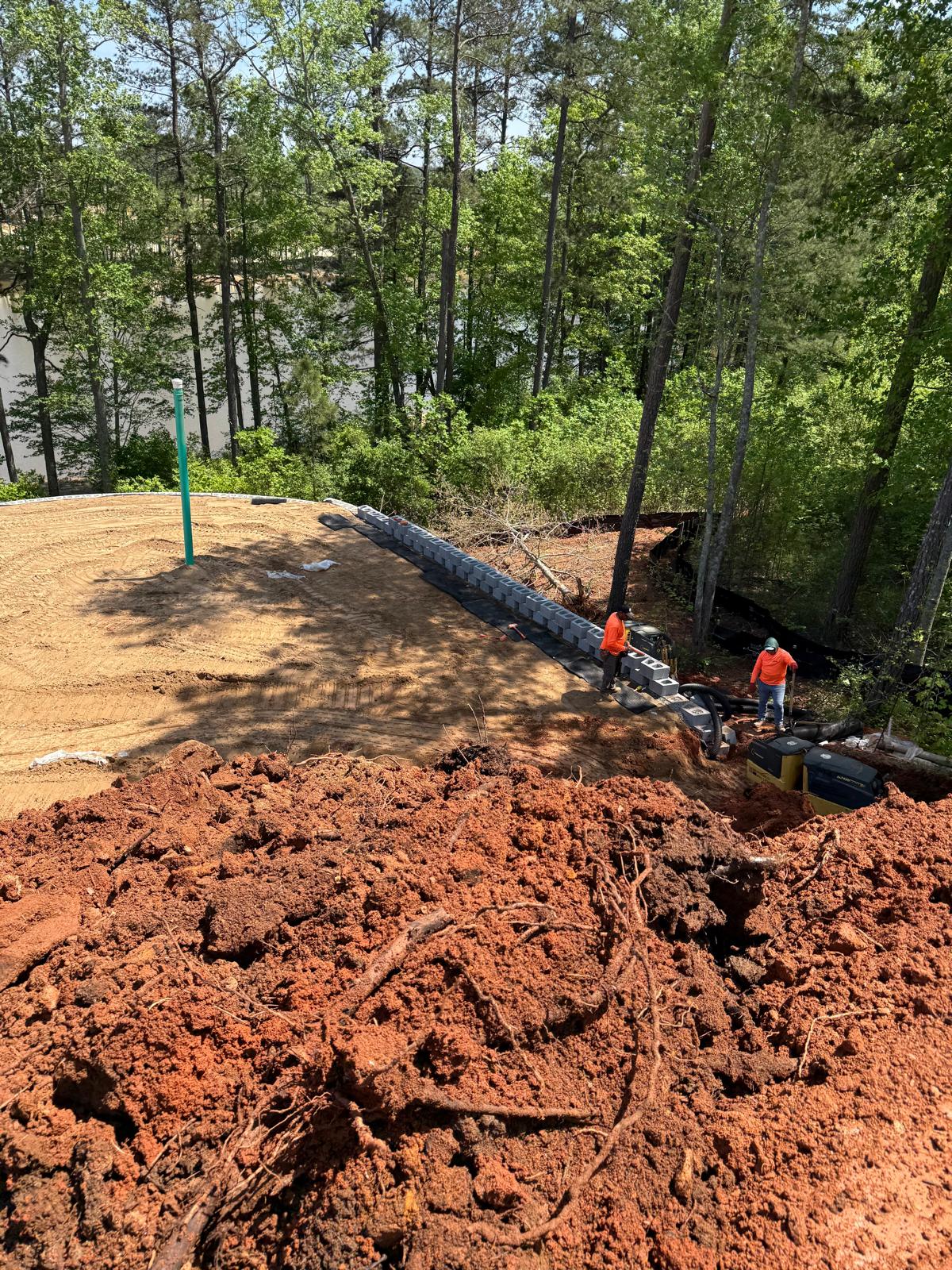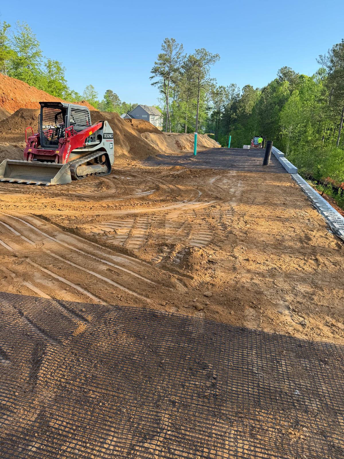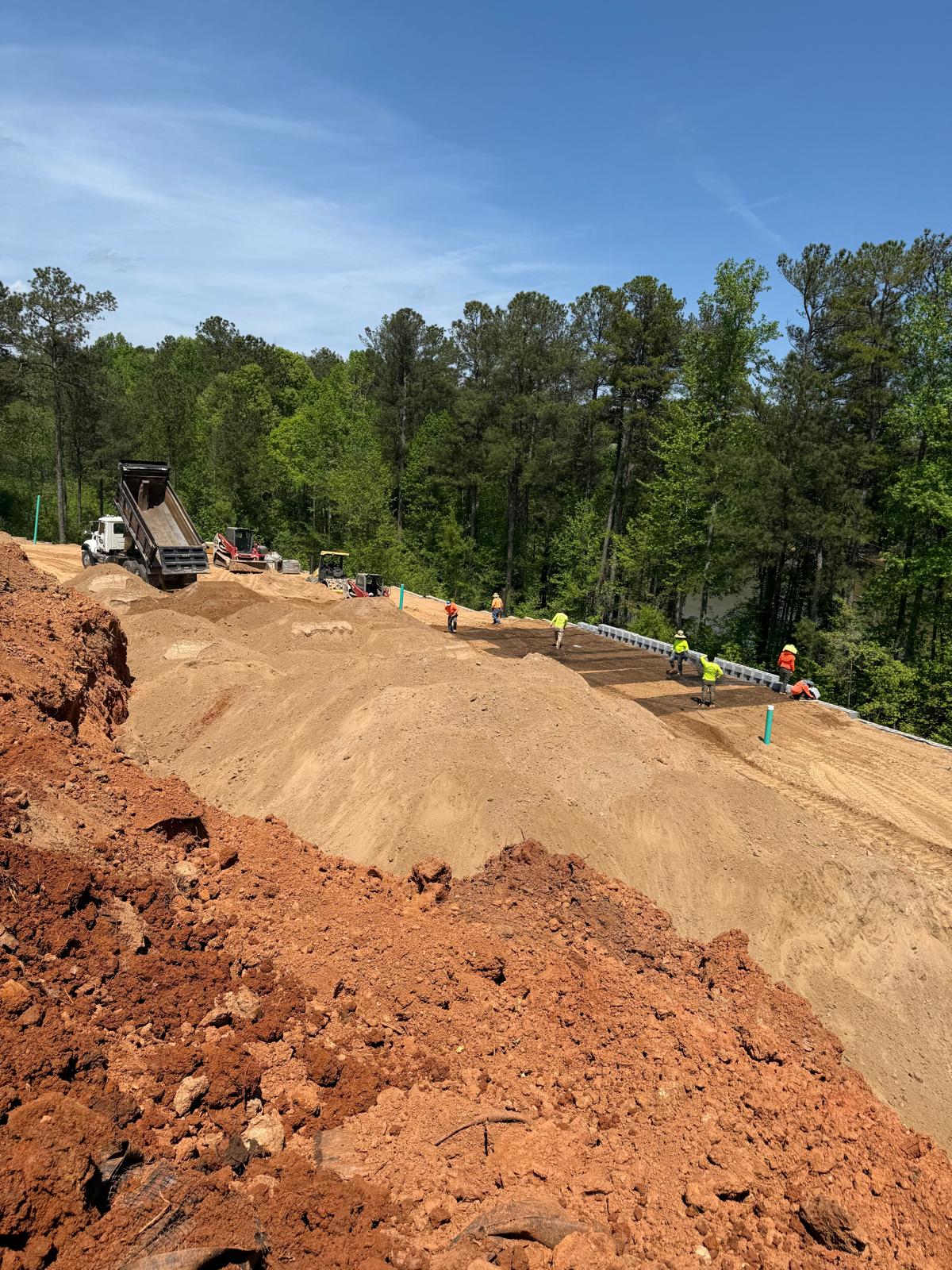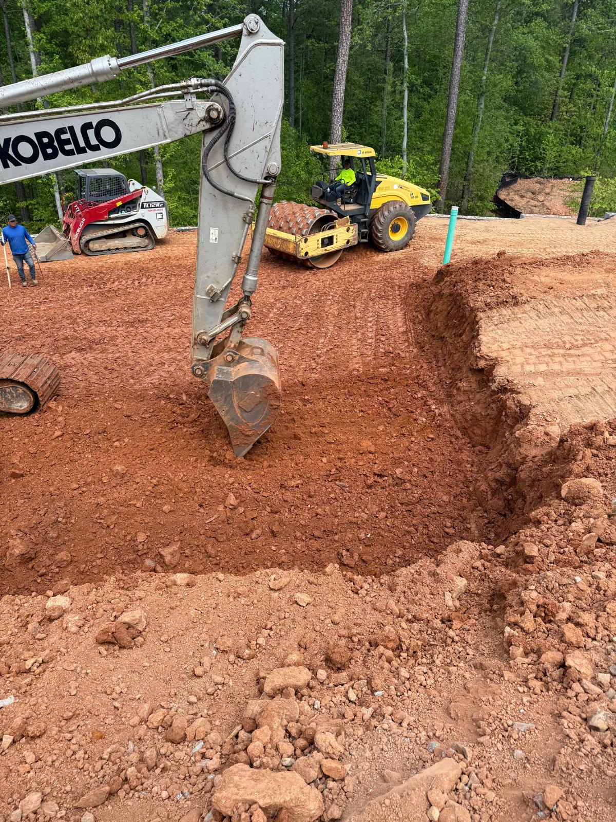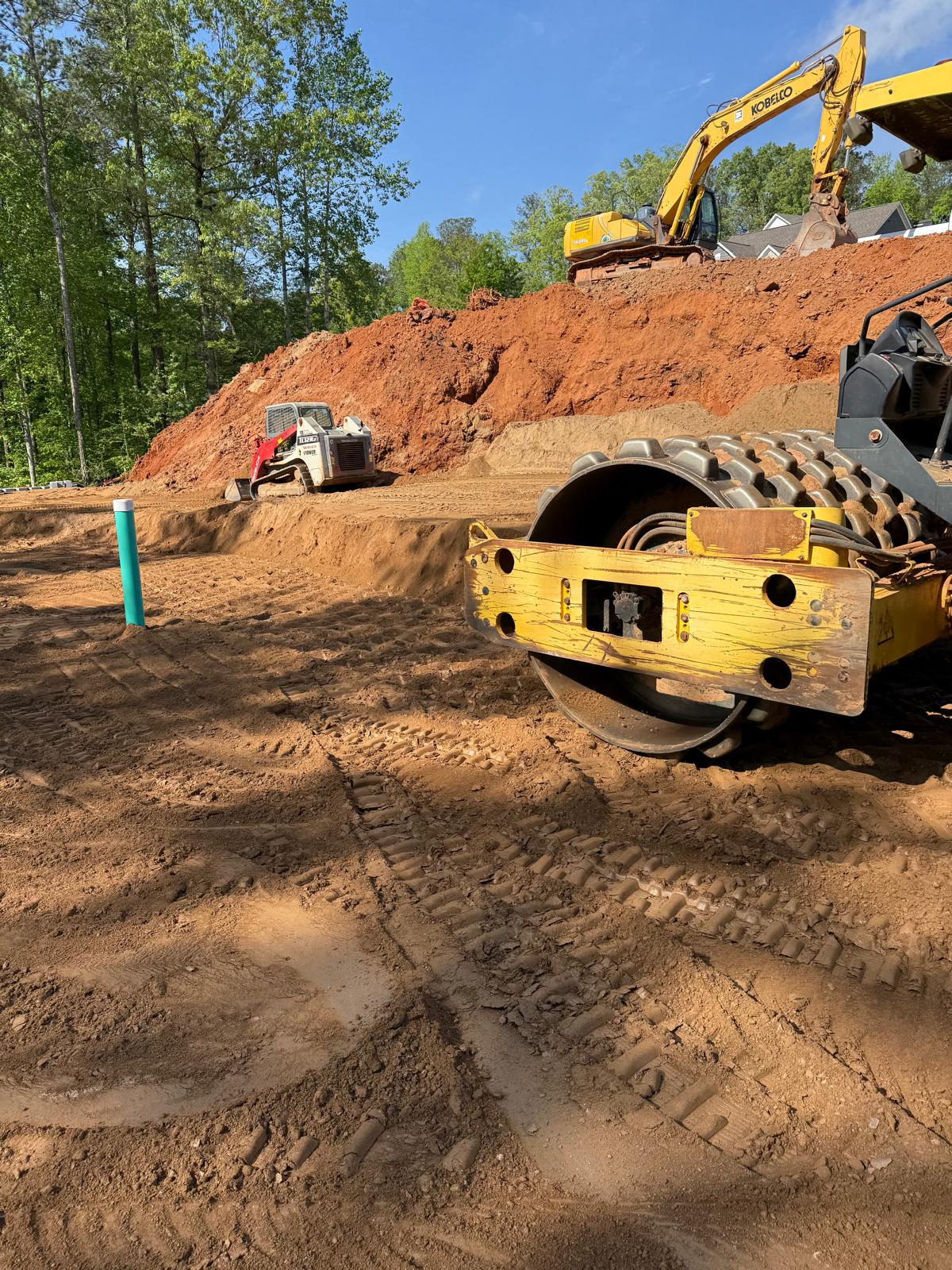 Focusing on backfilling and compaction operations behind the newly installing retaining wall structure along Lots #224–3229, Following the drainage installation, the next layer of backfill was placed over the previously installed geogrid reinforcement sheet, in preparation for subsequent compaction. Excavation and placement of fill material was conducted using a Kobelco 310LC excavator and transported on site with a CAT 750 dump truck. Subsequent to placement, two Takeuchi TL12R2 Bobcats were used to distribute the fill uniformly along Lots #224–3229. Once the fill was evenly spread, compaction was carried out using a Bomag BW211 sheep foot compactor roller.