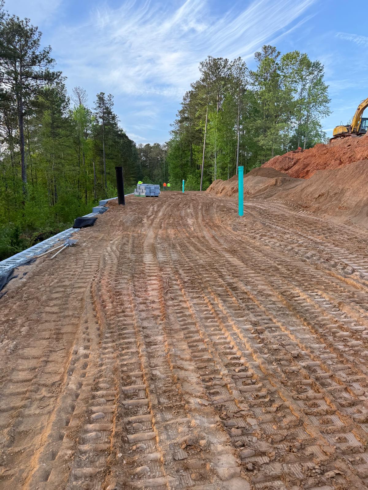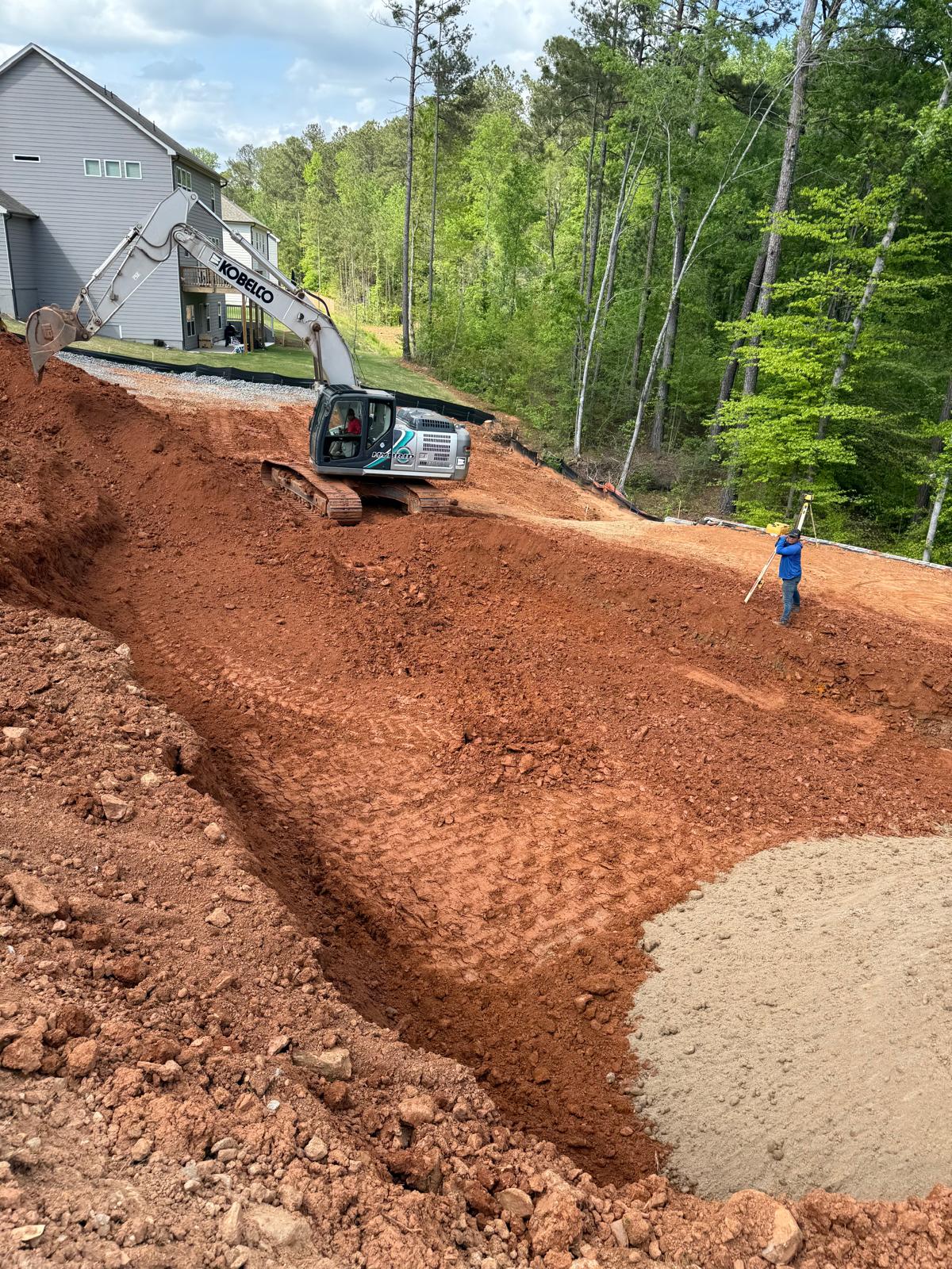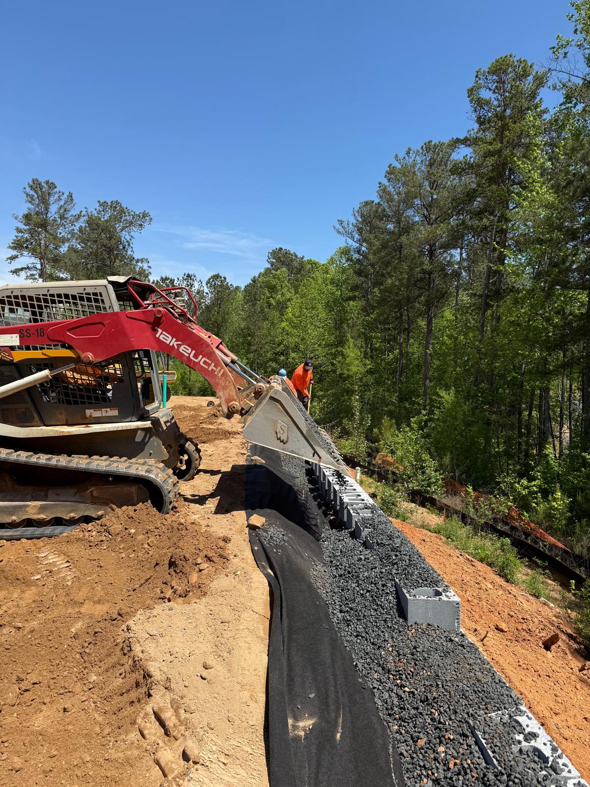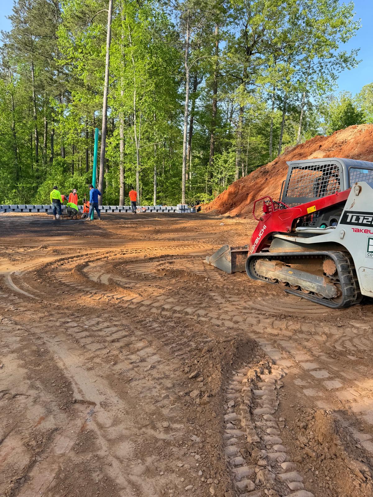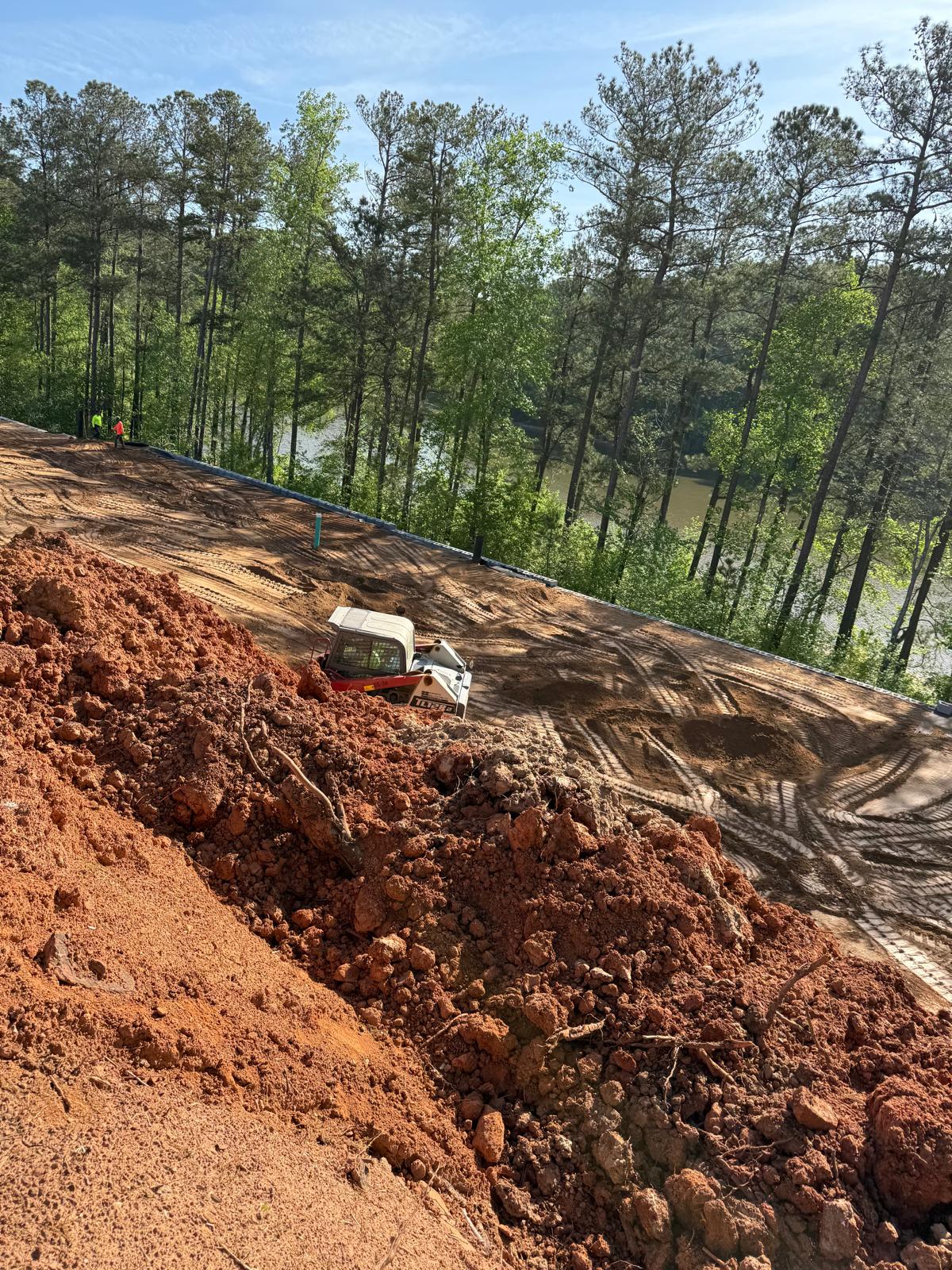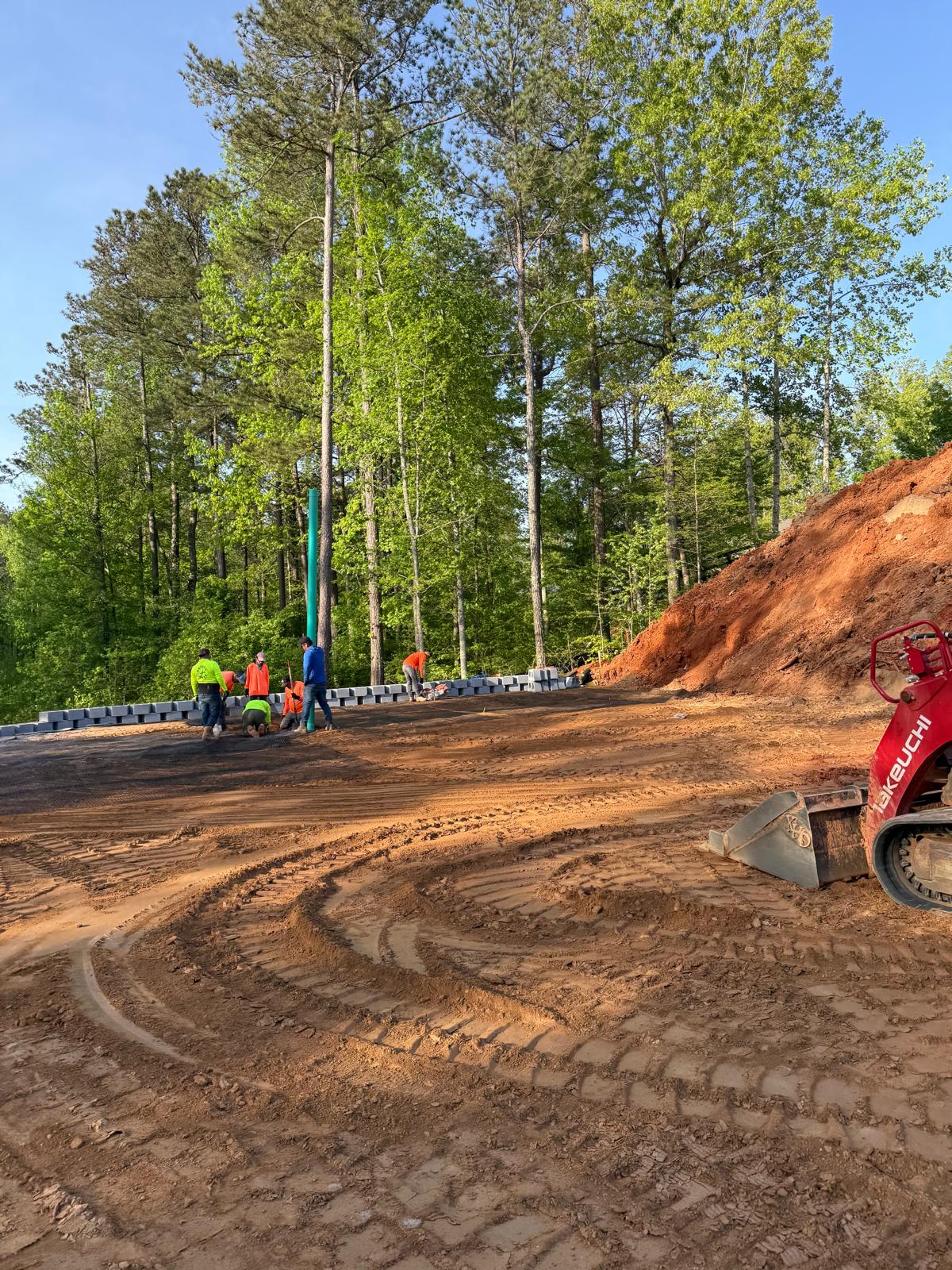 Focusing on backfilling and compaction operations behind the newly installing retaining wall structure along Lots #224–3229, Following the drainage installation, the next layer of backfill was placed over the previously installed geogrid reinforcement sheet, in preparation for subsequent compaction. Excavation and placement of fill material was conducted using a Kobelco 310LC excavator and transported on site with a CAT 750 dump truck. Subsequent to placement, two Takeuchi TL12R2 Bobcats were used to distribute the fill uniformly along Lots #224–3229. Once the fill was evenly spread, compaction was carried out using a Bomag BW211 sheep foot compactor roller.