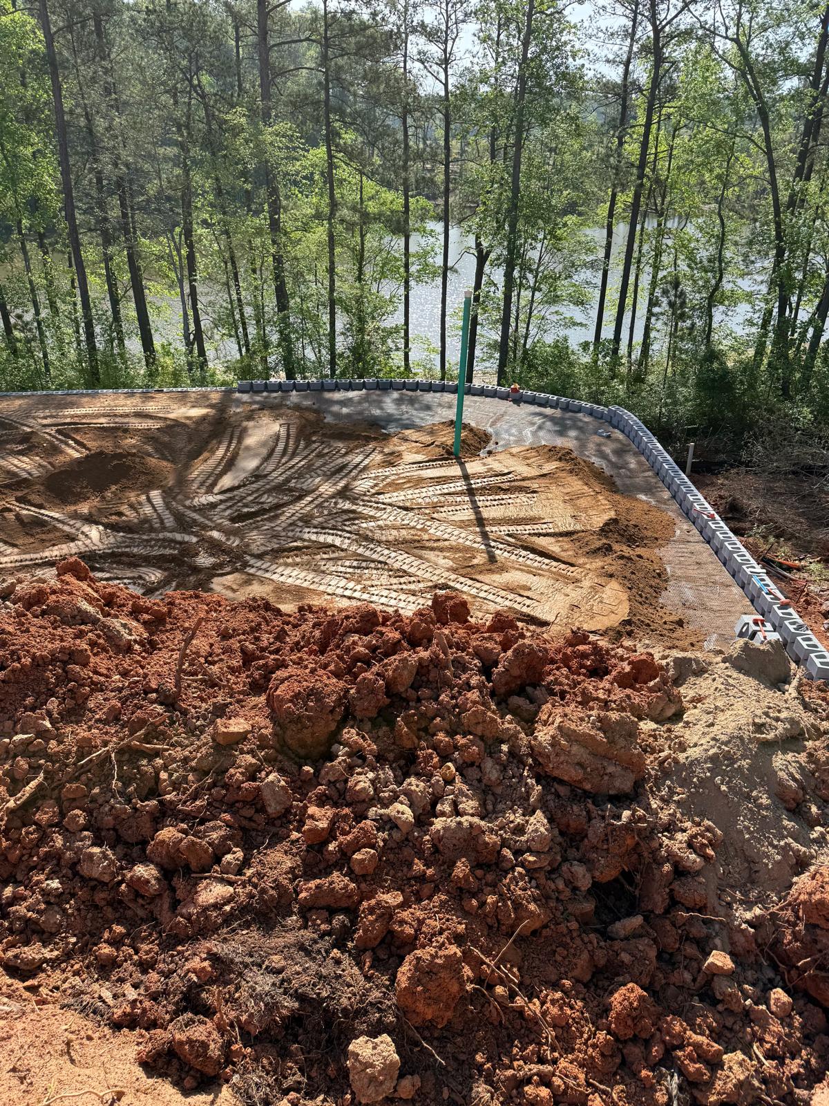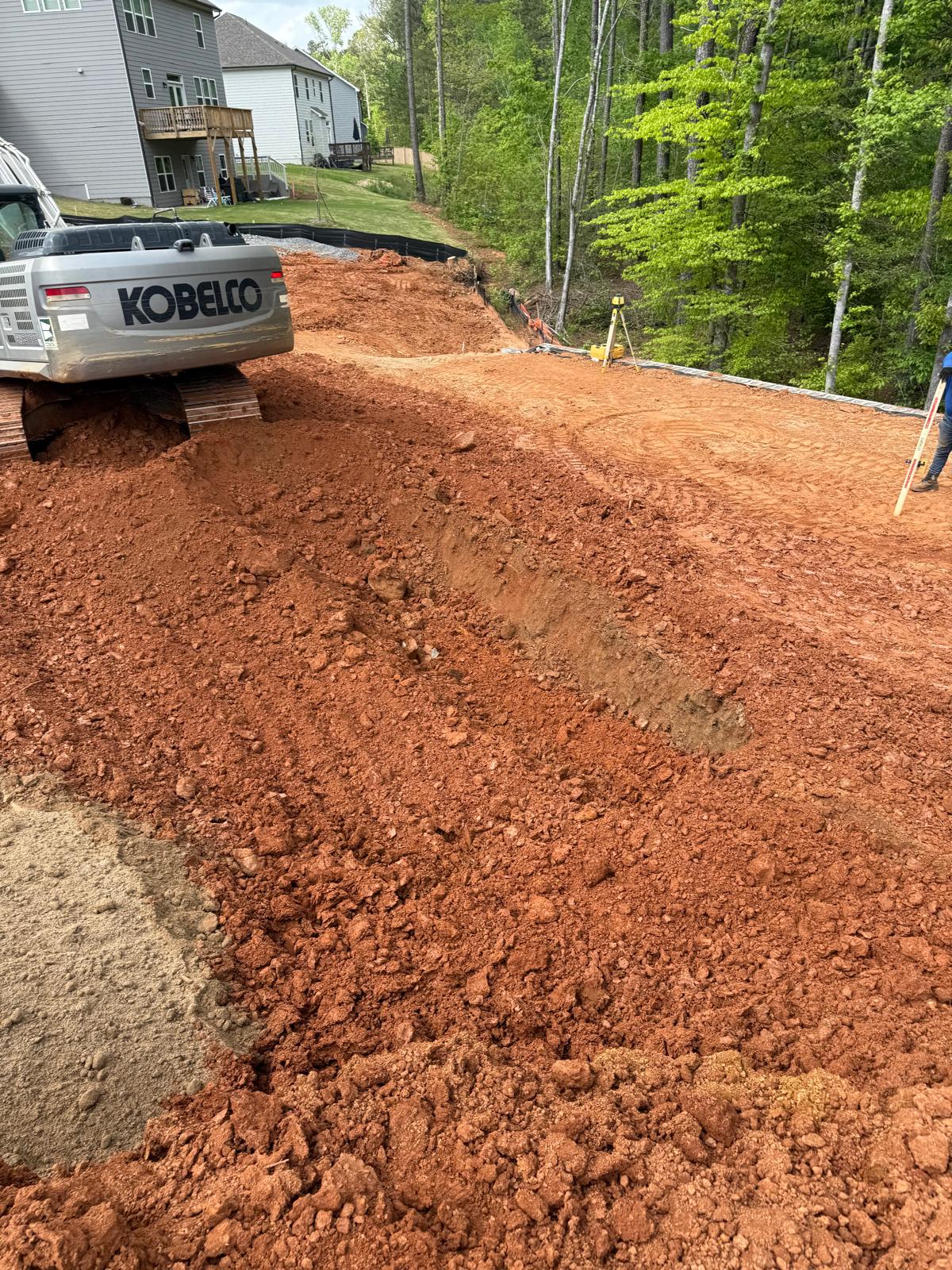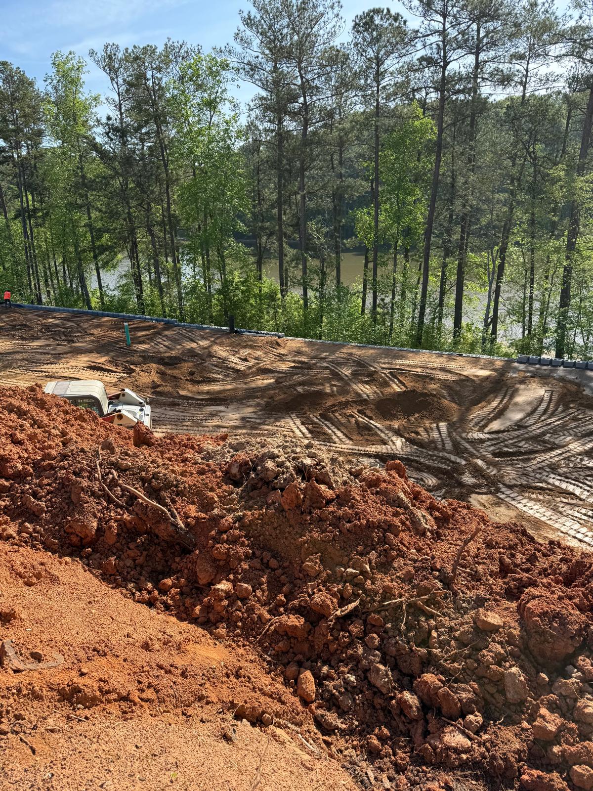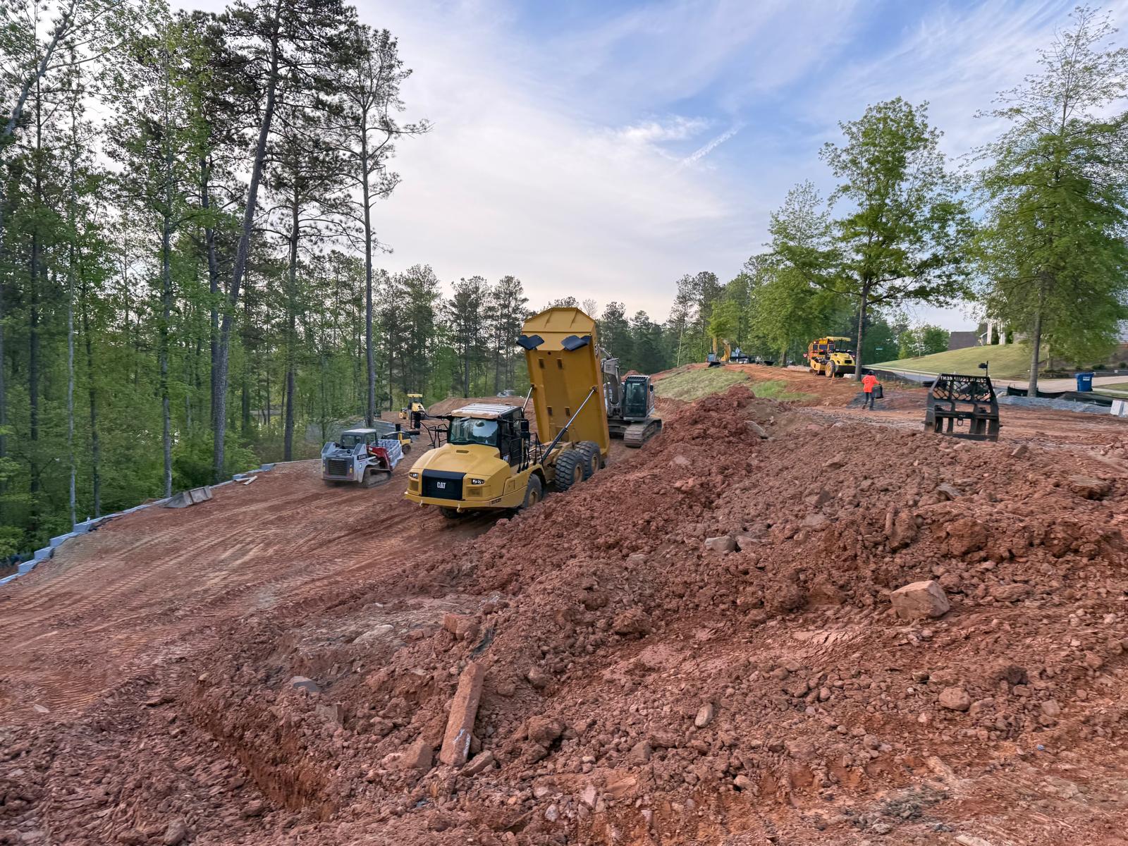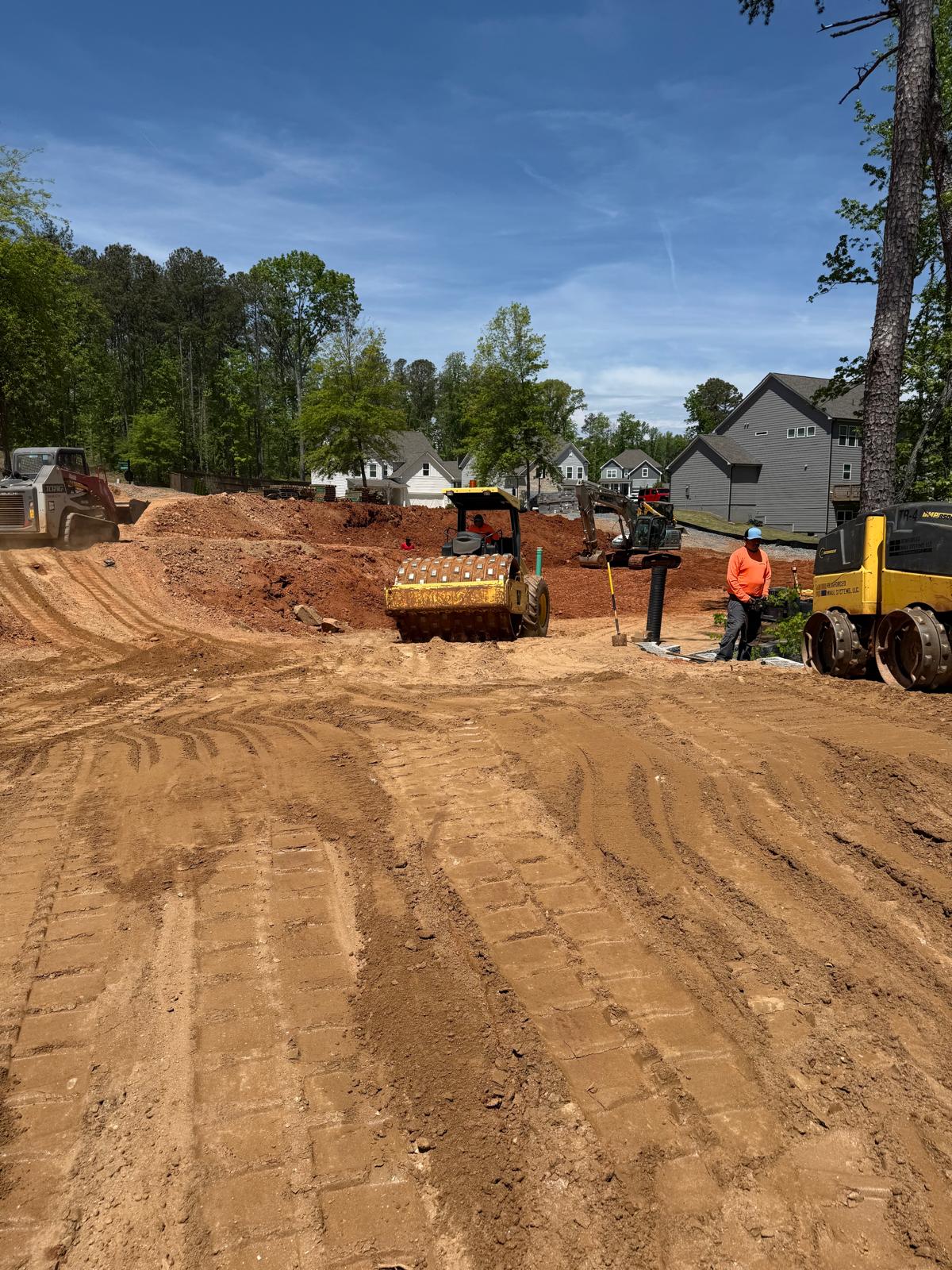 Focusing on backfilling and compaction operations behind the newly installing retaining wall structure along Lots #224–3229, Following the drainage installation, the next layer of backfill was placed over the previously installed geogrid reinforcement sheet, in preparation for subsequent compaction. Excavation and placement of fill material was conducted using a Kobelco 310LC excavator and transported on site with a CAT 750 dump truck. Subsequent to placement, two Takeuchi TL12R2 Bobcats were used to distribute the fill uniformly along Lots #224–3229. Once the fill was evenly spread, compaction was carried out using a Bomag BW211 sheep foot compactor roller.
