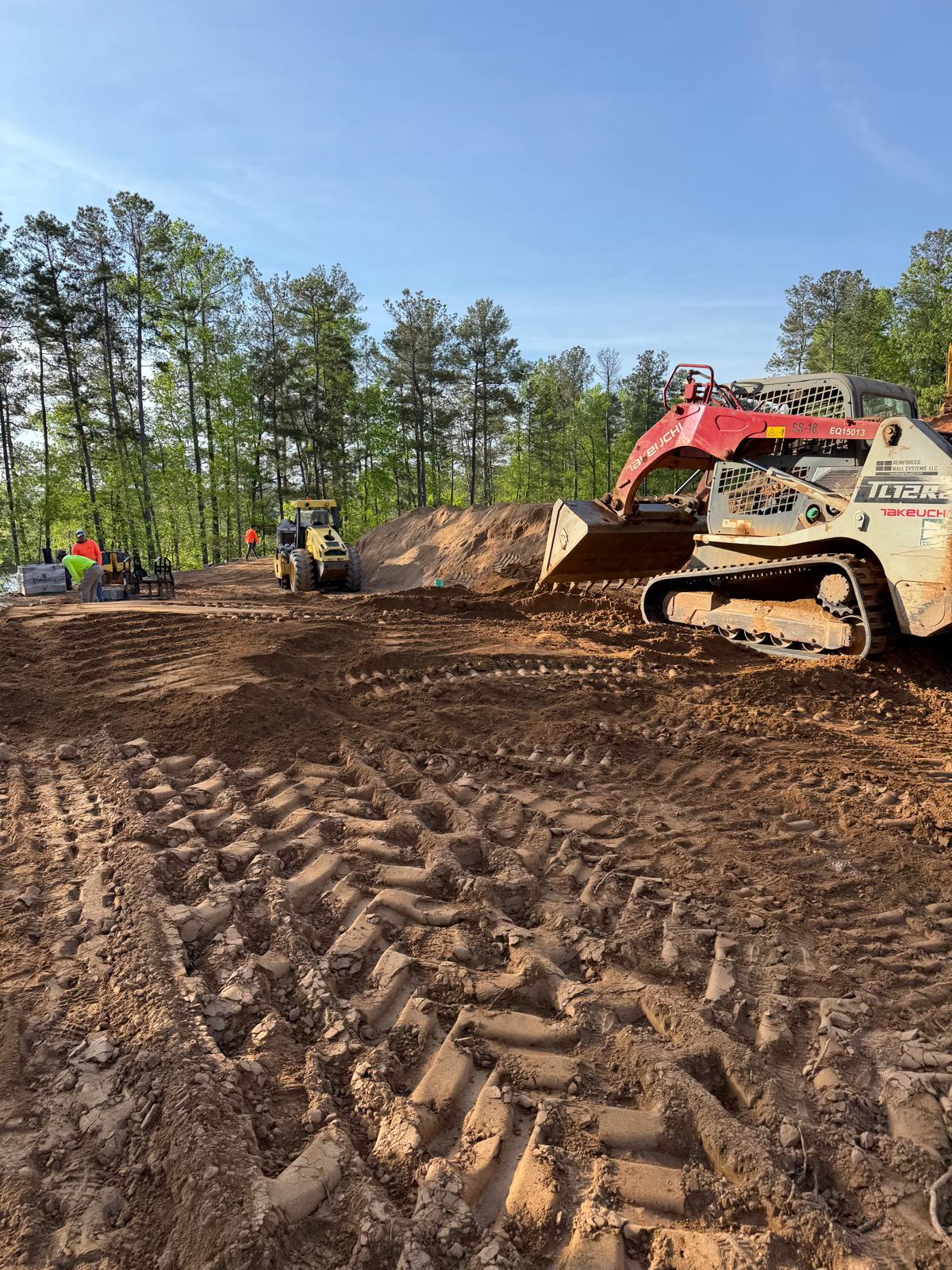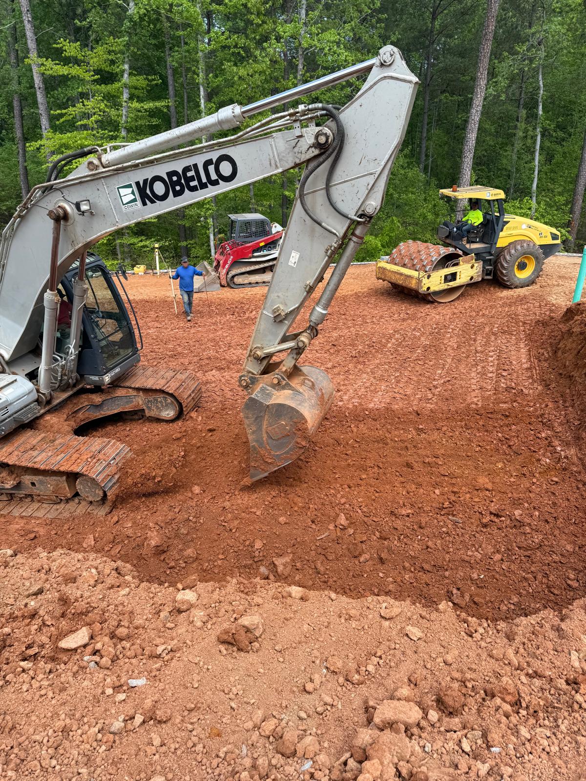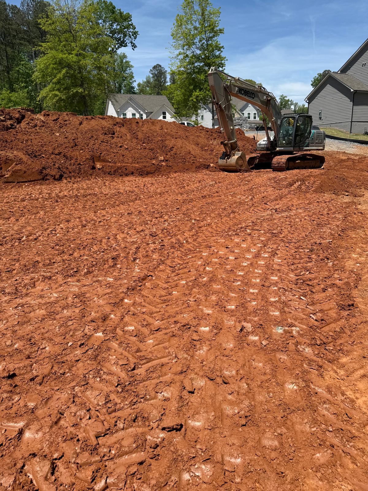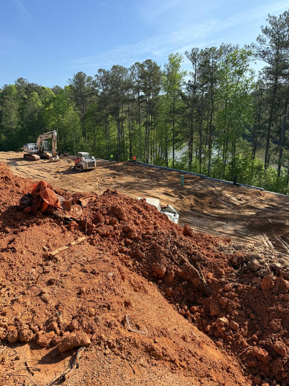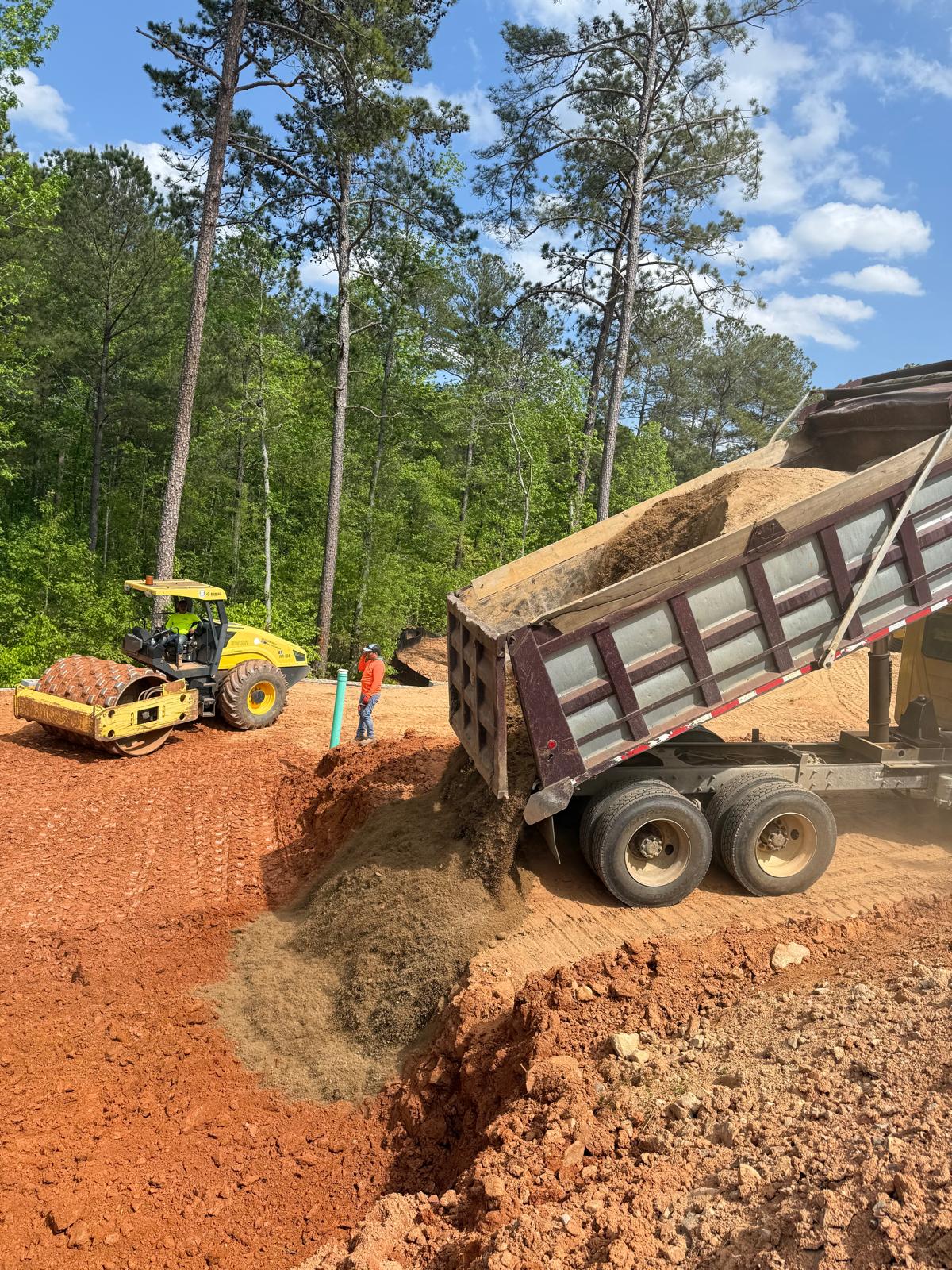 Focusing on backfilling and compaction operations behind the newly installing retaining wall structure along Lots #224–3229, Following the drainage installation, the next layer of backfill was placed over the previously installed geogrid reinforcement sheet, in preparation for subsequent compaction. Excavation and placement of fill material was conducted using a Kobelco 310LC excavator and transported on site with a CAT 750 dump truck. Subsequent to placement, two Takeuchi TL12R2 Bobcats were used to distribute the fill uniformly along Lots #224–3229. Once the fill was evenly spread, compaction was carried out using a Bomag BW211 sheep foot compactor roller.