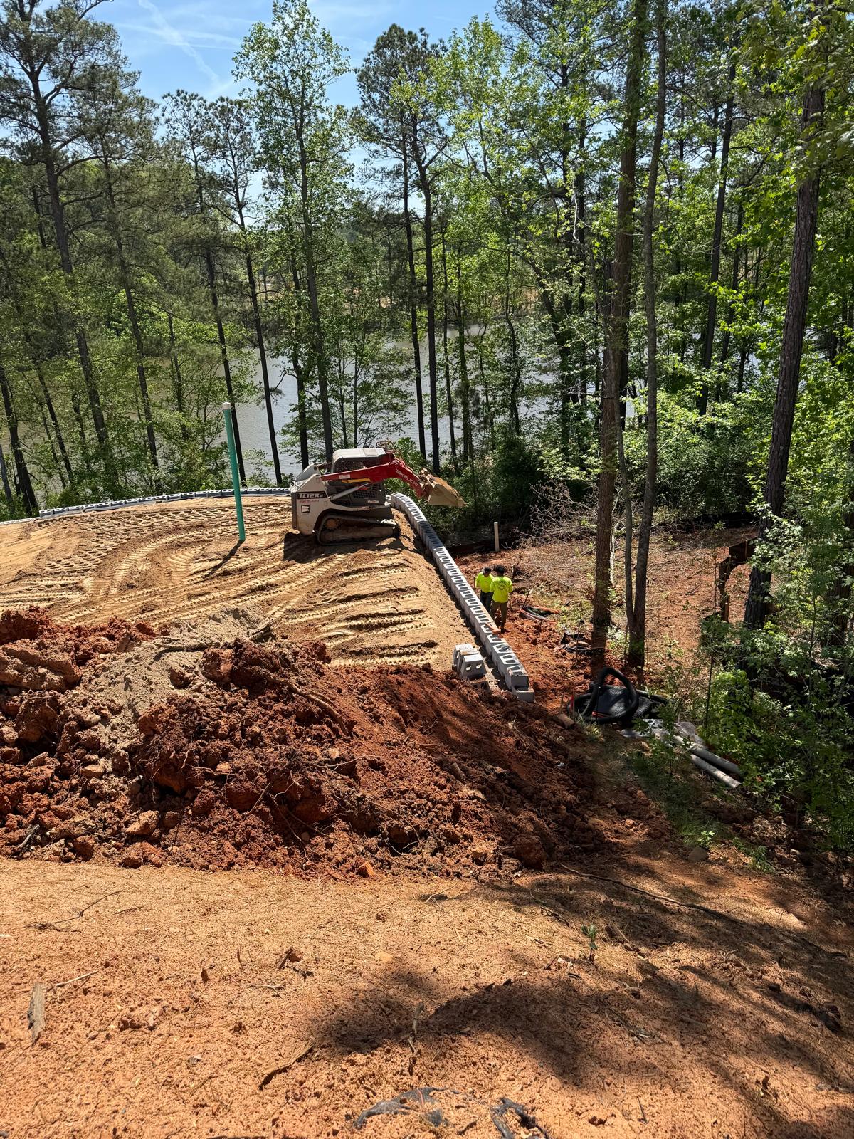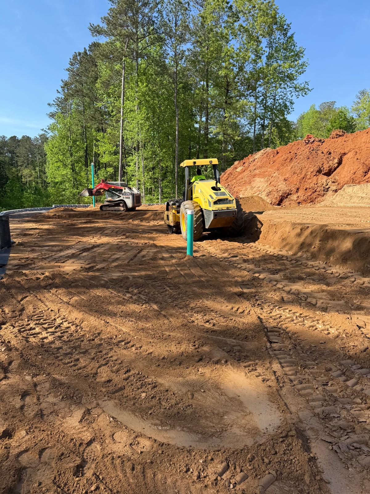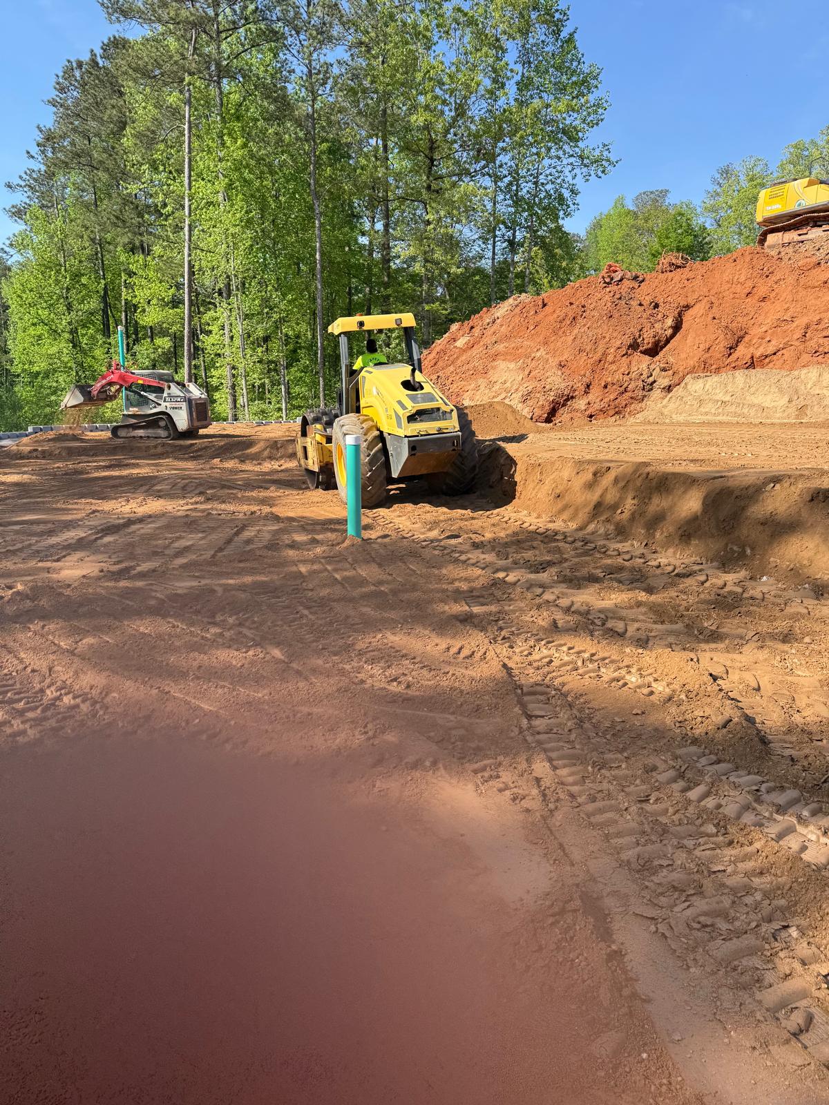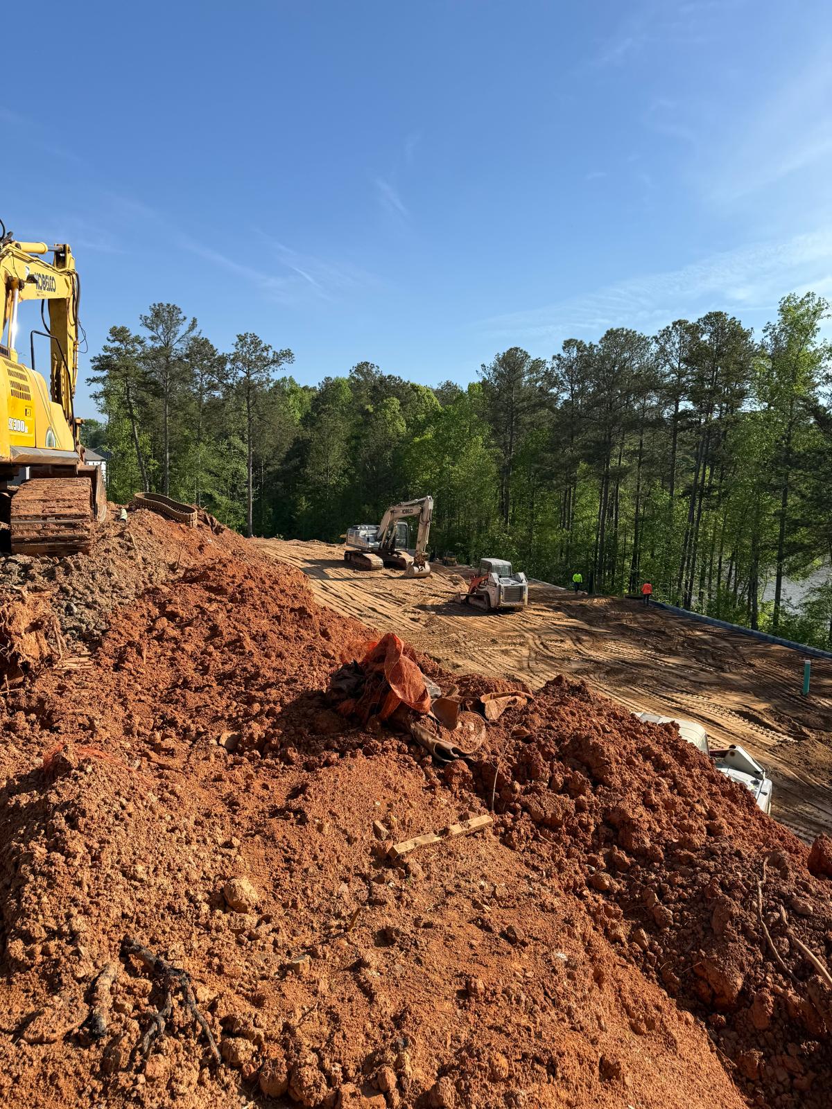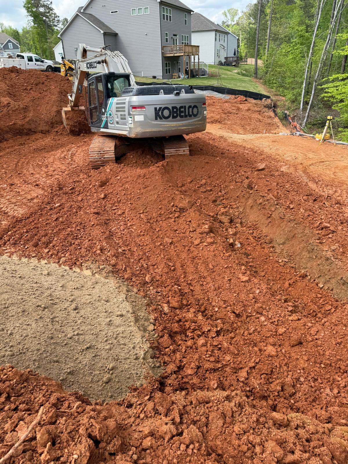 Focusing on backfilling and compaction operations behind the newly installing retaining wall structure along Lots #224–3229, Following the drainage installation, the next layer of backfill was placed over the previously installed geogrid reinforcement sheet, in preparation for subsequent compaction. Excavation and placement of fill material was conducted using a Kobelco 310LC excavator and transported on site with a CAT 750 dump truck. Subsequent to placement, two Takeuchi TL12R2 Bobcats were used to distribute the fill uniformly along Lots #224–3229. Once the fill was evenly spread, compaction was carried out using a Bomag BW211 sheep foot compactor roller.