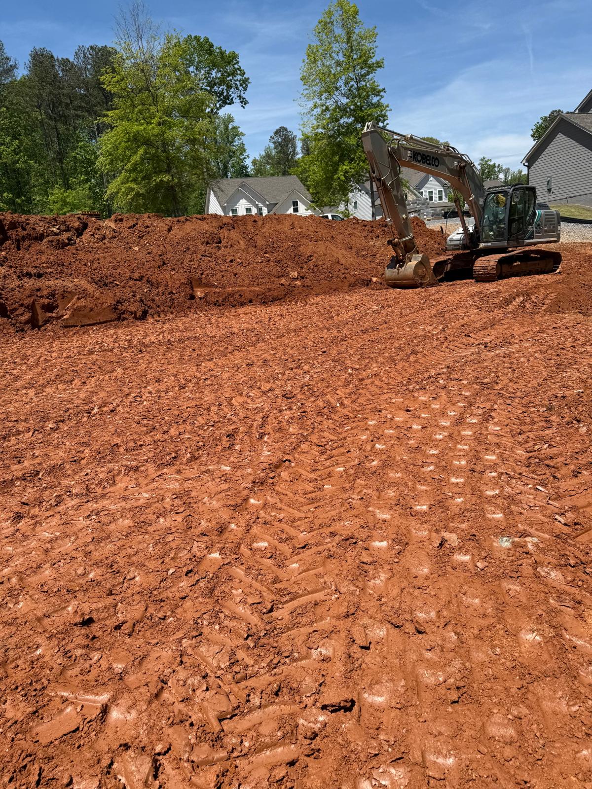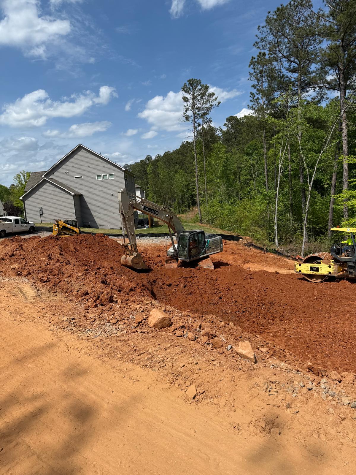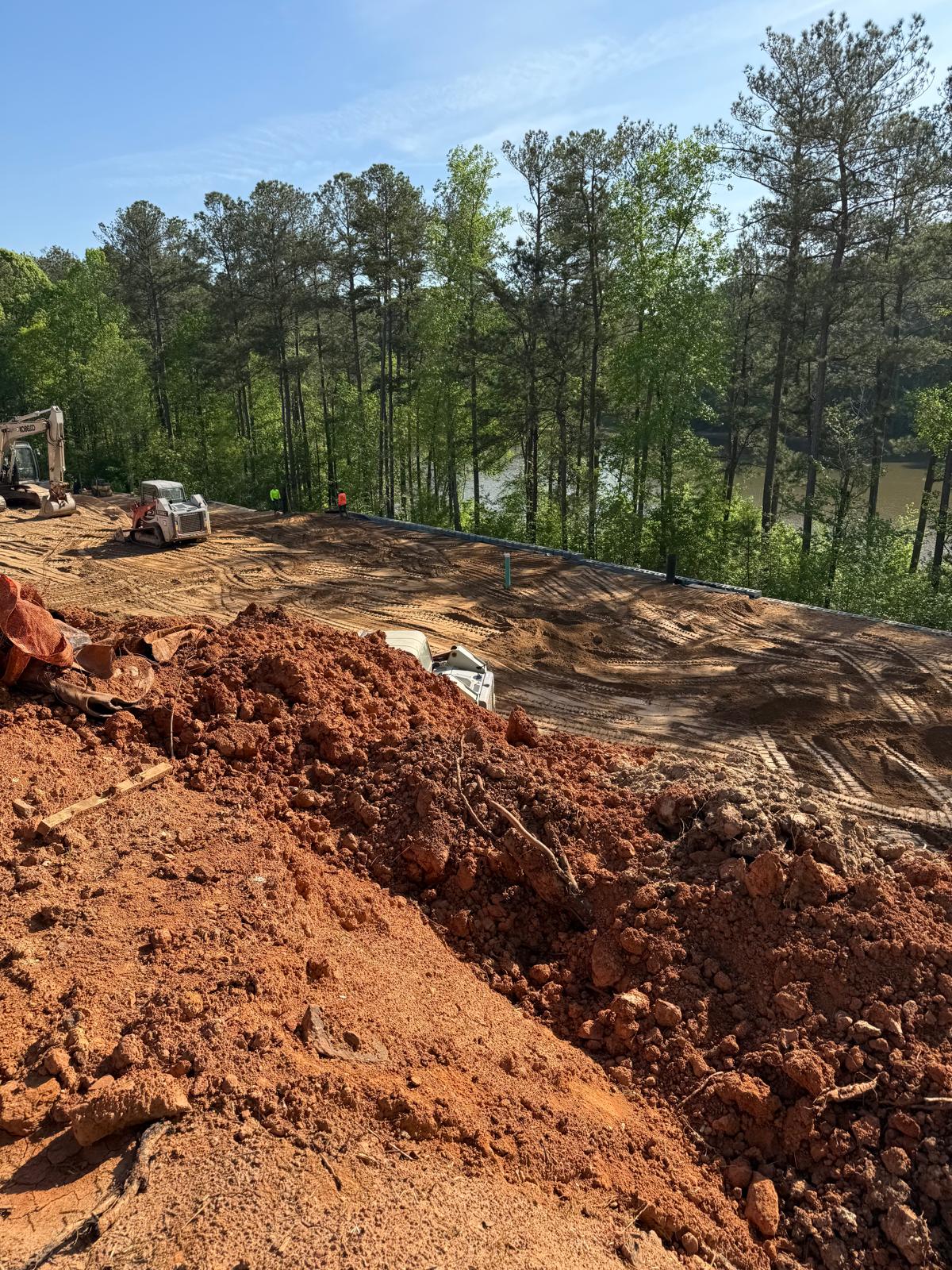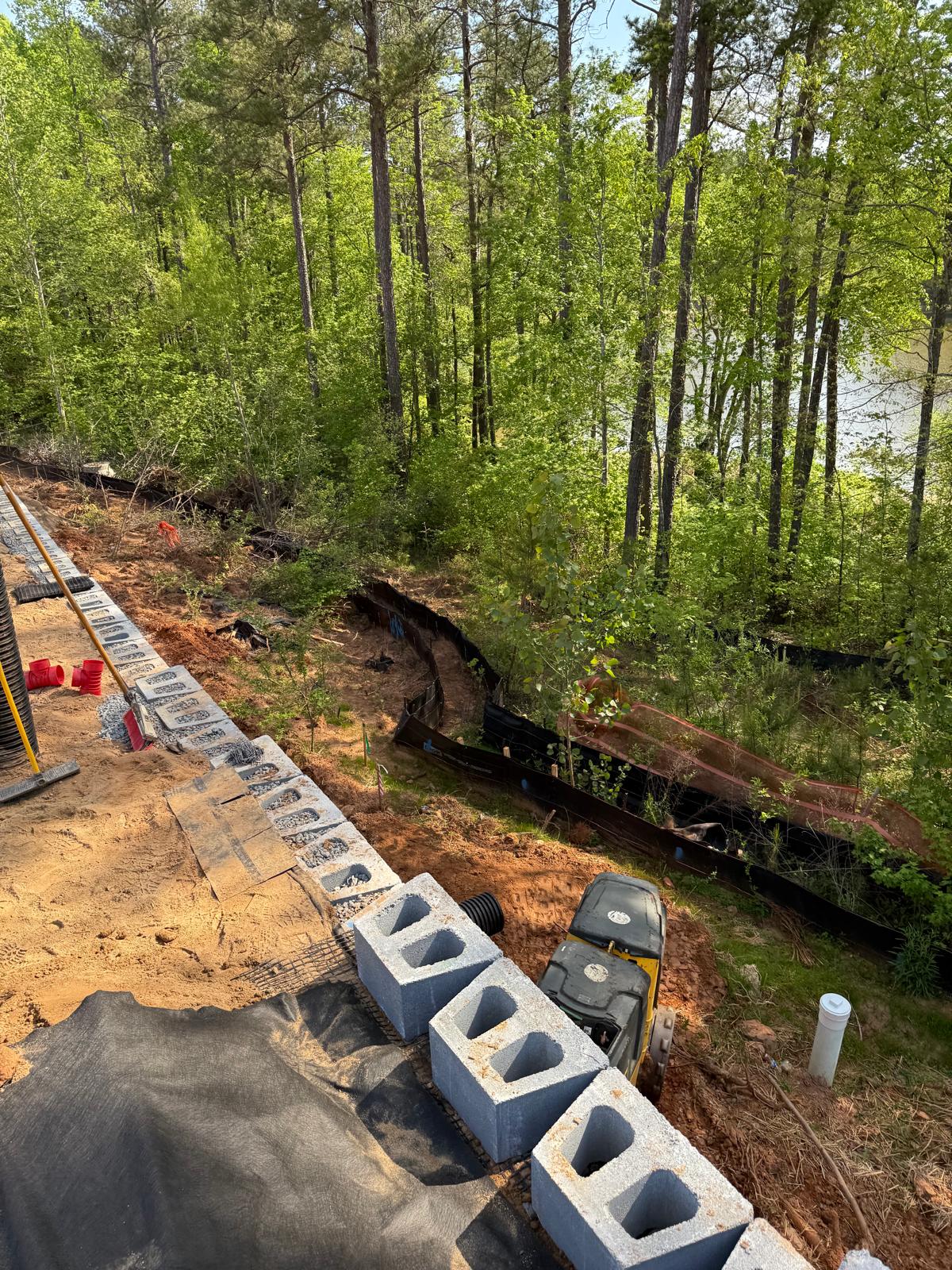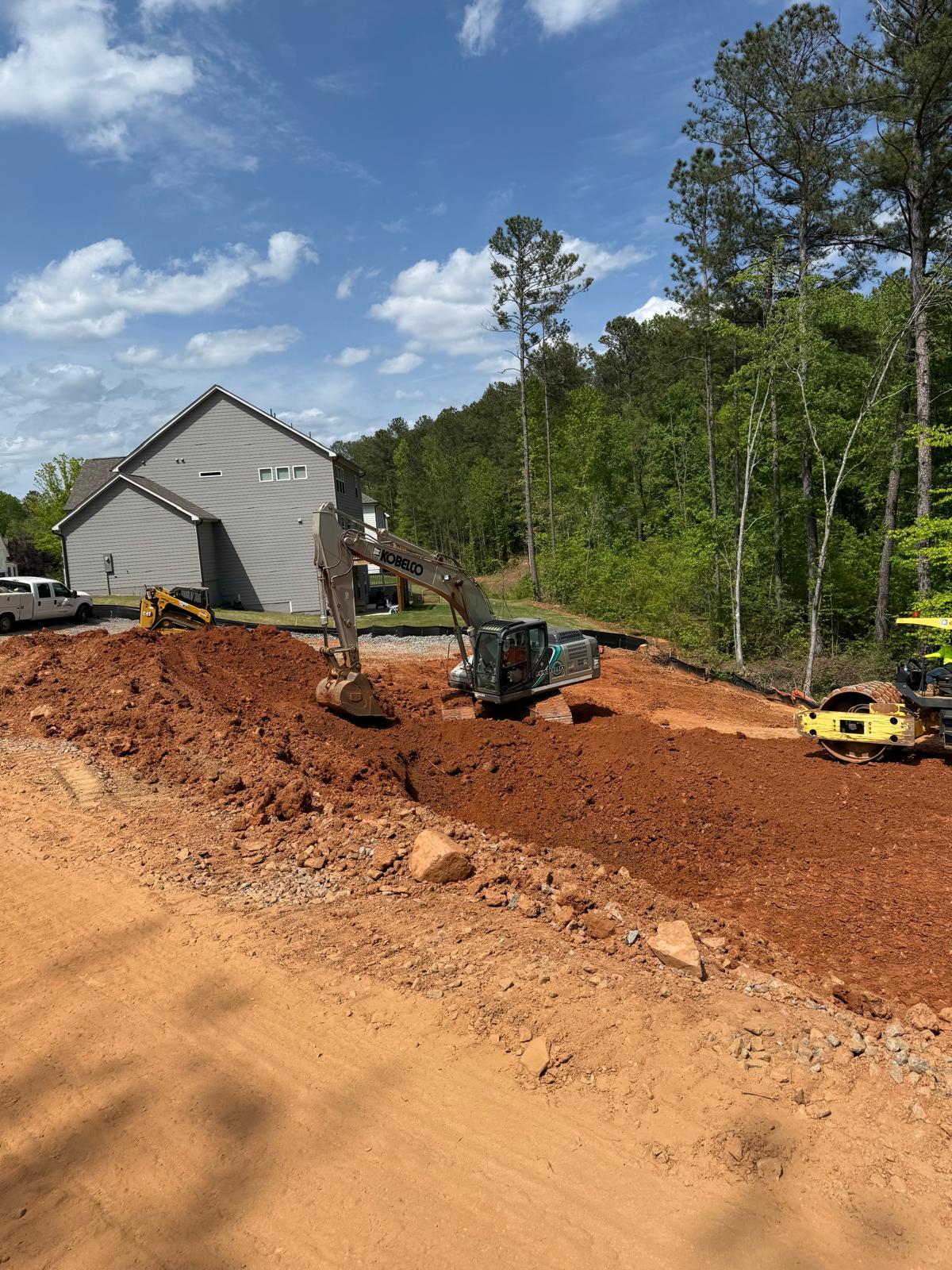 Focusing on backfilling and compaction operations behind the newly installing retaining wall structure along Lots #224–3229, Following the drainage installation, the next layer of backfill was placed over the previously installed geogrid reinforcement sheet, in preparation for subsequent compaction. Excavation and placement of fill material was conducted using a Kobelco 310LC excavator and transported on site with a CAT 750 dump truck. Subsequent to placement, two Takeuchi TL12R2 Bobcats were used to distribute the fill uniformly along Lots #224–3229. Once the fill was evenly spread, compaction was carried out using a Bomag BW211 sheep foot compactor roller.