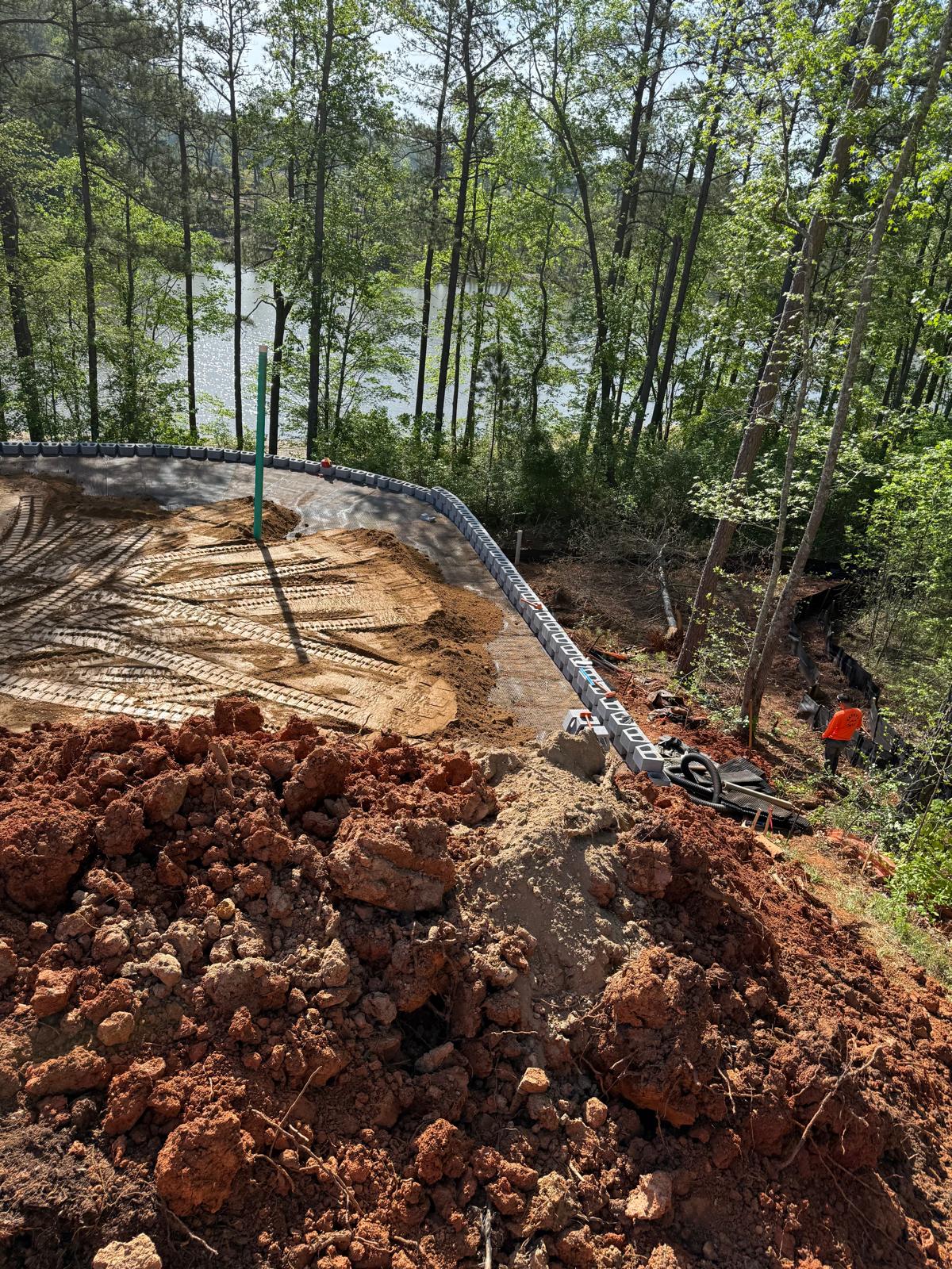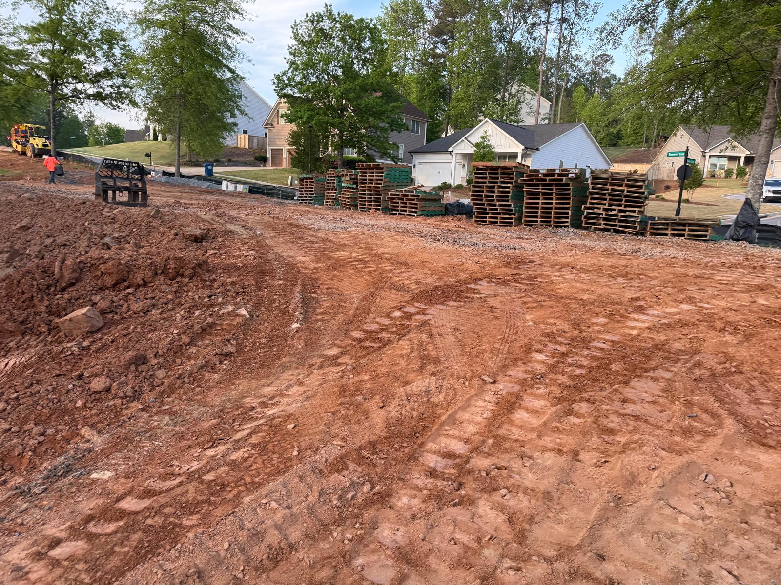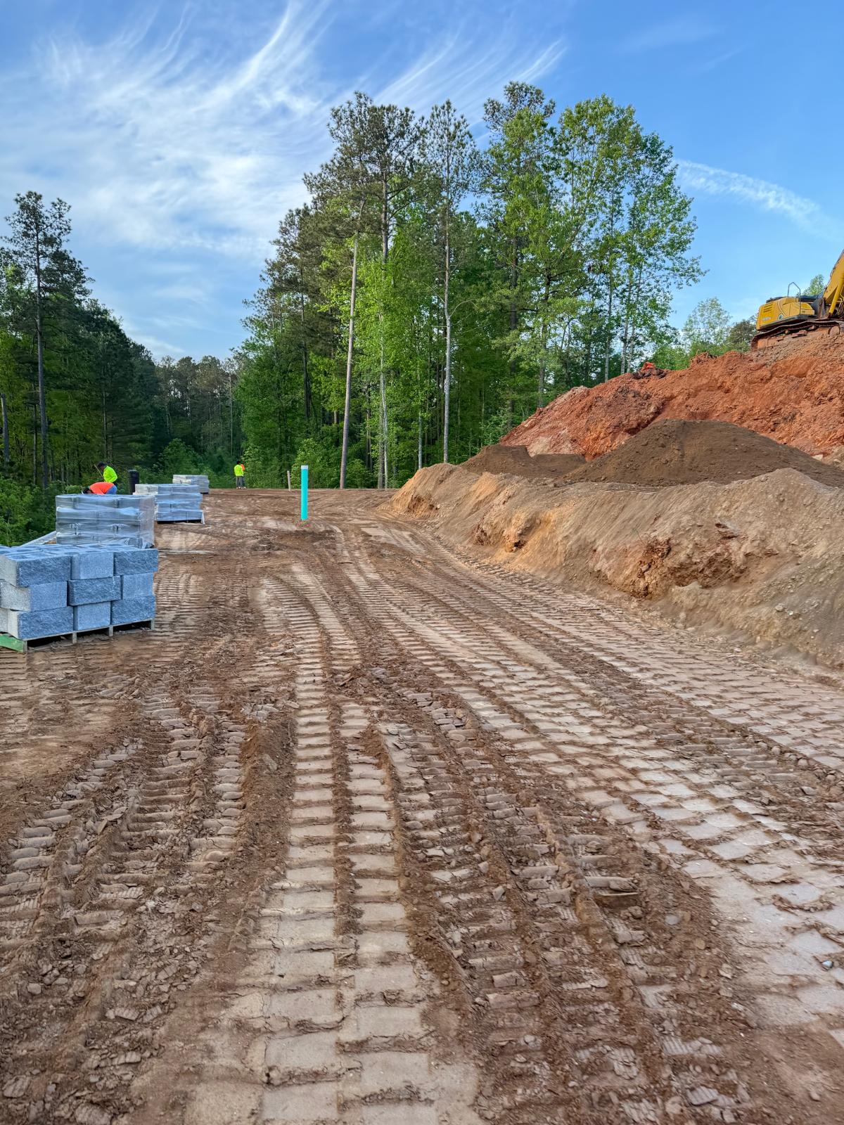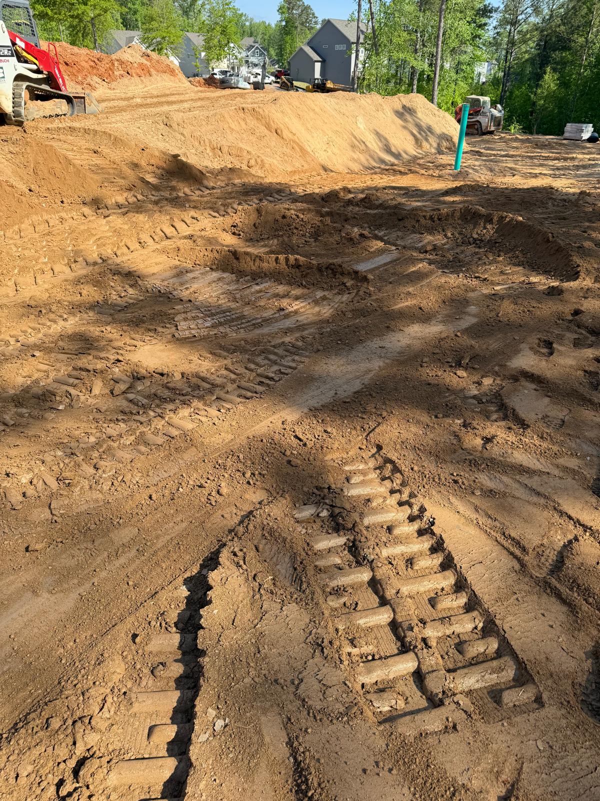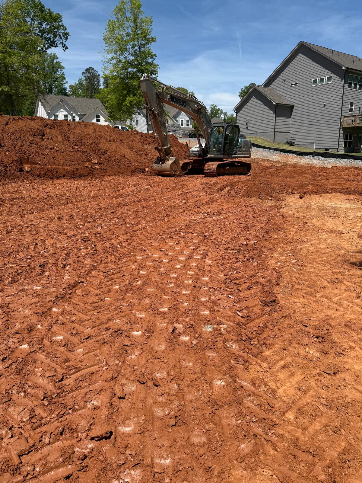 Focusing on backfilling and compaction operations behind the newly installing retaining wall structure along Lots #224–3229, Following the drainage installation, the next layer of backfill was placed over the previously installed geogrid reinforcement sheet, in preparation for subsequent compaction. Excavation and placement of fill material was conducted using a Kobelco 310LC excavator and transported on site with a CAT 750 dump truck. Subsequent to placement, two Takeuchi TL12R2 Bobcats were used to distribute the fill uniformly along Lots #224–3229. Once the fill was evenly spread, compaction was carried out using a Bomag BW211 sheep foot compactor roller.