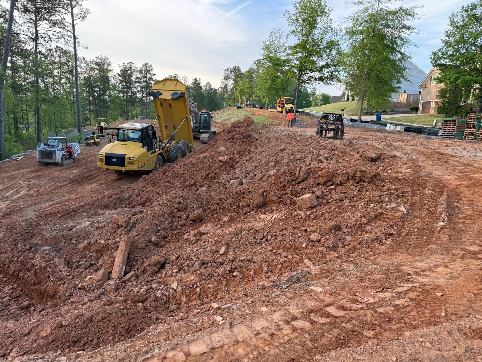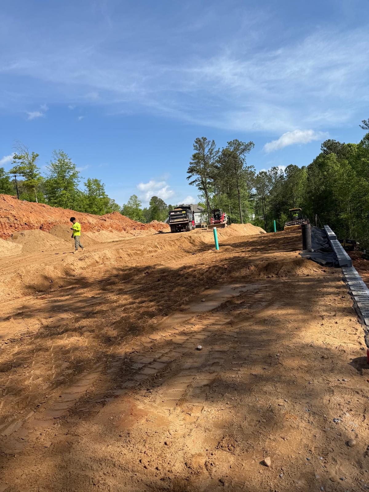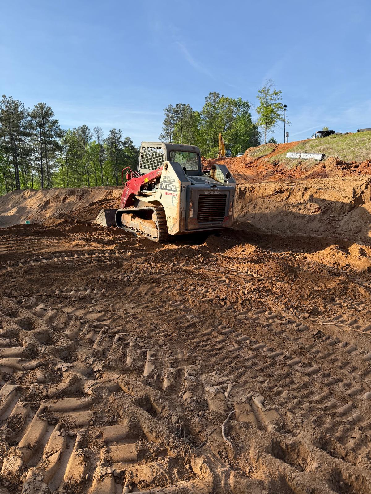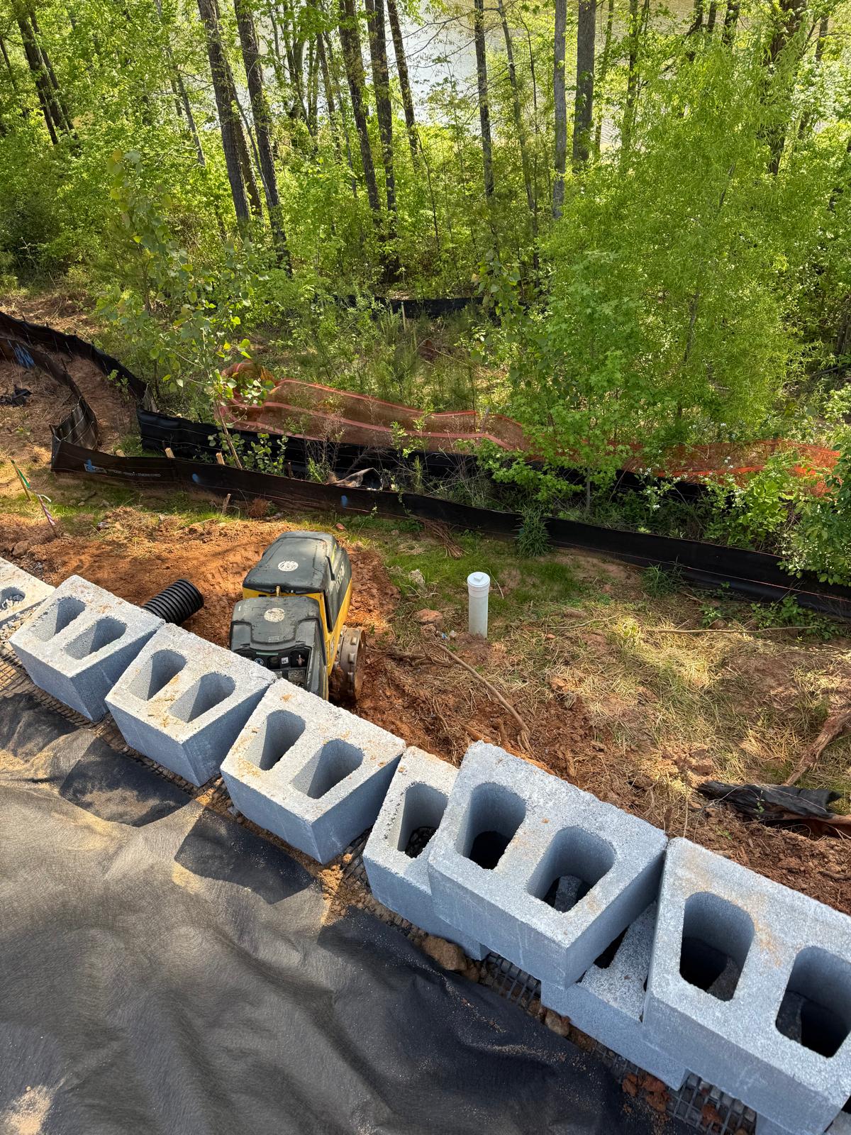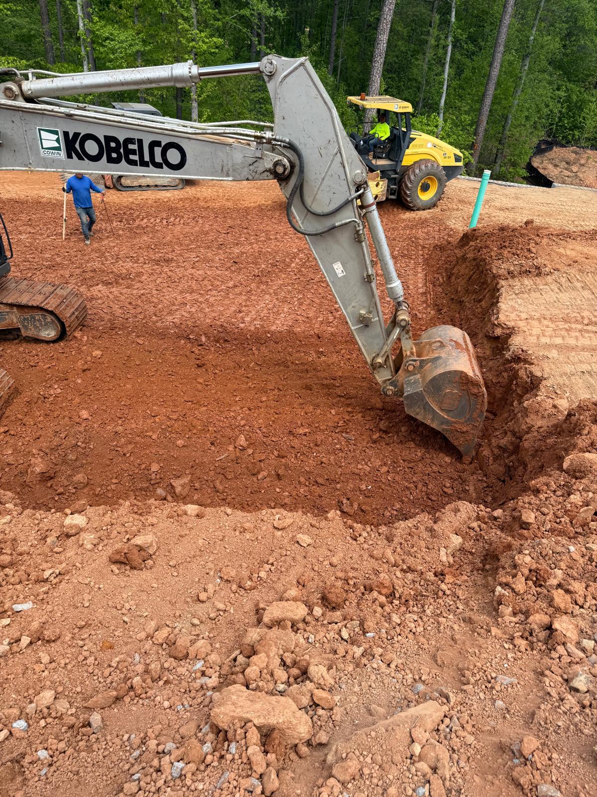 Focusing on backfilling and compaction operations behind the newly installing retaining wall structure along Lots #224–3229, Following the drainage installation, the next layer of backfill was placed over the previously installed geogrid reinforcement sheet, in preparation for subsequent compaction. Excavation and placement of fill material was conducted using a Kobelco 310LC excavator and transported on site with a CAT 750 dump truck. Subsequent to placement, two Takeuchi TL12R2 Bobcats were used to distribute the fill uniformly along Lots #224–3229. Once the fill was evenly spread, compaction was carried out using a Bomag BW211 sheep foot compactor roller.